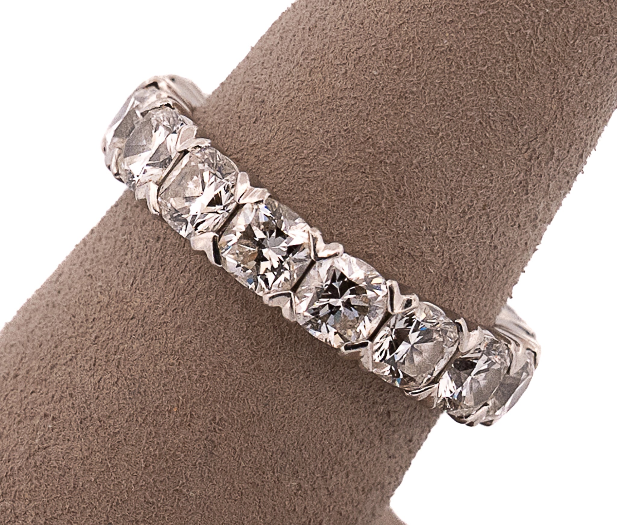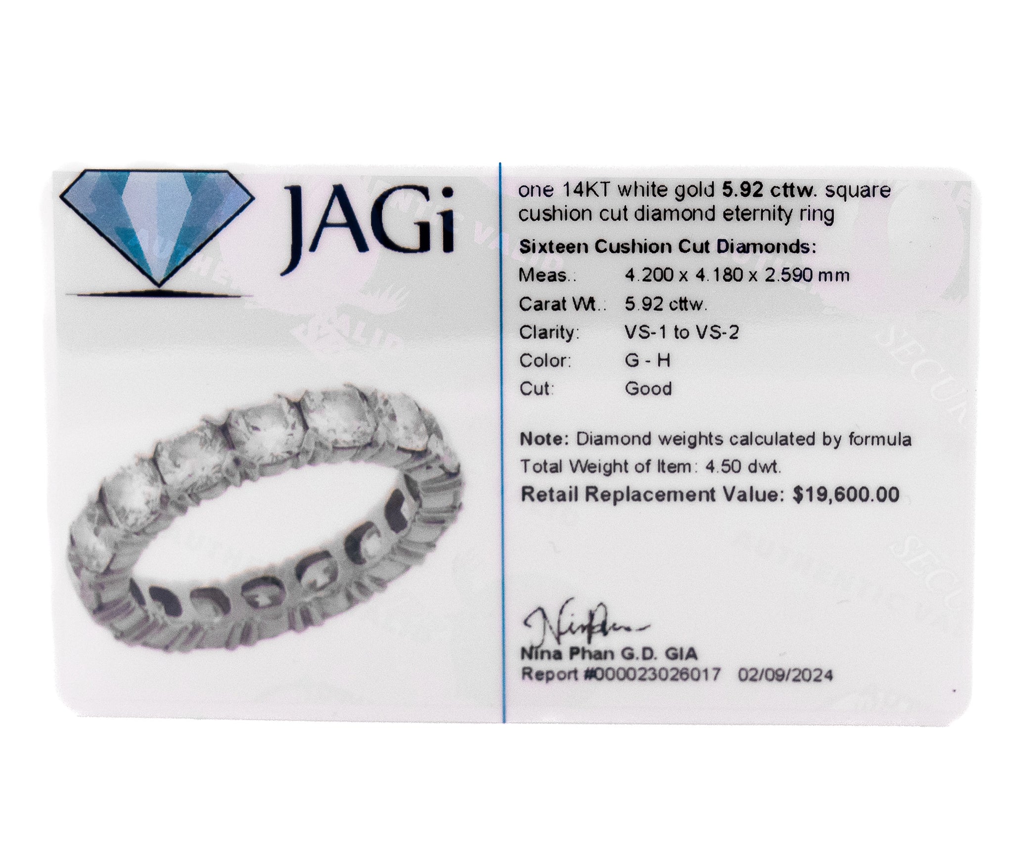 This 14KT Square Cushion Cut Diamond Eternity Band showcases a stunning array of square cushion-cut diamonds in an unbroken circle of brilliance. The 14KT gold setting enhances the beauty of each stone, creating a sophisticated and timeless piece. Designed for a perfect fit, this band is a symbol of enduring love and elegance.