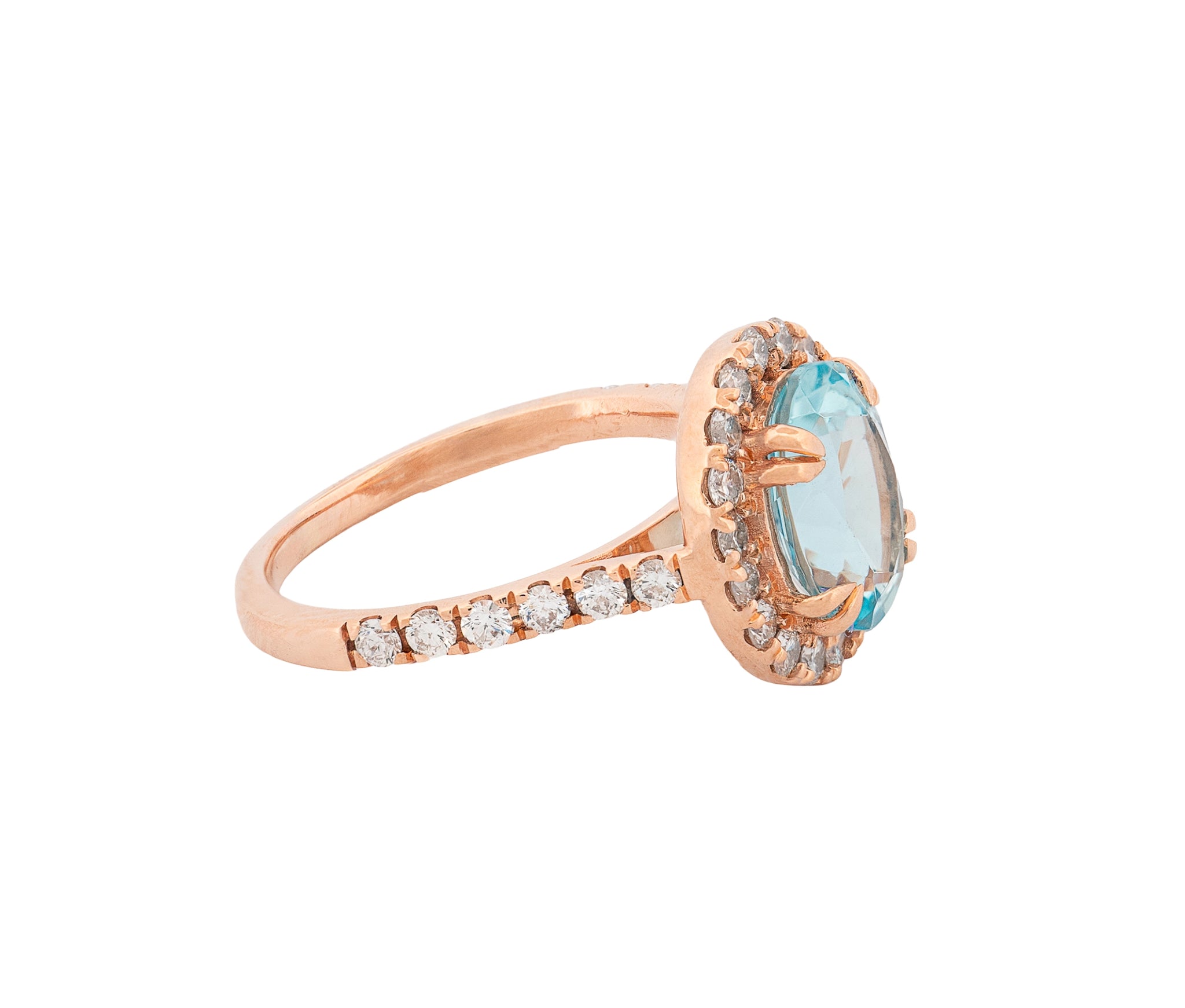 14KT rose gold diamond and aquamarine halo design ring featuring one oval cut aquamarine