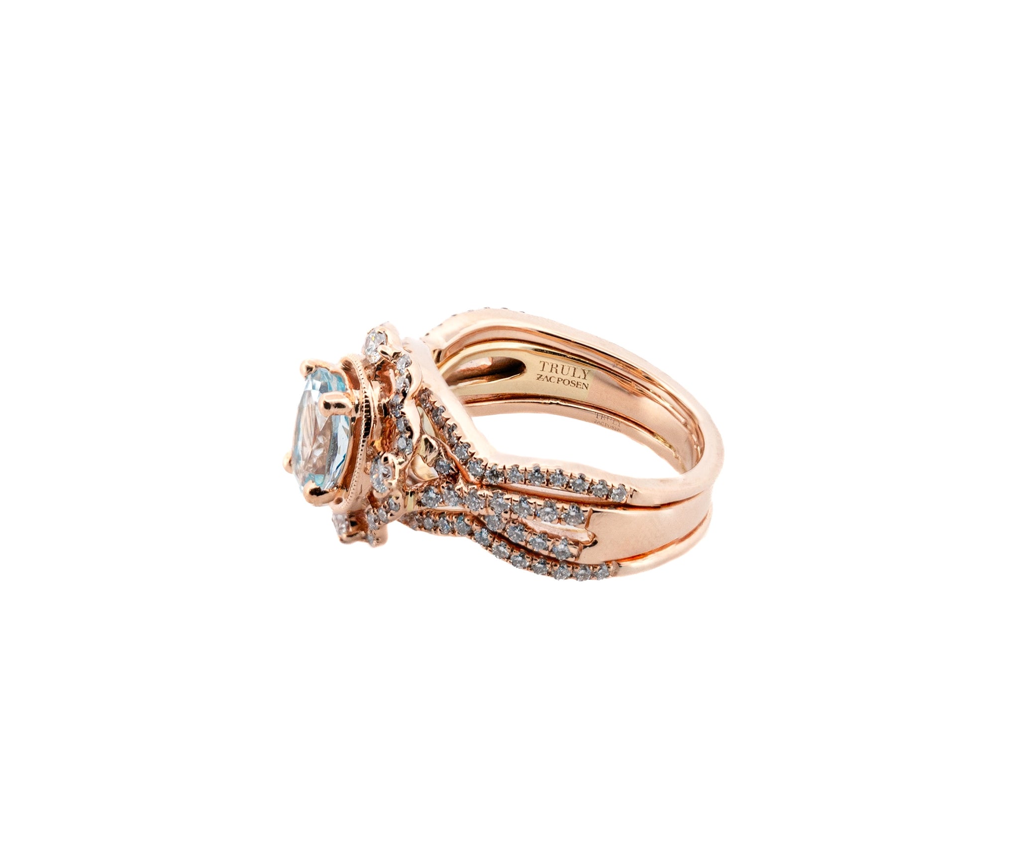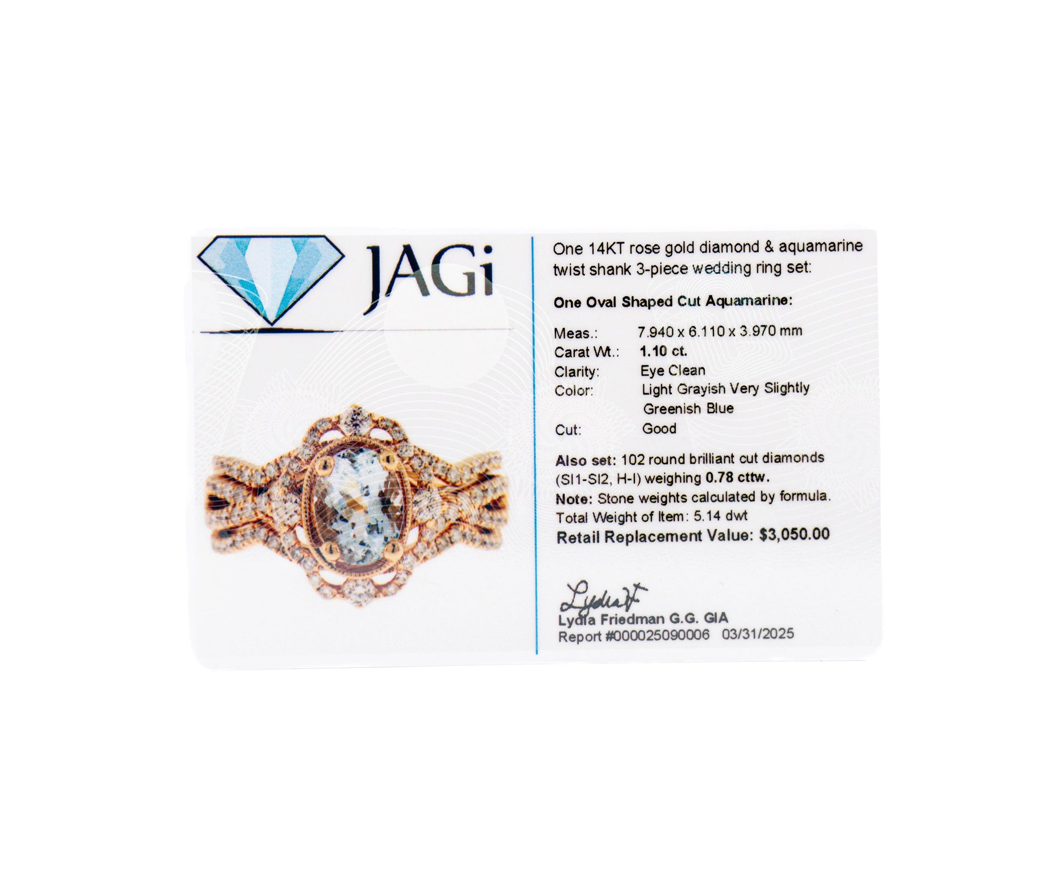 14K rose gold aquamarine and diamond soldered three-piece wedding ring set, featuring one 1.10 ct. aquamarine and 102 SI1-SI2, H-I round brilliant cut diamonds weighing 0.78 cttw. Ring is in an ornate twist shank style with milgrain edges.