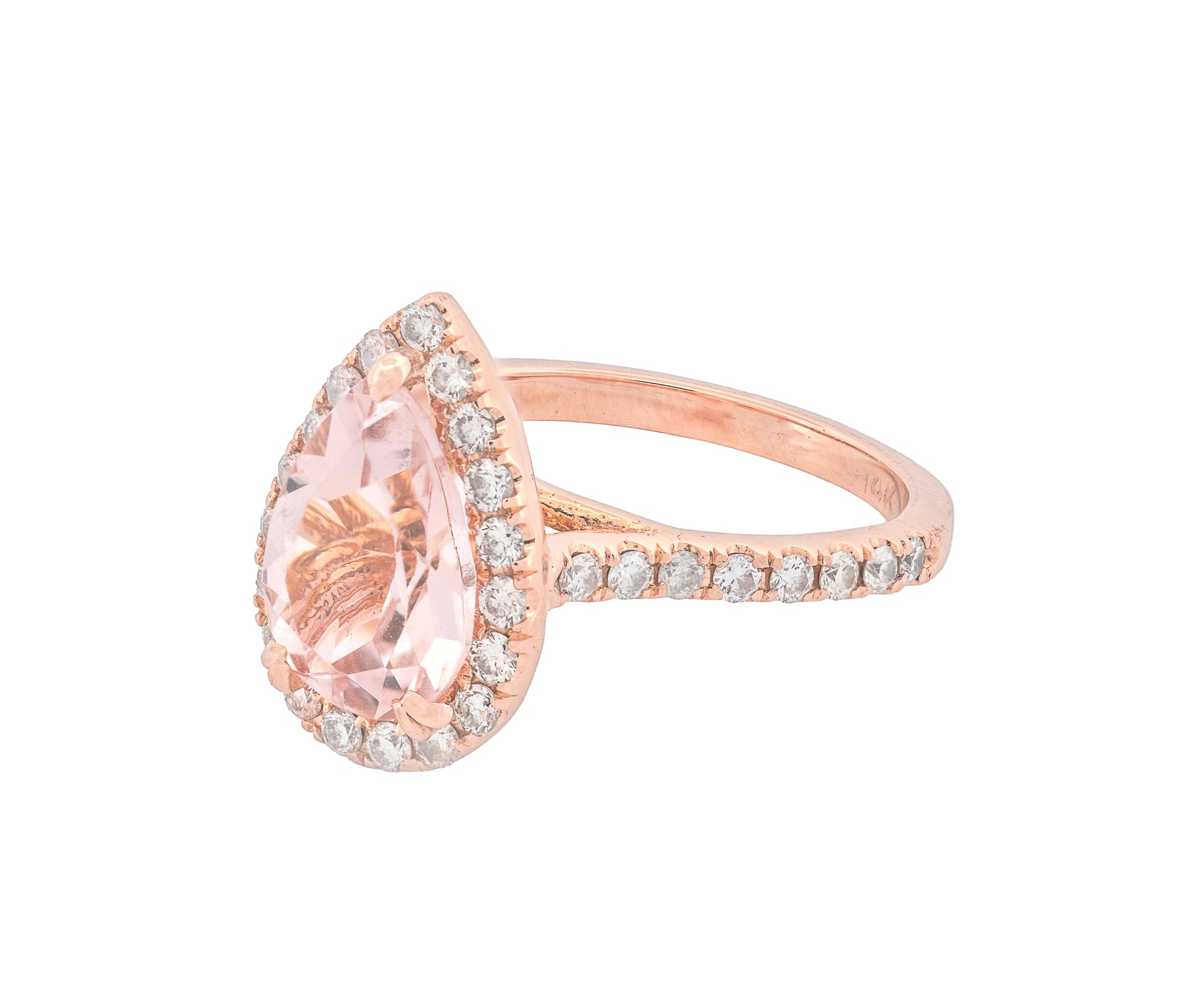 14K Rose Gold Morganite and Diamond Pear Shaped Halo Style Ring