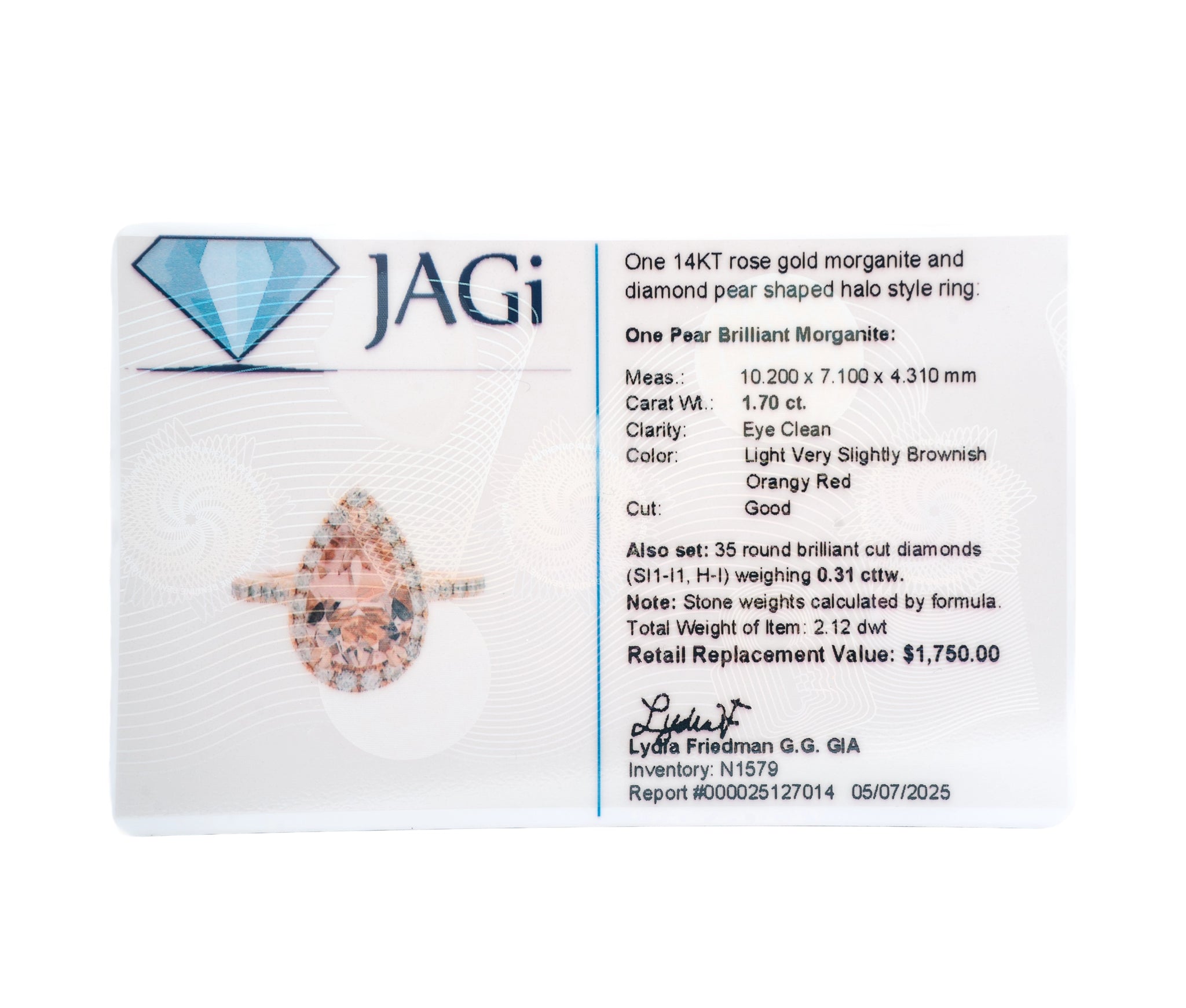 14KT rose gold halo style ring with a 1.70 ct.pear shaped morganite center and a halo with 35 round brilliant cut diamonds, SI1-I1 in clarity and H-I in color, weighing 0.31 cttw.