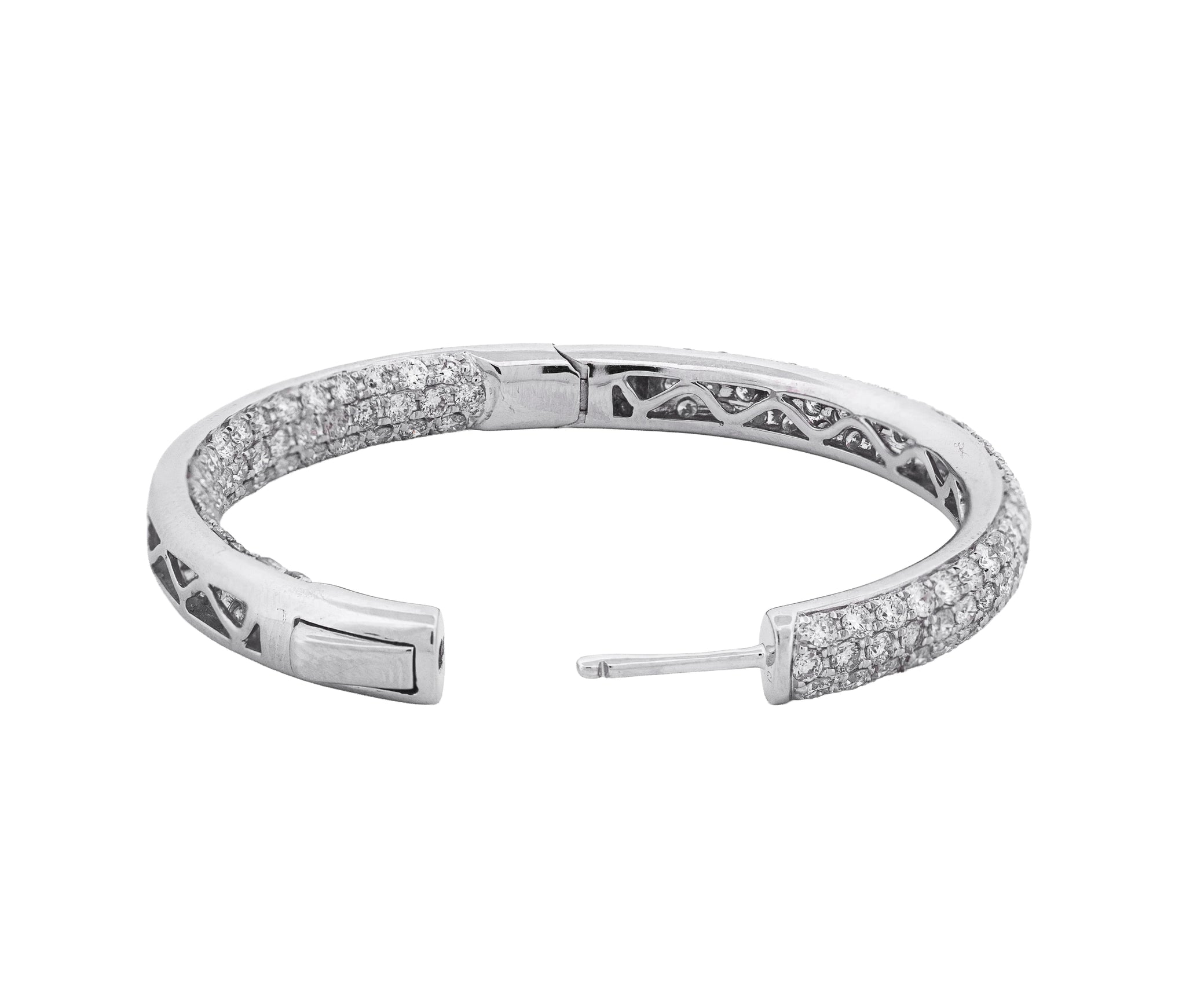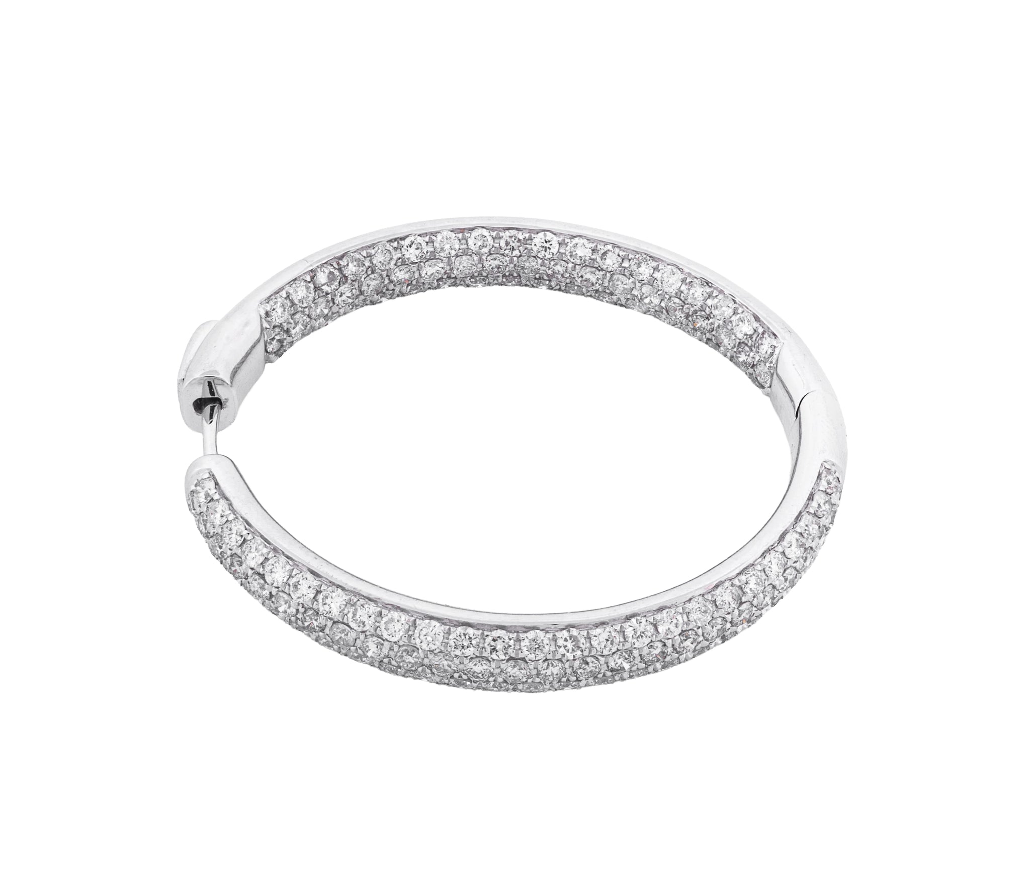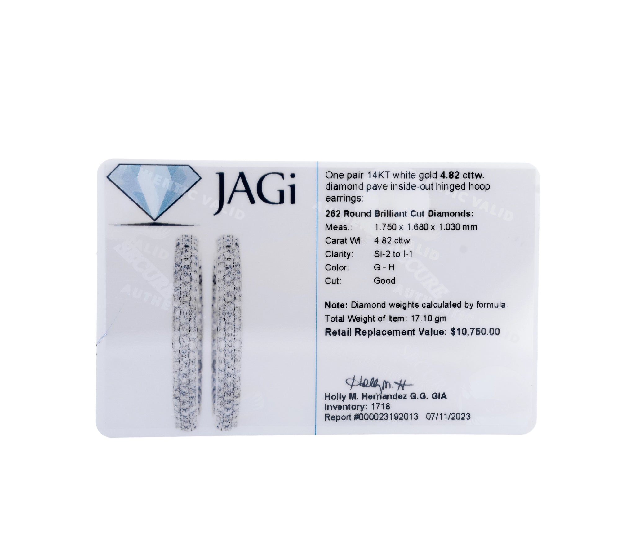 The 14K White Gold 4.82ct Diamond Hoop Earrings are a bold and luxurious statement piece, designed to captivate with their brilliance. Crafted from gleaming 14k white gold, these hoops are adorned with over 100+ stones totaling 4.82 carats of sparkling diamonds, meticulously set to enhance their radiance. Their elegant yet striking design makes them perfect for elevating evening looks or adding glamour to special occasions. These earrings are a testament to exceptional craftsmanship and timeless sophistication.