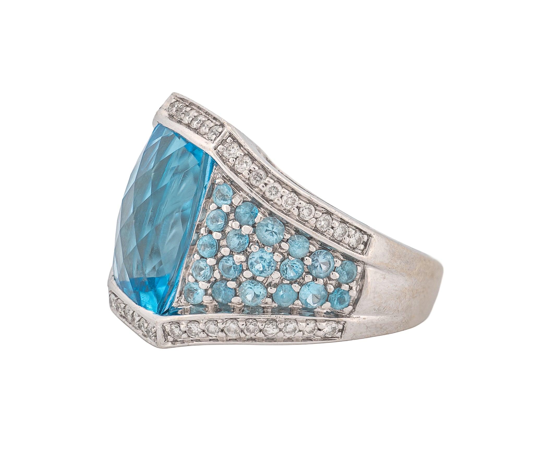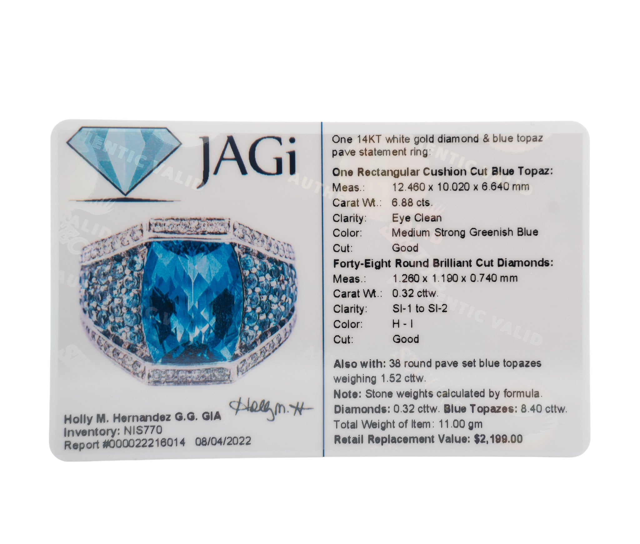 Bold and captivating, this 14K white gold statement ring features a stunning rectangular cushion-cut blue topaz weighing 6.88 carats, displaying a vivid medium strong greenish-blue hue with eye-clean clarity and exceptional brilliance. The center stone is surrounded by 48 round brilliant-cut diamonds totaling 0.32 carats (graded SI1–SI2 clarity, H–I color), along with an additional 38 round pavé-set blue topazes weighing 1.52 carats, creating a dazzling gradient of sparkle and color. Weighing 11.00 grams, this piece combines modern glamour with luxurious craftsmanship.