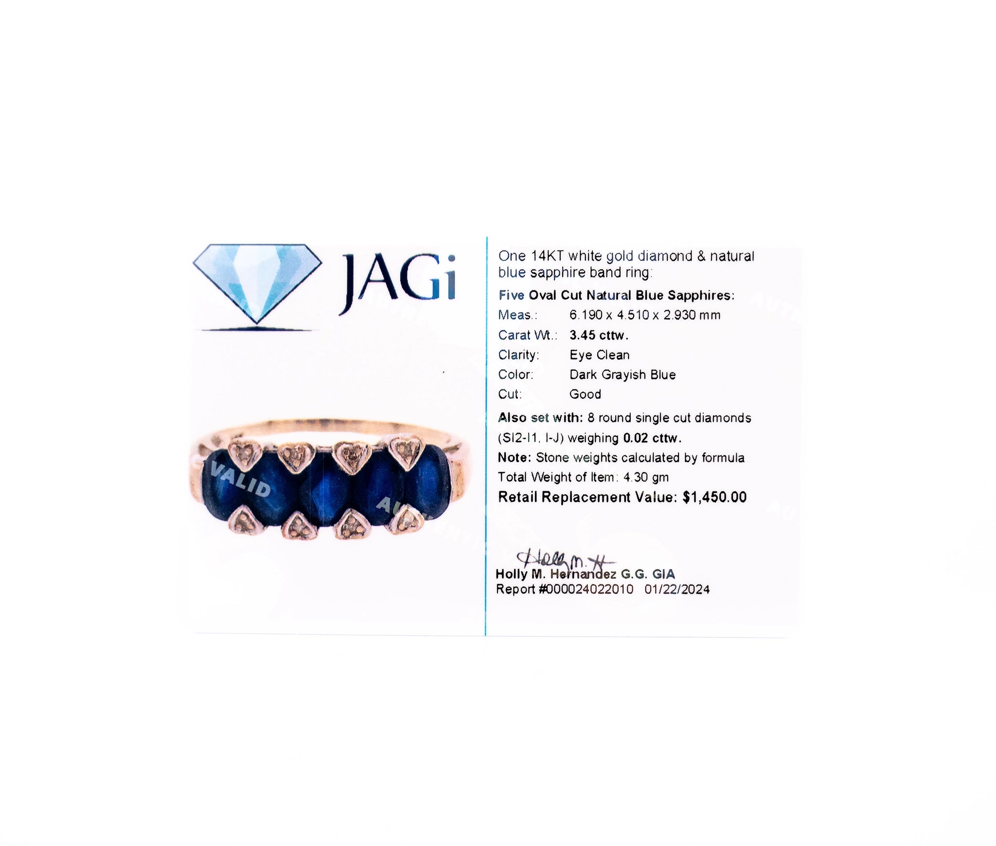 Elevate your style with this exquisite 14k white gold band featuring stunning oval-shaped natural sapphires as the focal point, complemented by eight sparkling diamonds. The sapphire weighs between 3.01 to 5.0 carats and is beautifully accented by a total of .02 carats of diamonds. The diamonds exhibit I-J color and SI2-I1 clarity, adding a touch of sophistication to this elegant piece. Perfect for those who appreciate fine jewelry crafted with attention to detail and quality materials.