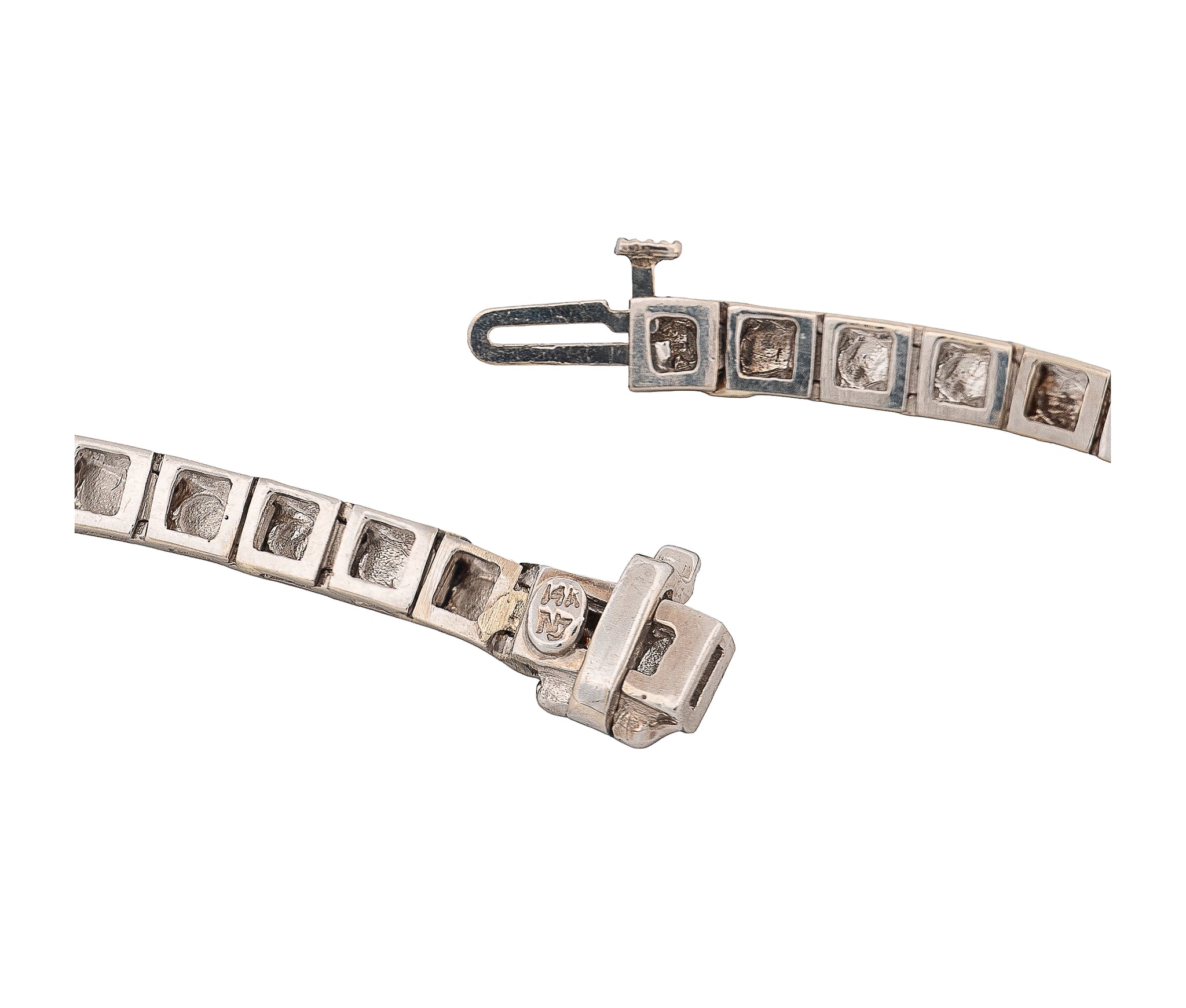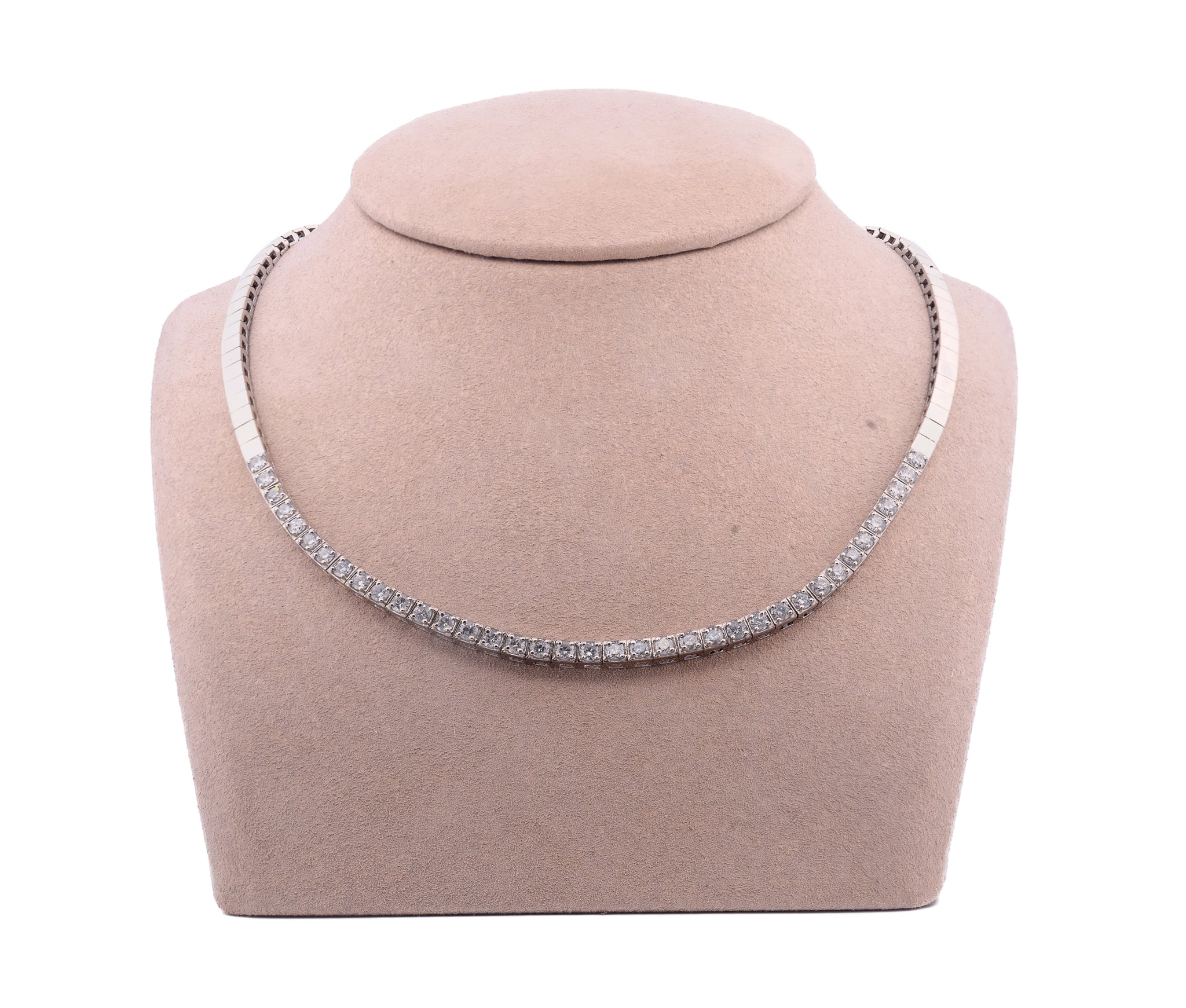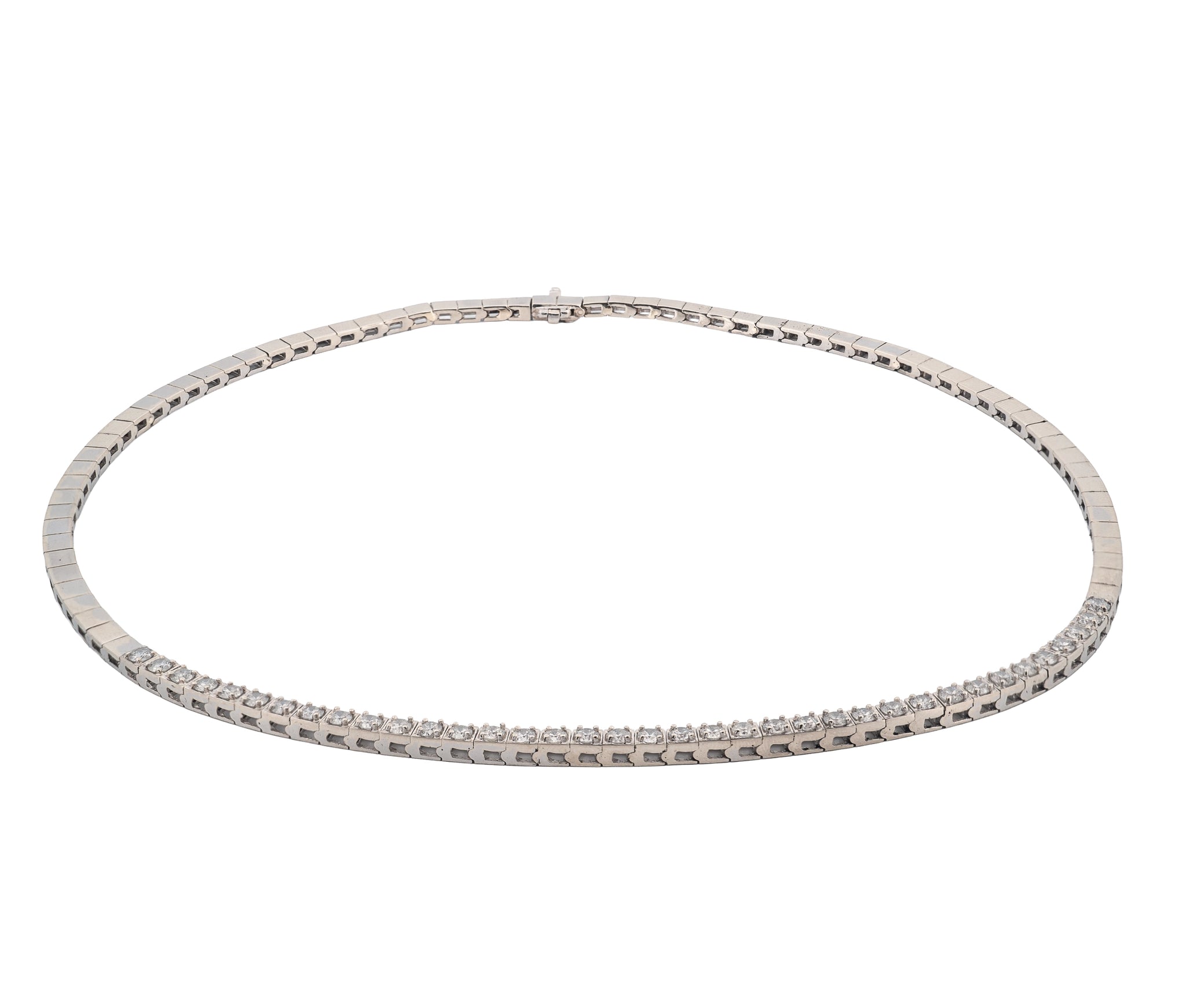 Elevate your look with this captivating 14K White Gold Diamond Half Eternity Necklace. Designed with refined elegance, the necklace features 37 sparkling round brilliant diamonds totaling 2.96 carats. The diamonds, graded G color and I1 clarity, deliver impressive shine and sophistication. Crafted in sleek white gold and weighing 19.7 dwt, this necklace measures 17 inches in length, offering a perfect balance of luxury and everyday versatility. A timeless design ideal for layering or worn as a radiant statement on its own.