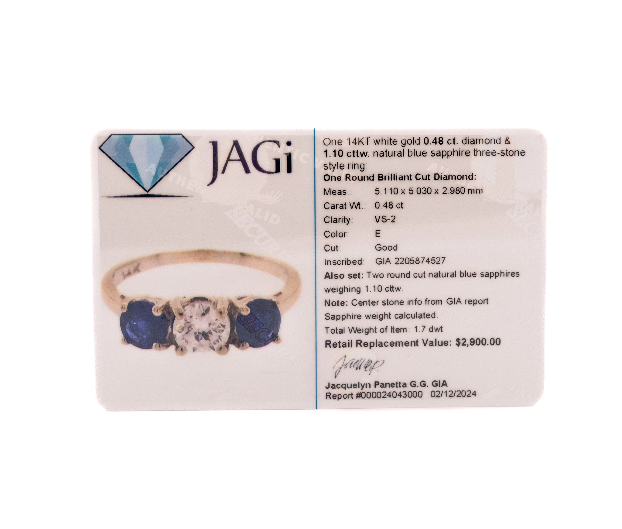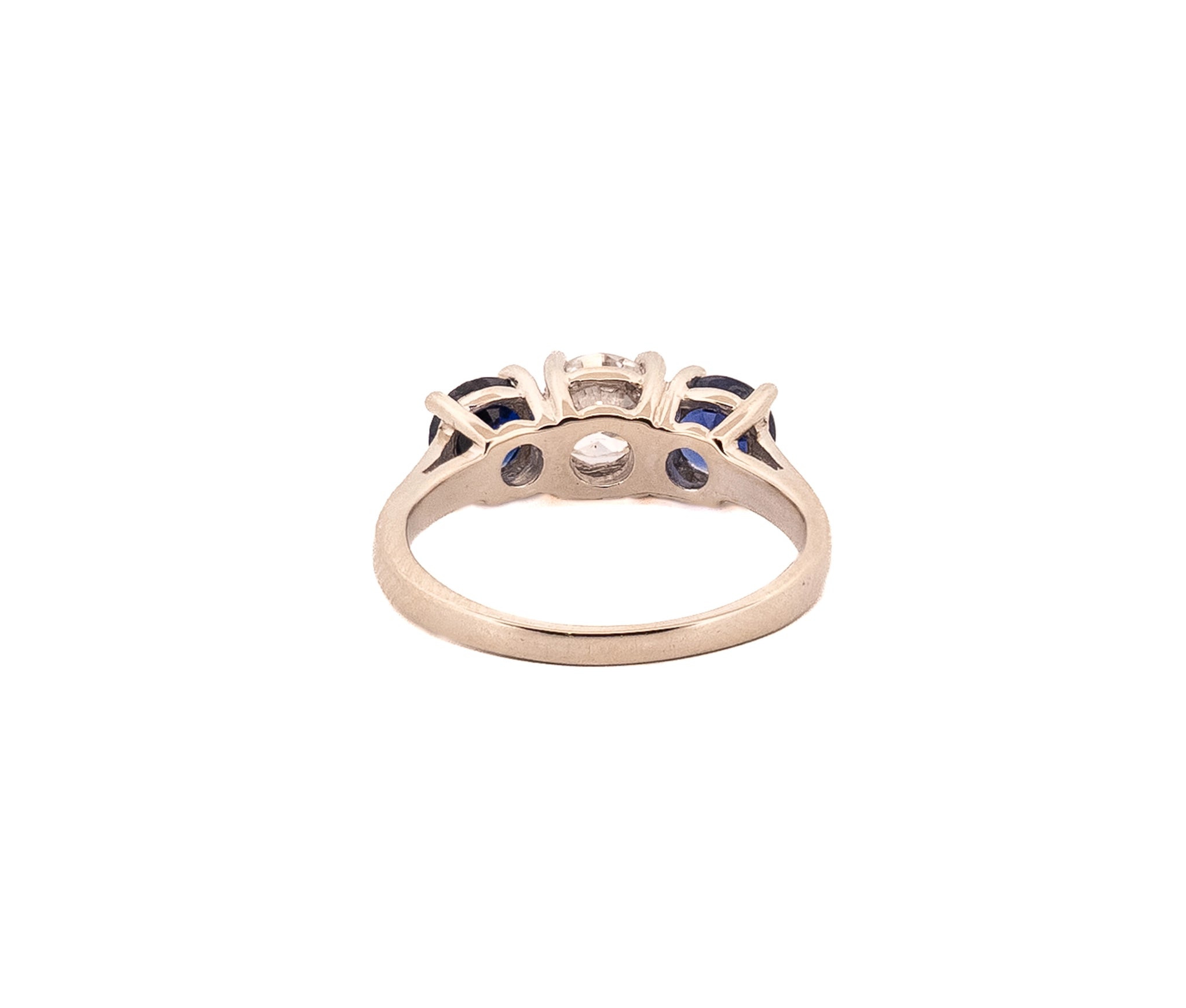14K White Gold Diamond & Natural Sapphire Three-Stone Ring