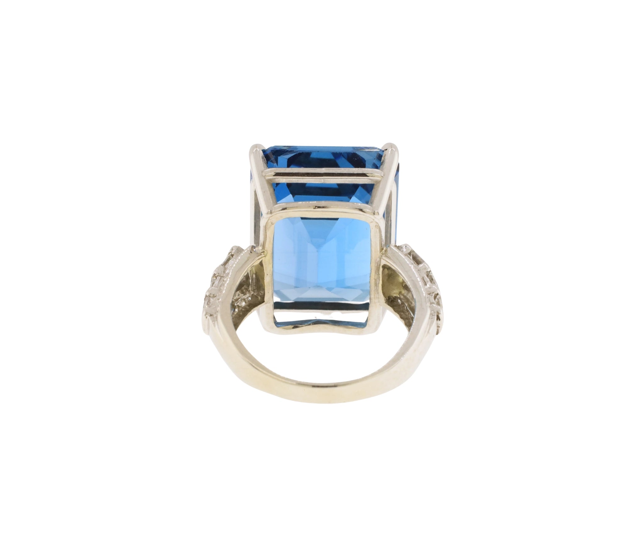 14KT white gold London blue topaz and diamond statement ring featuring an emerald cut London blue topaz weighing 26.67 ct. along with 18 baguette cut & 28 single cut diamonds (SI2-I2, G-H) weighing 0.75 cttw.