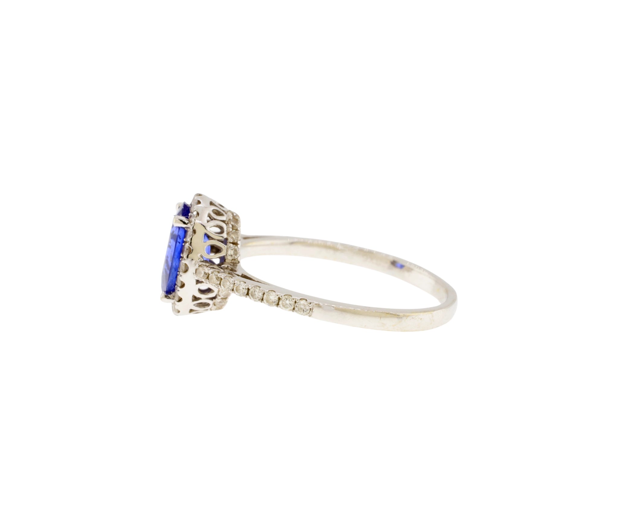 14KT white gold natural blue sapphire and diamond halo style ring featuring one oval cut natural blue sapphire weighing 1.38 ct. and 50 round brilliant cut SI1-SI2, H-J natural diamonds weighing 0.32 cttw.