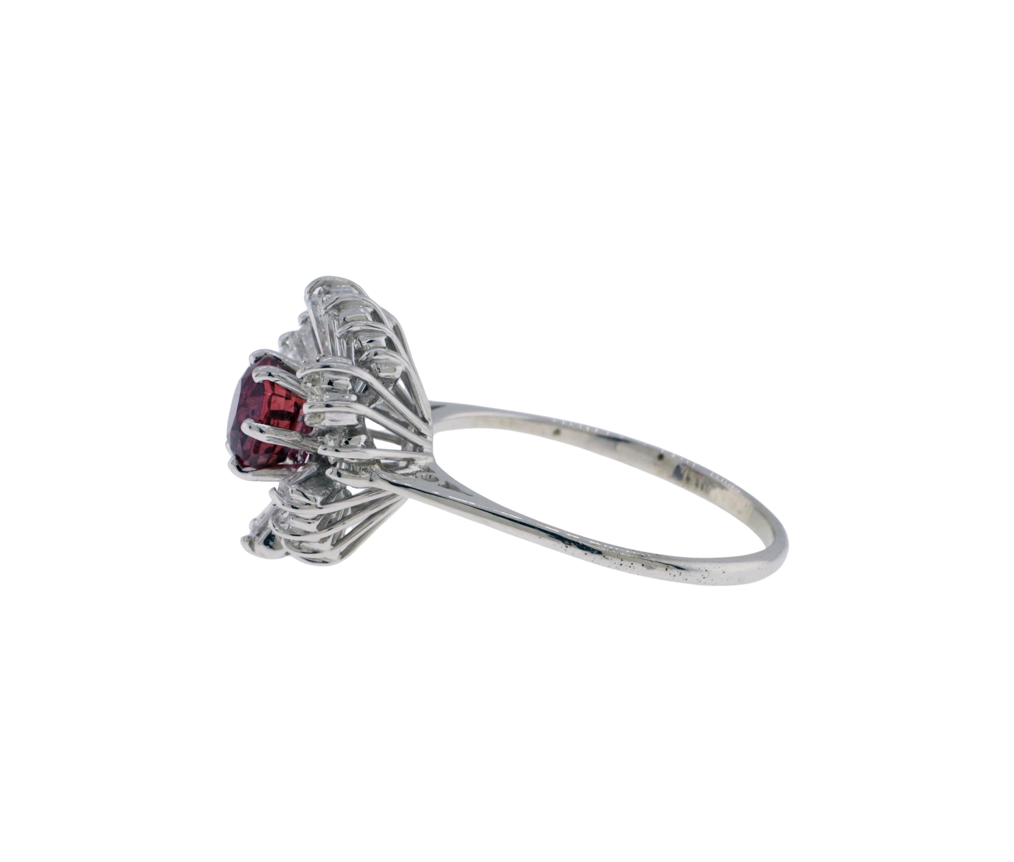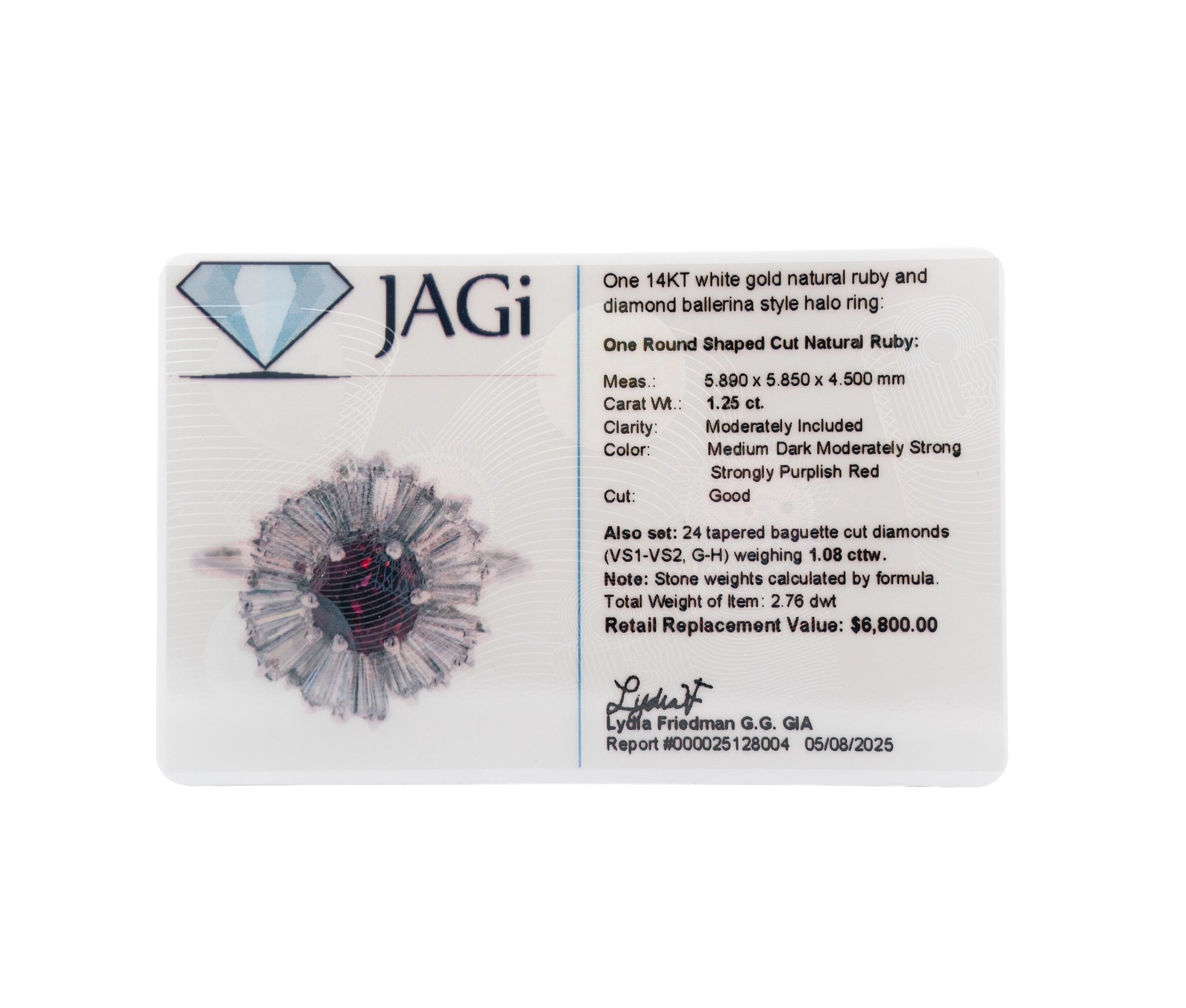 14KT white gold ballerina style halo ring, with 1.25 ct. natural ruby at center. Halo is made up of 24 tapered baguette cut white diamonds, VS in clarity and G-H in color, weighing 1.08 cttw.