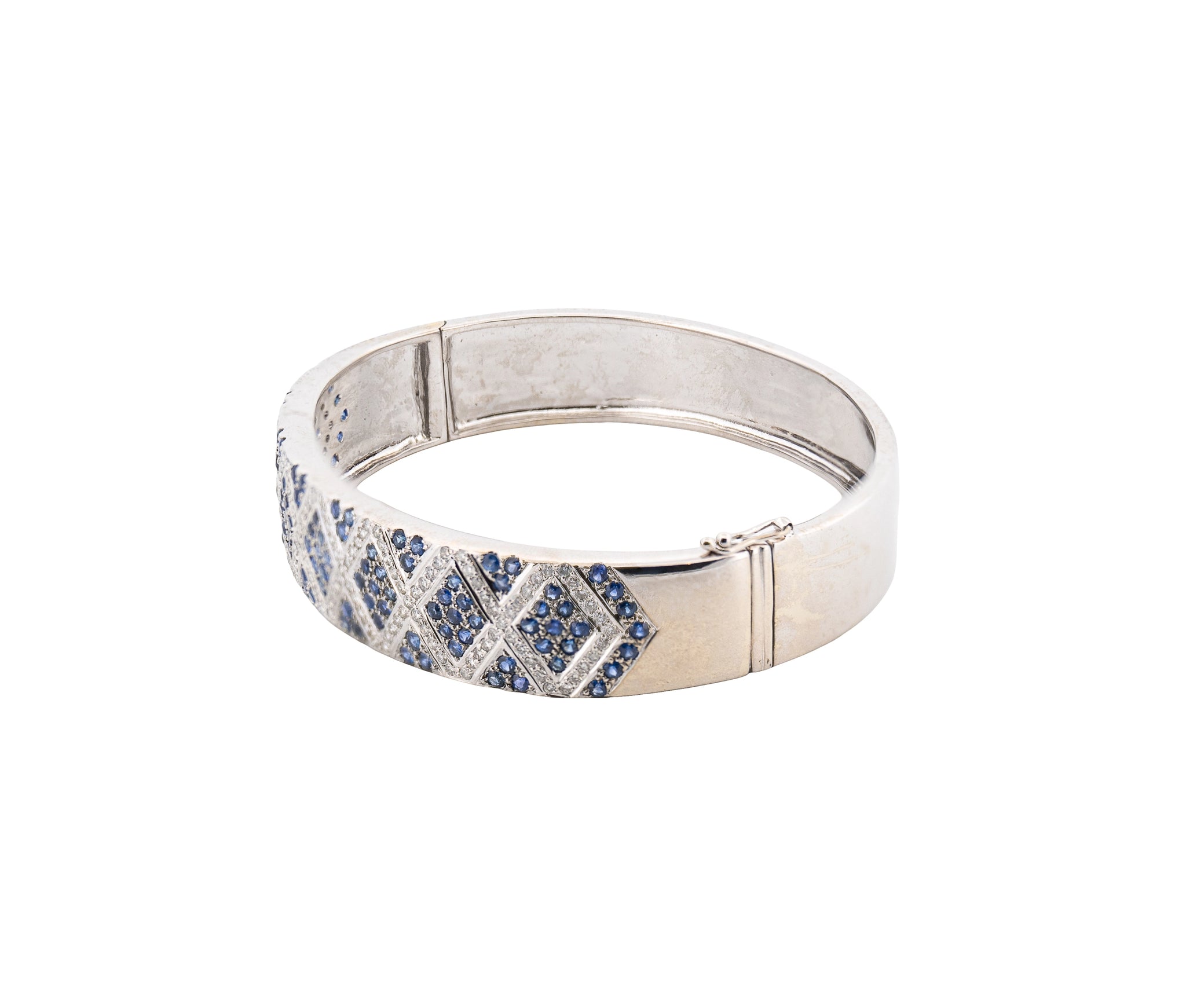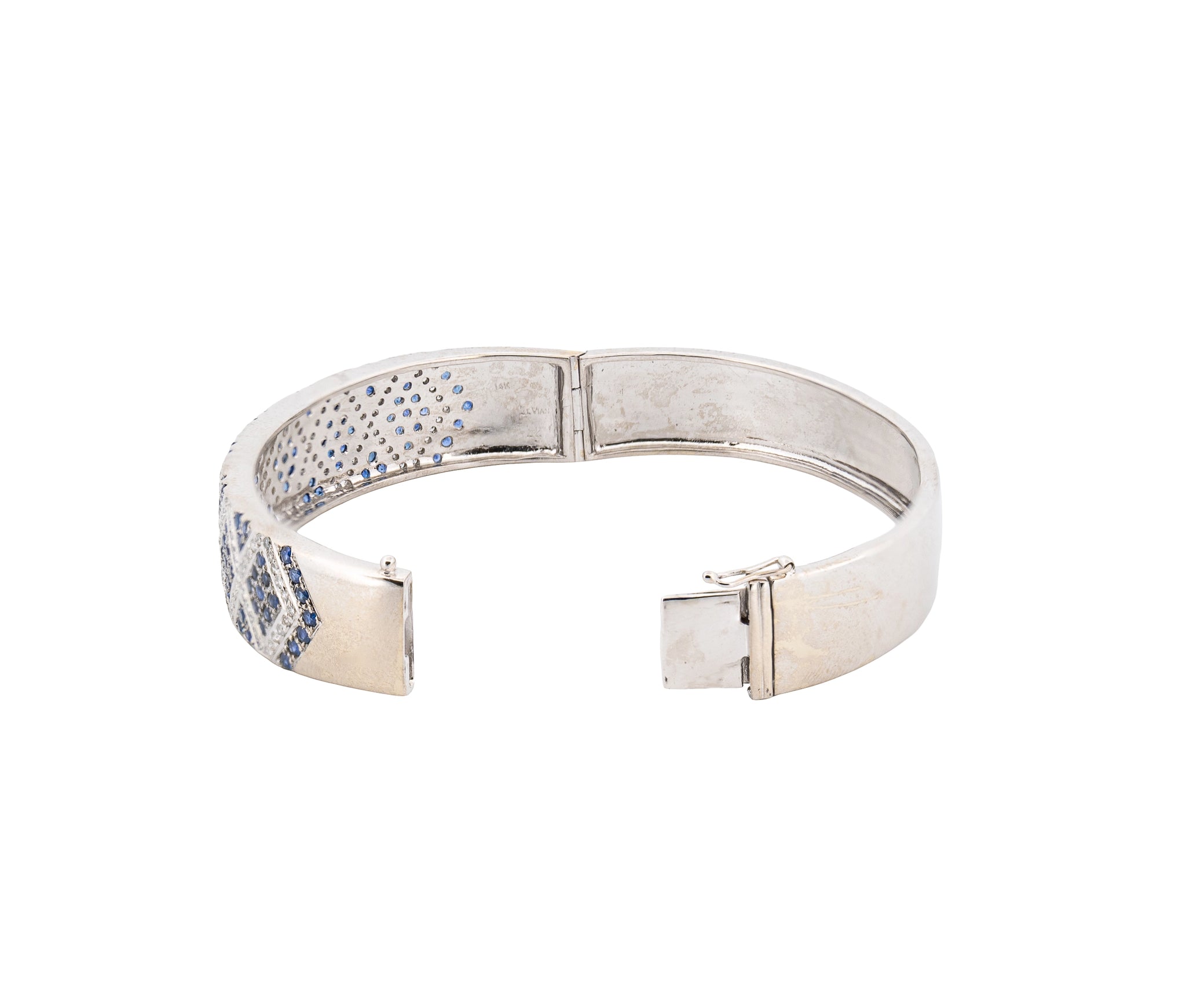 This elegant bracelet showcases a timeless combination of deep blue sapphires and sparkling diamonds set in 14KT white gold. Each rich, oval-cut sapphire is accented by shimmering round brilliant-cut diamonds, creating a striking contrast and refined brilliance. The sleek white gold setting enhances the vivid hue of the gemstones, while the secure clasp ensures a comfortable and confident fit. Perfect for special occasions or as a luxurious everyday accessory, this bracelet adds a touch of classic sophistication to any jewelry collection.