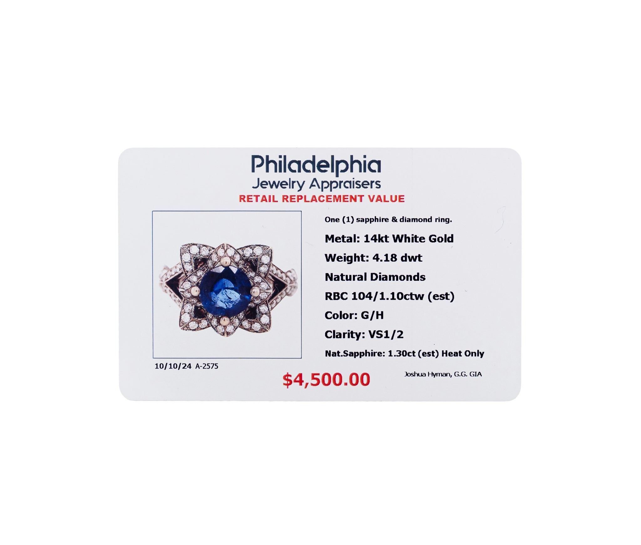 Elegant and timeless, this 14KT white gold ring features a captivating deep blue sapphire as its centerpiece, beautifully accented by shimmering round-cut diamonds. The sleek white gold band enhances the brilliance of each stone, creating a luxurious contrast and refined sparkle. Perfect for special occasions or everyday sophistication, this ring embodies classic beauty and modern grace.