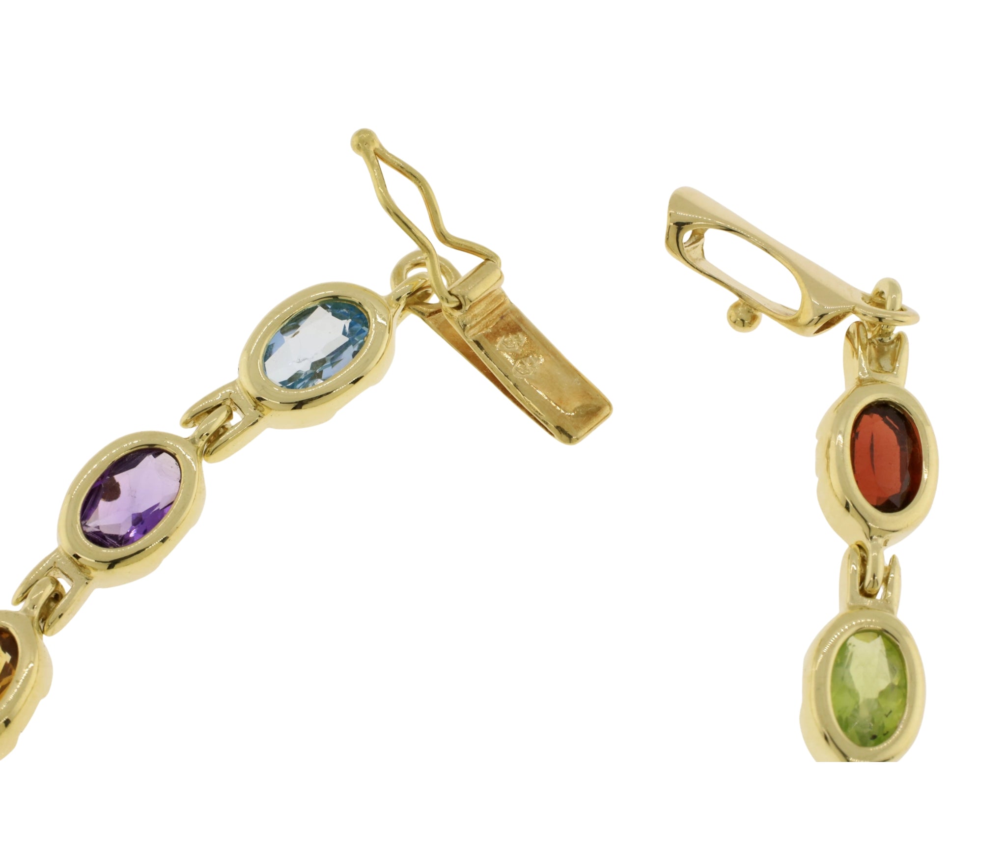 14K yellow gold bezel set multi gemstone link bracelet with 3 oval blue topazes weighing 1.17 cttw., 3 oval garnets weighing 1.23 cttw., 3 oval amethysts weighing 0.87 cttw., 3 oval peridots weighing 1.02 cttw. & 3 oval citrines weighing 0.84 cttw.