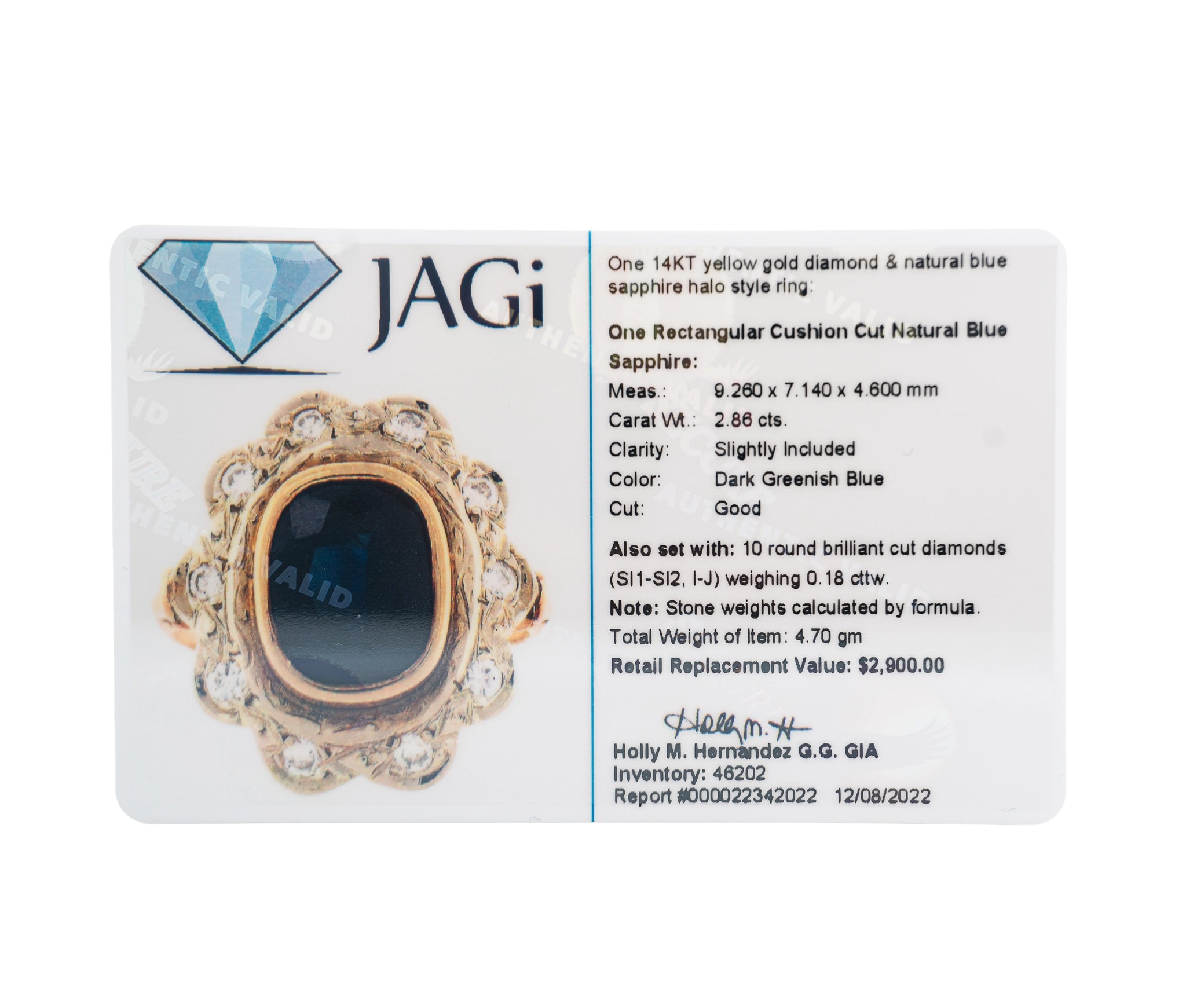 Elegant 14K yellow gold ring featuring a natural rectangular cushion-cut blue sapphire weighing approximately 2.86 carats, surrounded by 10 round brilliant-cut diamonds totaling 0.18 cttw (SI1–SI2, I–J). The sapphire displays a rich dark greenish-blue hue and is beautifully complemented by the diamond halo. Total ring weight is 4.70 grams. Comes with a JAGi appraisal dated 12/08/2022 with a $2,900 retail replacement value. A timeless gemstone ring—authenticated and ready to wear.