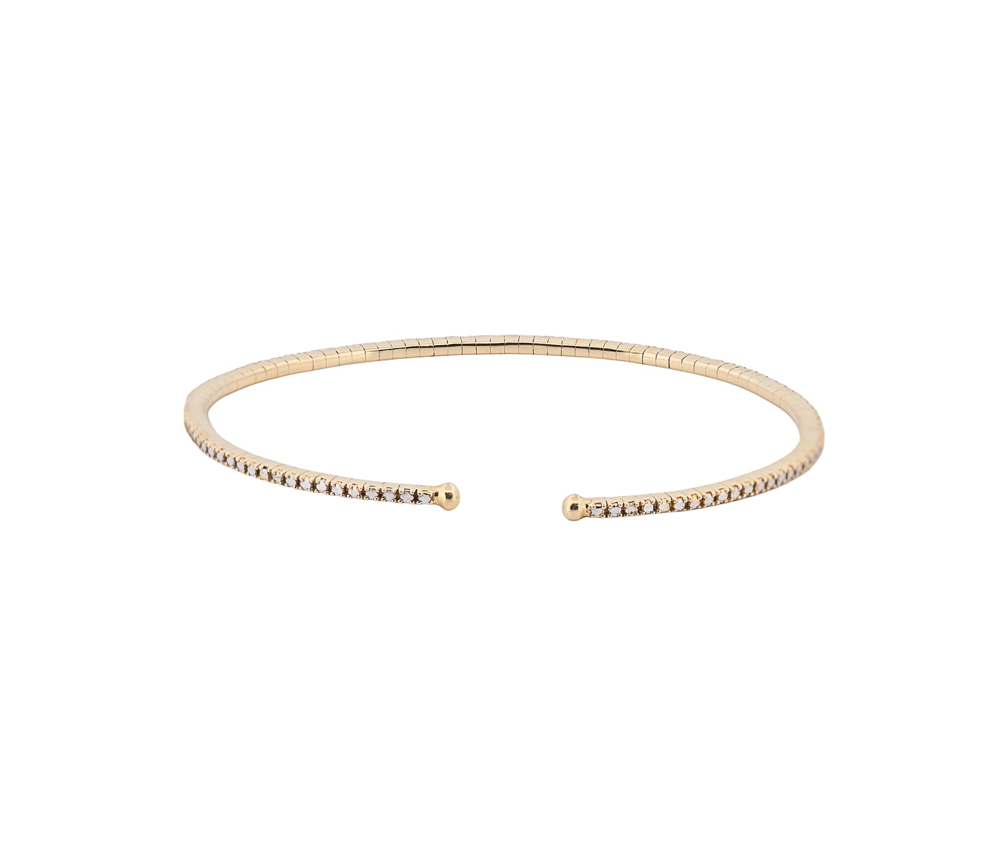 Elegant and bold, this 14K yellow gold cuff bracelet showcases a sleek, modern design adorned with dazzling diamonds. The open cuff silhouette offers a comfortable fit, while the shimmering diamond accents add a touch of luxury and brilliance. A perfect statement piece for elevating any look.