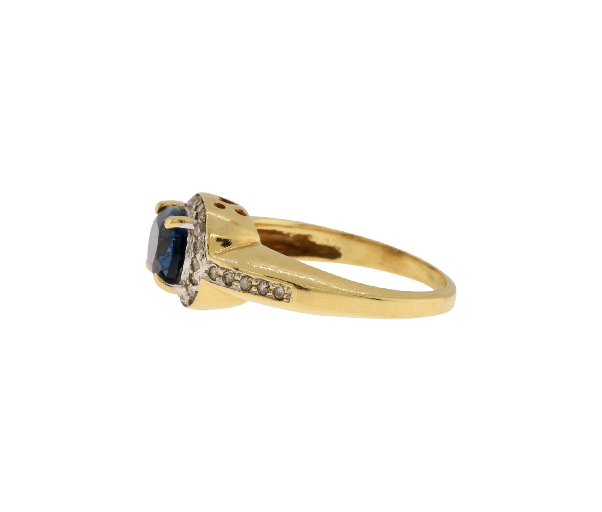14KT yellow and white gold east/west set London blue topaz and diamond halo ring with one blue topaz weighing 2.21 ct. and 30 round brilliant cut SI1-SI2, J-K natural diamonds weighing 0.21 cttw.
