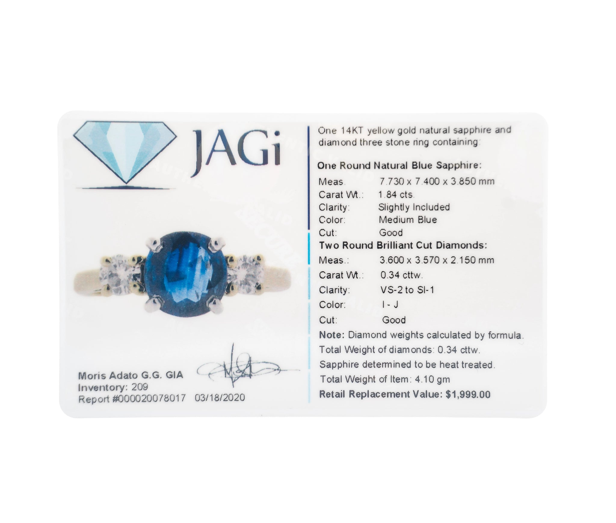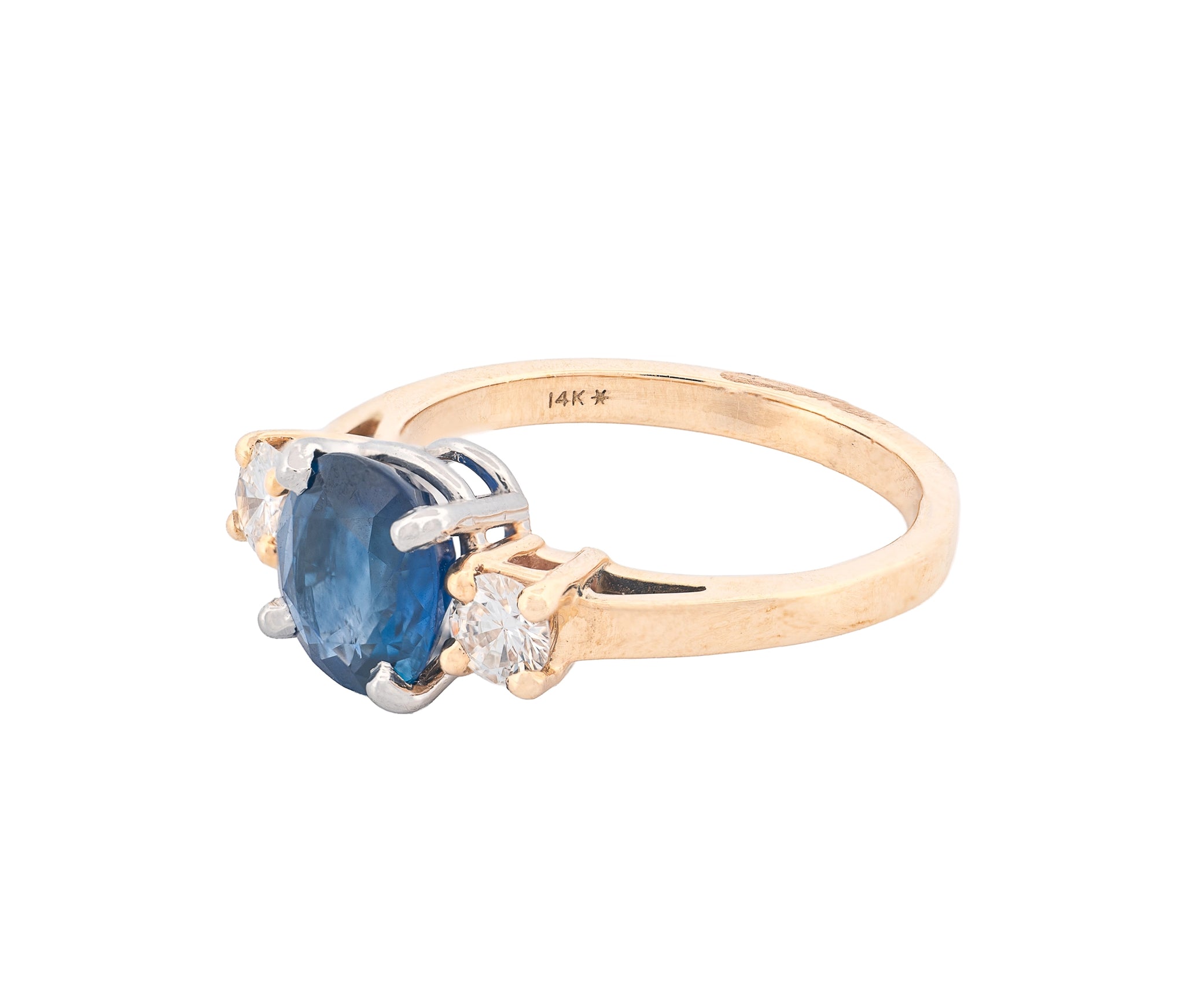 Elegant and timeless, this stunning three-stone ring features a natural oval-cut blue sapphire weighing 1.84 carats, displaying a rich medium-blue hue with slight inclusions that enhance its natural character. Flanking the sapphire are two round brilliant-cut diamonds totaling 0.34 carats, graded VS2–SI1 clarity and I–J color, adding brilliance and balance to the design.