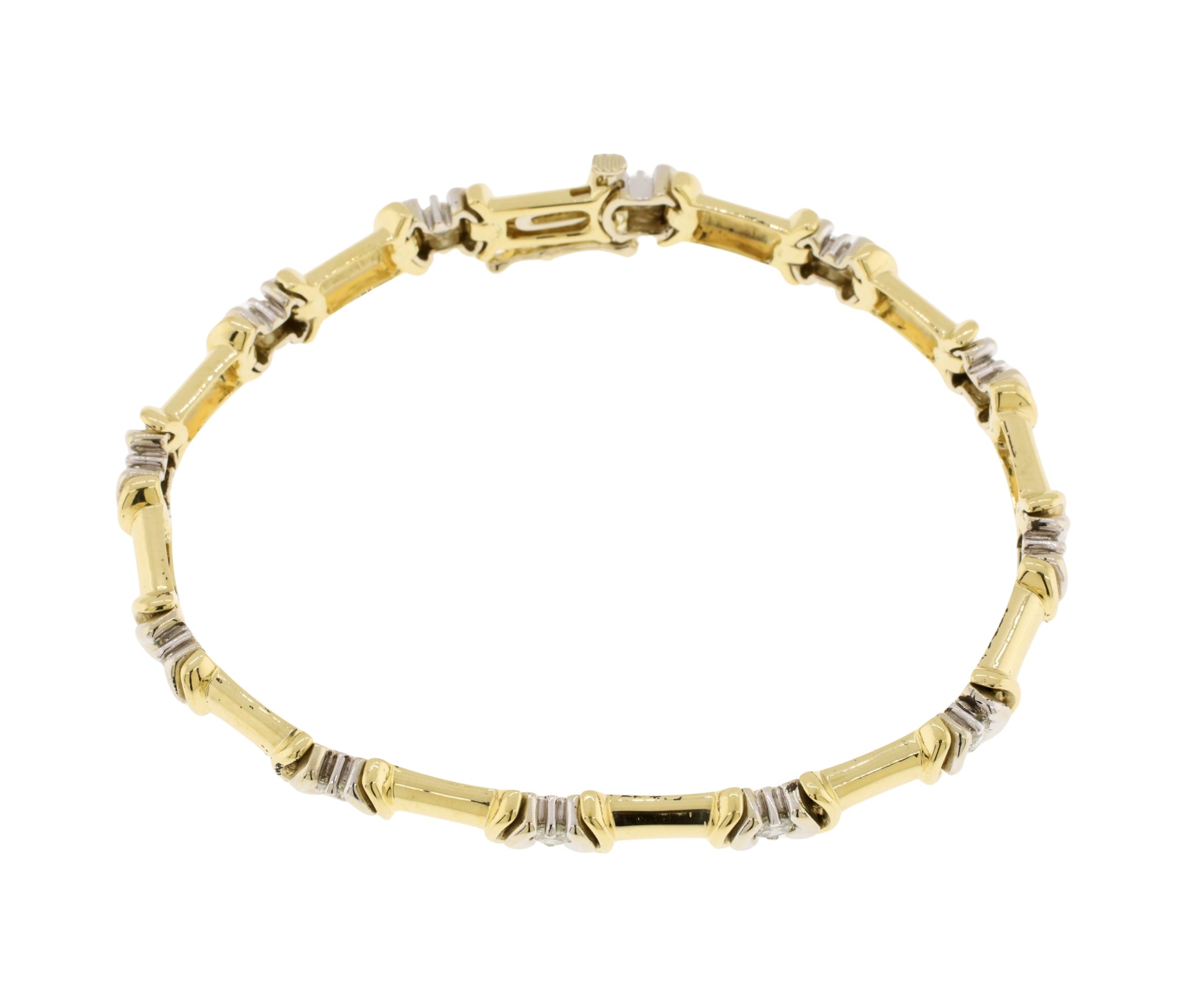 14K yellow & white gold bar link bracelet with 12 round brilliant cut SI2-I1 I-J diamonds weighing 1.21 cttw.