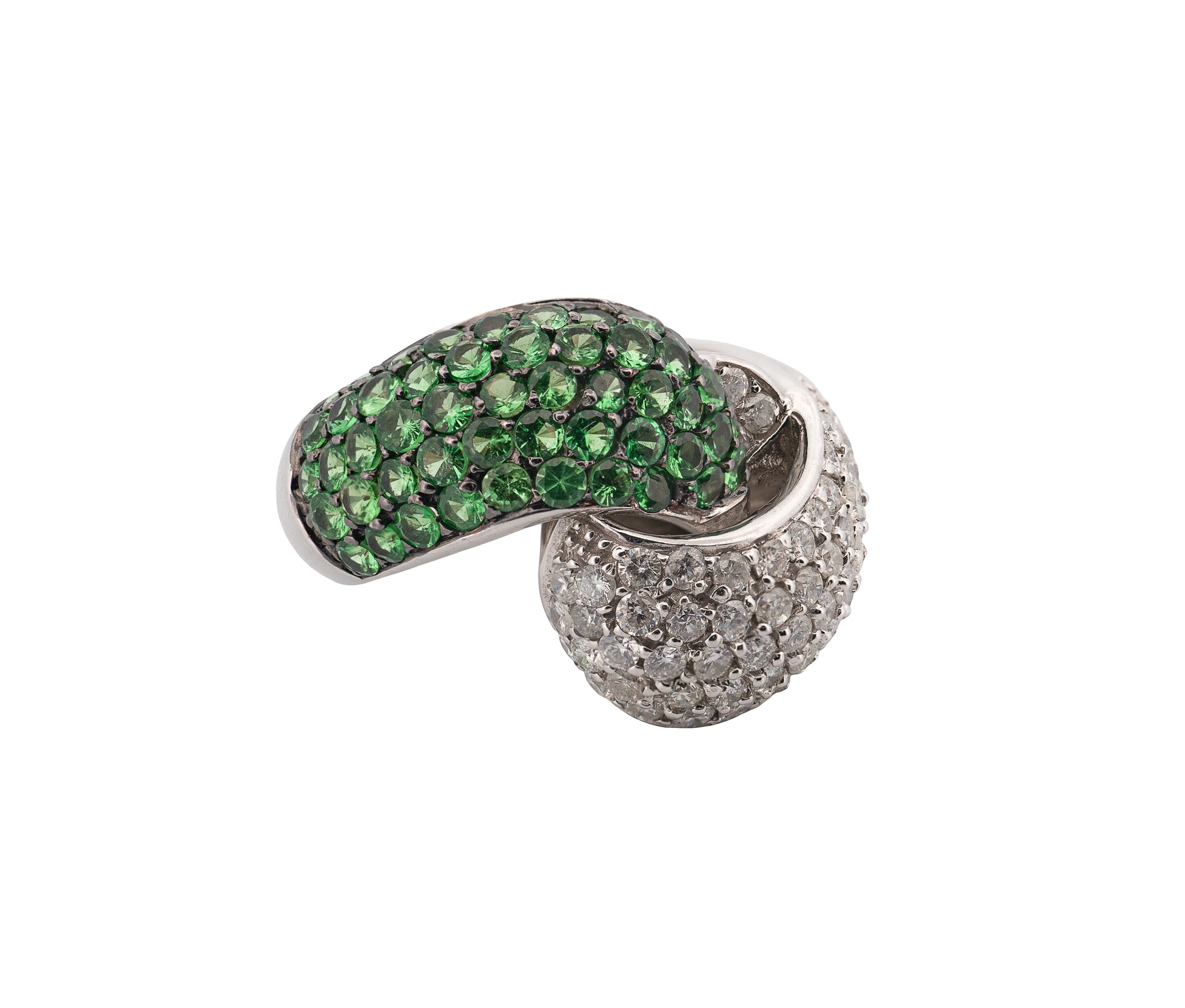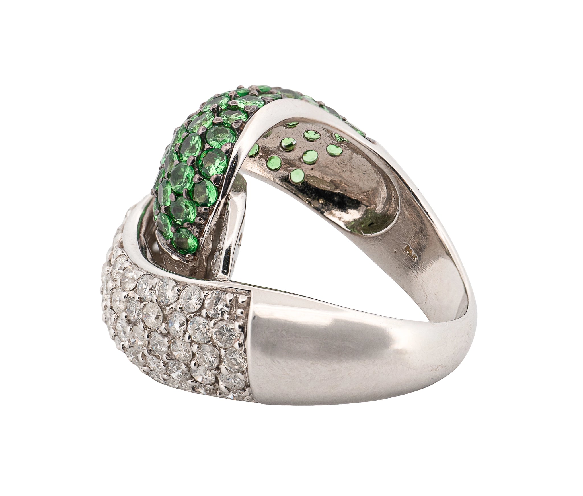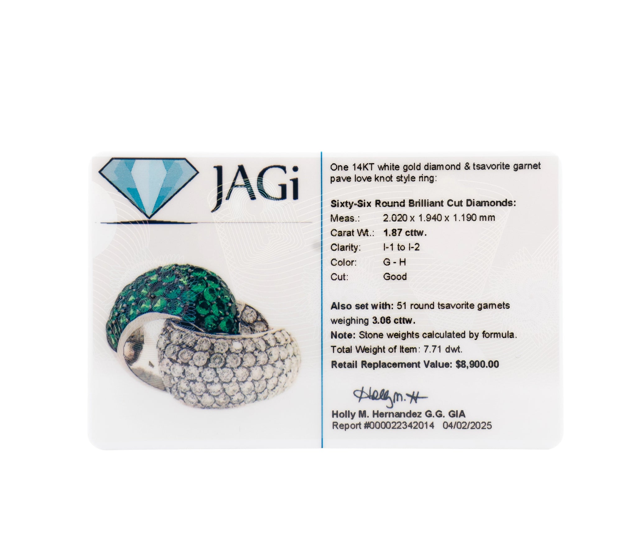 This beautiful 14KT white gold ring features a delicate love knot design adorned with sparkling diamonds and vibrant tsavorite garnets in a pave setting. A perfect symbol of everlasting love and elegance.