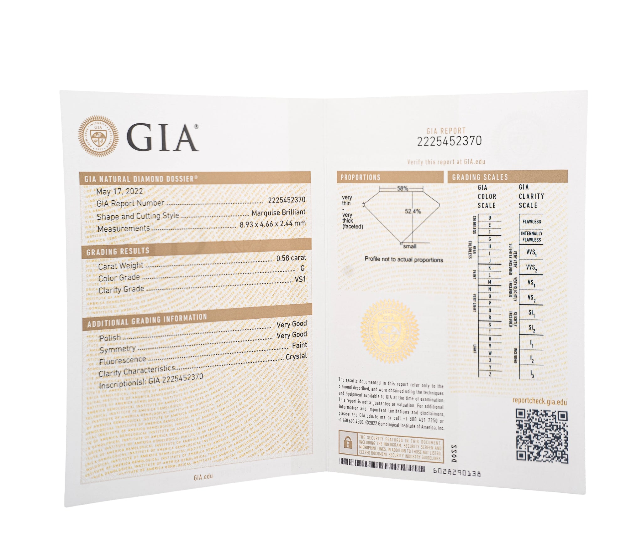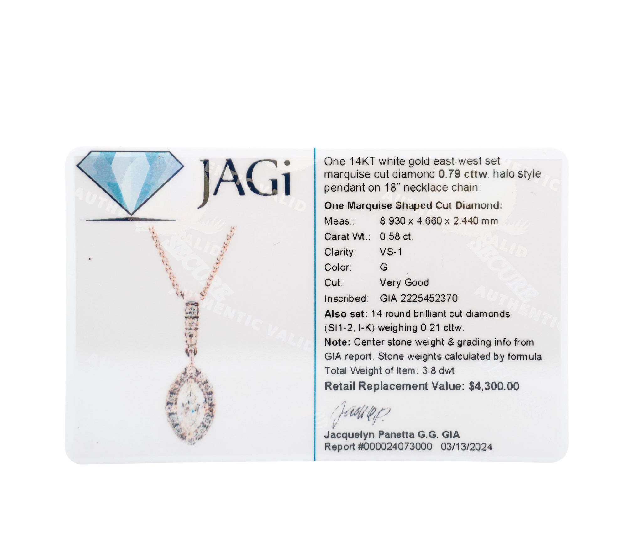 Elevate your style with this elegant 14KT white gold pendant featuring a stunning 0.58 CT marquise-cut diamond set in an East-West orientation. Surrounded by a sparkling halo, the design adds modern flair to a timeless classic—perfect for everyday luxury or special occasions.