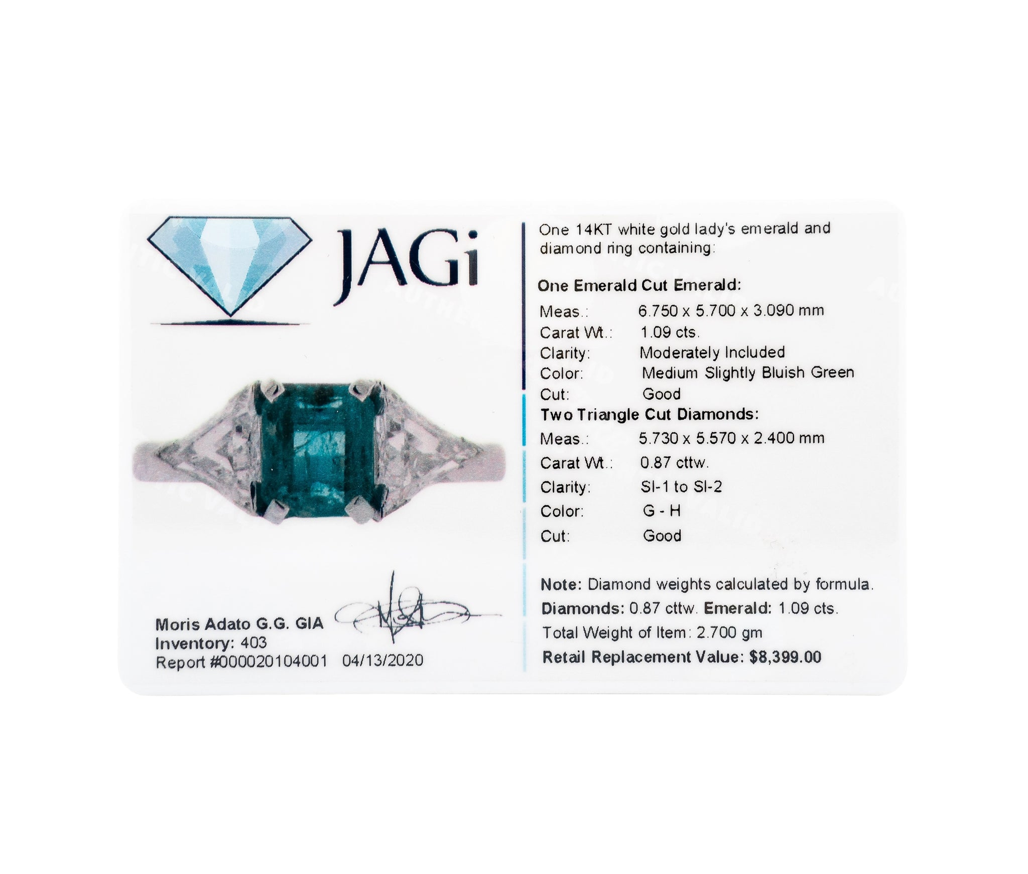 This exquisite 14KT white gold ring showcases a vibrant emerald at its center, accented by shimmering diamonds for added brilliance. A timeless design that combines elegance and sophistication—perfect for celebrating a special moment or adding a touch of luxury to any look.