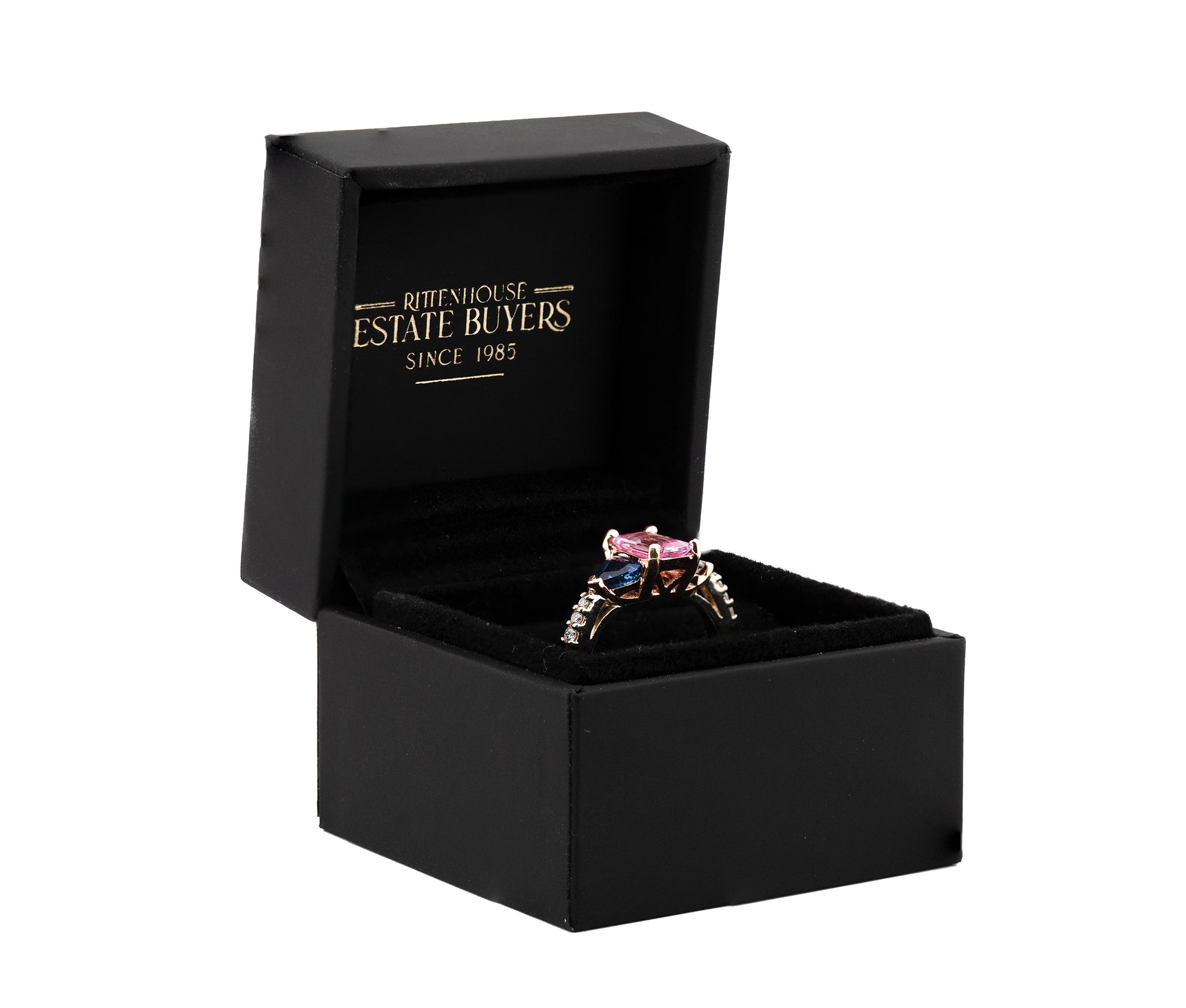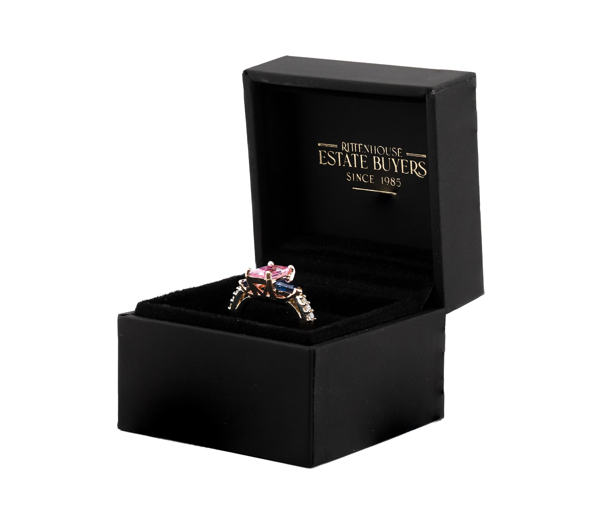 This elegant ring features 2.69 CTTW of natural sapphires and 0.10 CTTW of diamonds, set in a warm blend of 14KT yellow and rose gold. Weighing 3.600 DWT, it’s a striking piece that combines vibrant color with timeless style.