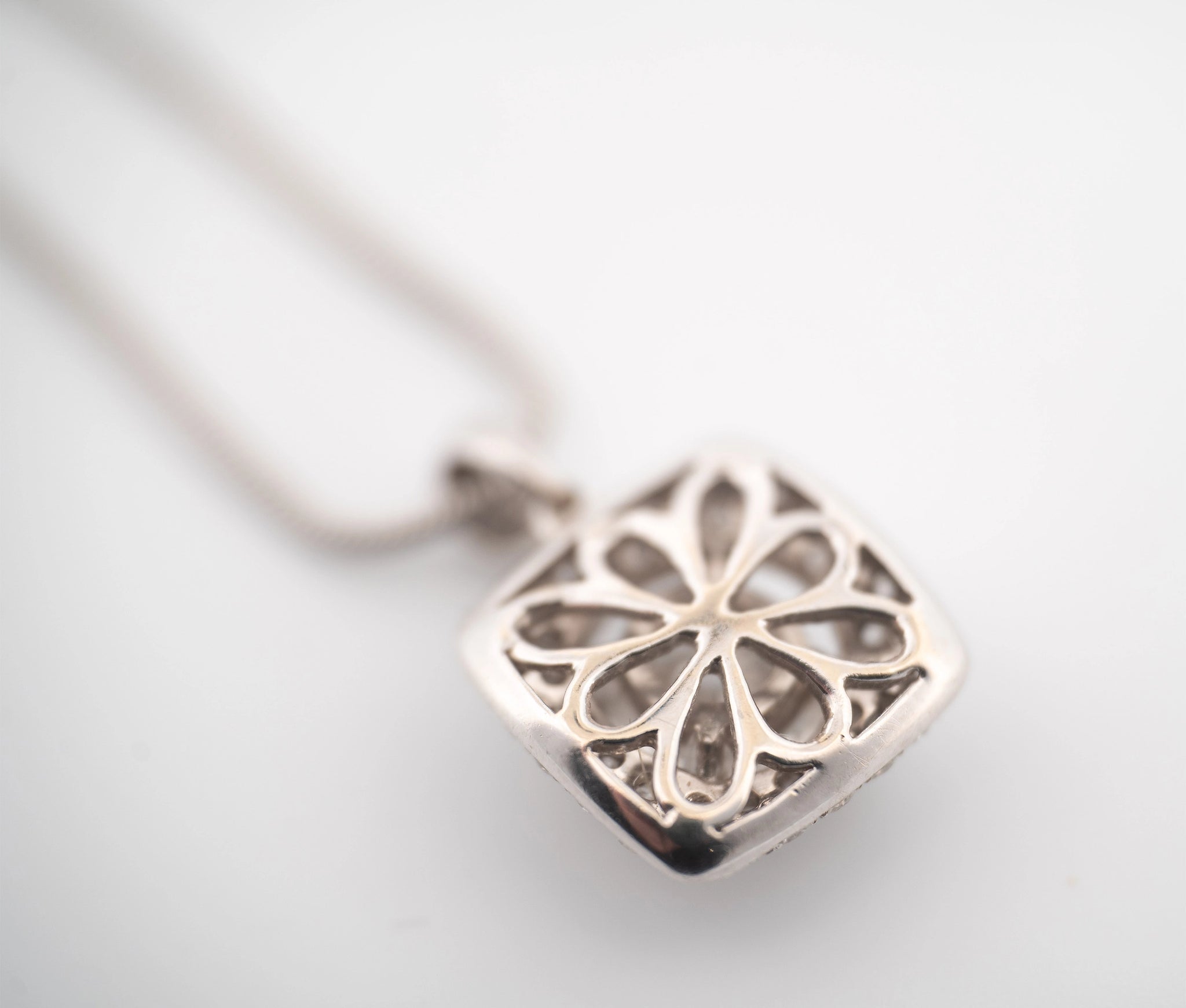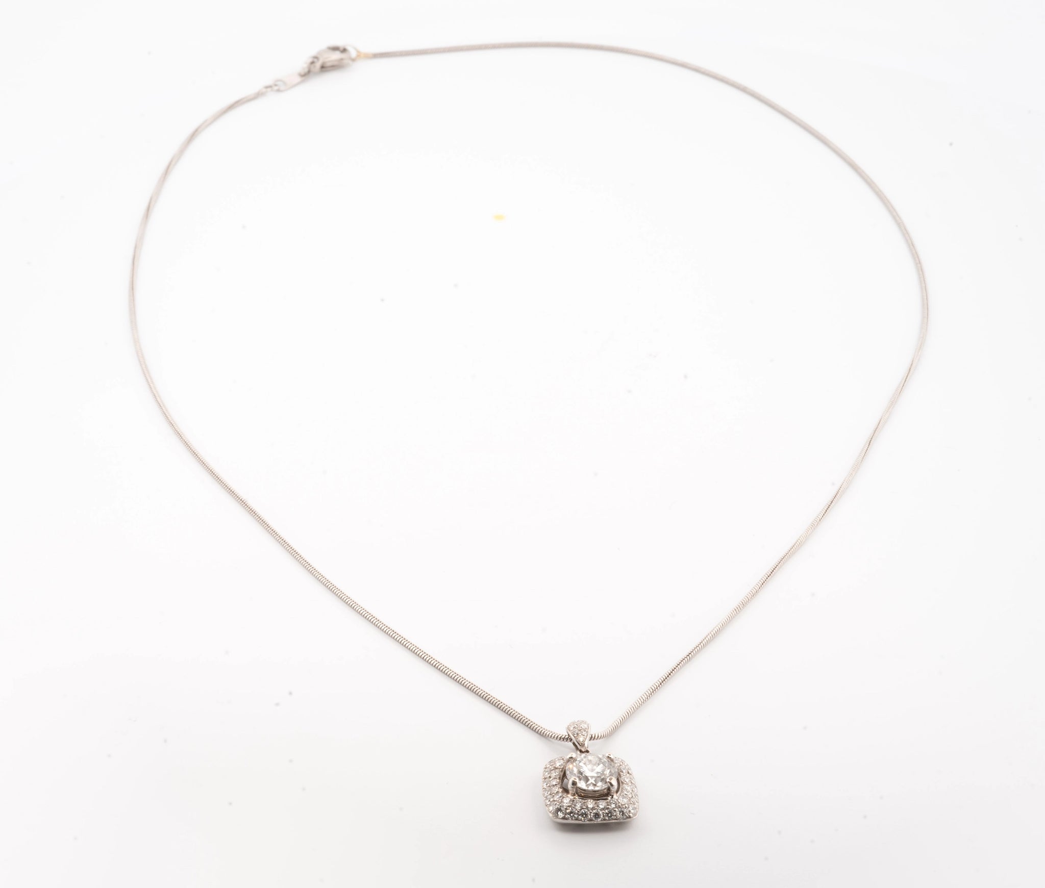 Perfect for those who appreciate understated elegance combined with substantial impact. Whether its for a special occasion or everyday luxury, this diamond pendant on a chain offers versatility and sophistication that will complement any outfit. 0.53 Diamond-set articulated bale. Round brilliant cut diamond measuring 6.11-6.19 mm, with depth unobtainable due to nature of mounting. Displays I-J color, SI2 clarity and displays strong blue fluorescence. Chain is marked PT950 and completed by a lobster clasp.