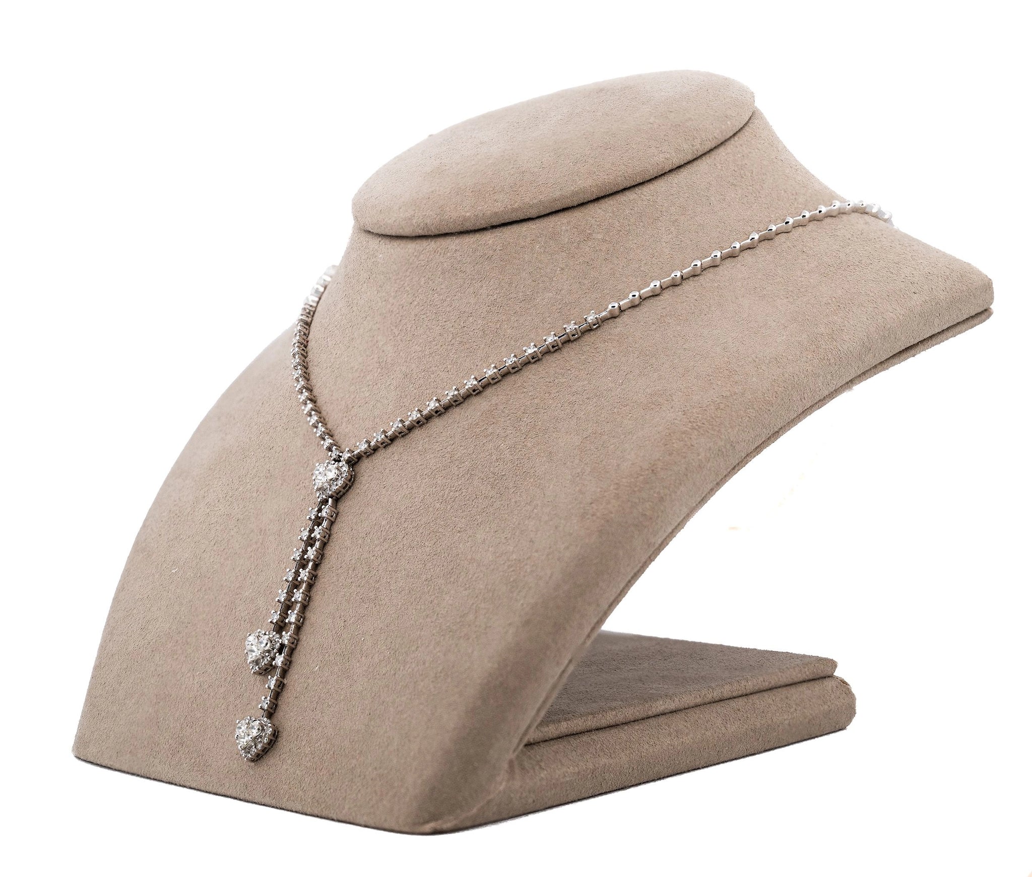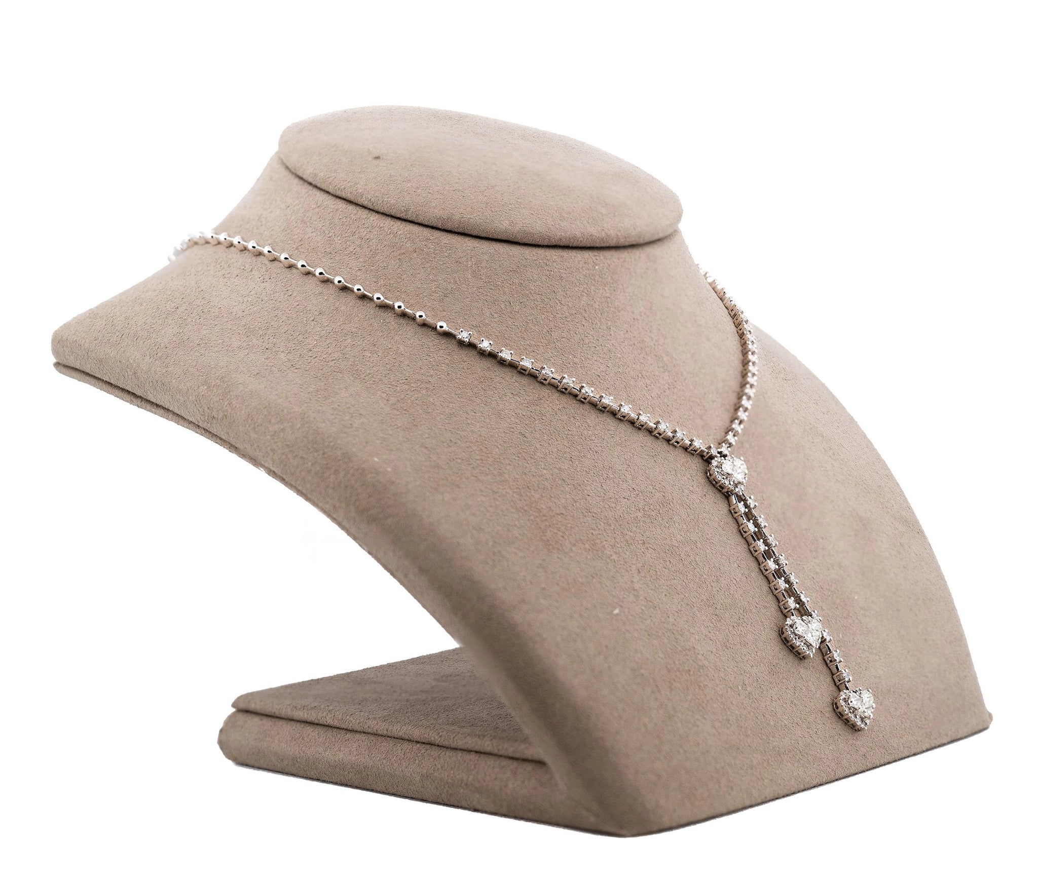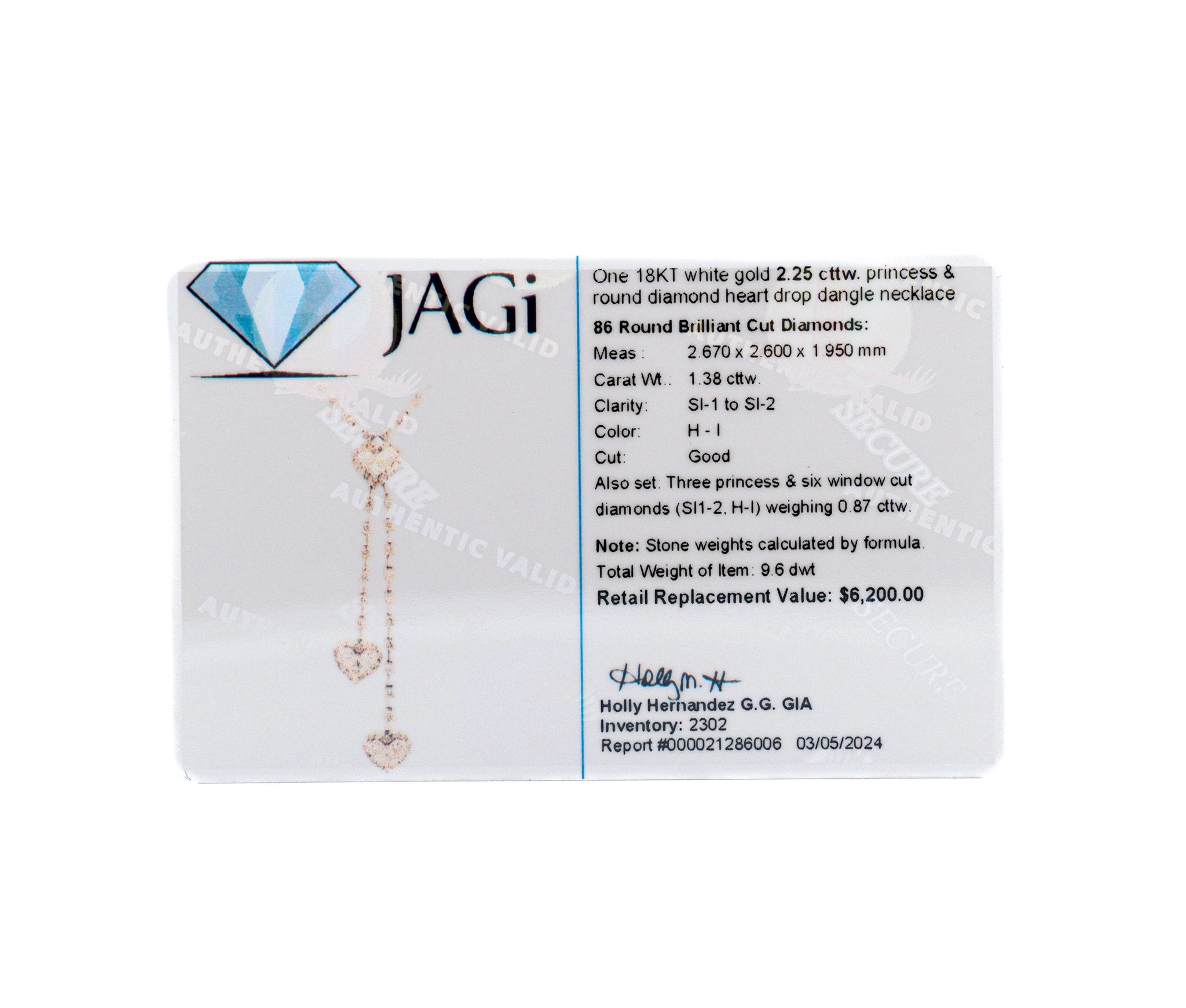 Elevate your style with this stunning 18K White Gold Heart Drop Dangle Necklace featuring a total of 2.25 carats of Princess and Round Diamonds. The intricate design showcases 86 Round Brilliant Cut Diamonds with a diamond color of H-I and clarity of SI1. This exquisite piece is perfect for adding a touch of elegance and sparkle to any outfit. Give yourself or a loved one the gift of luxury with this beautifully crafted diamond necklace.