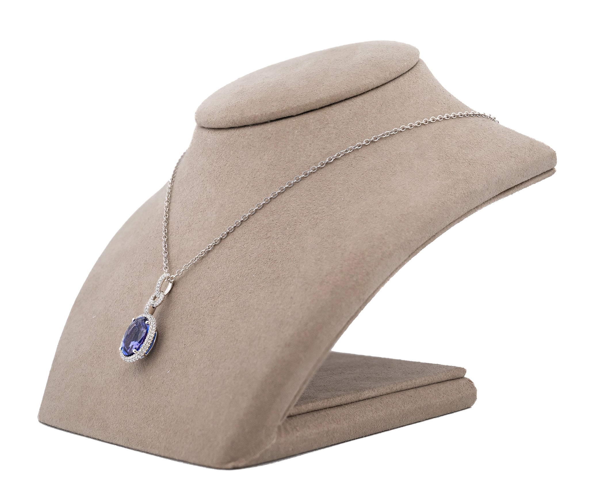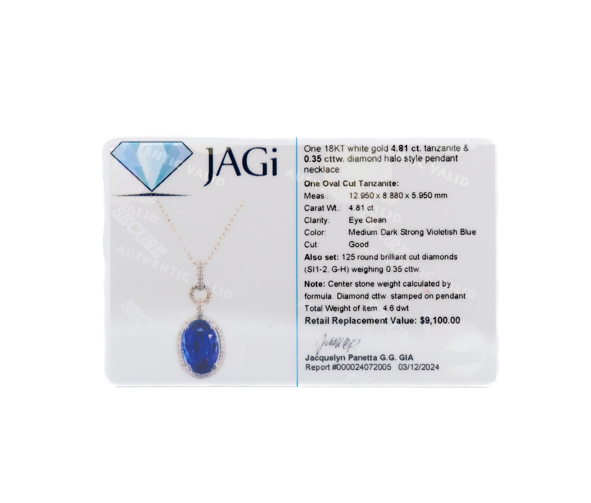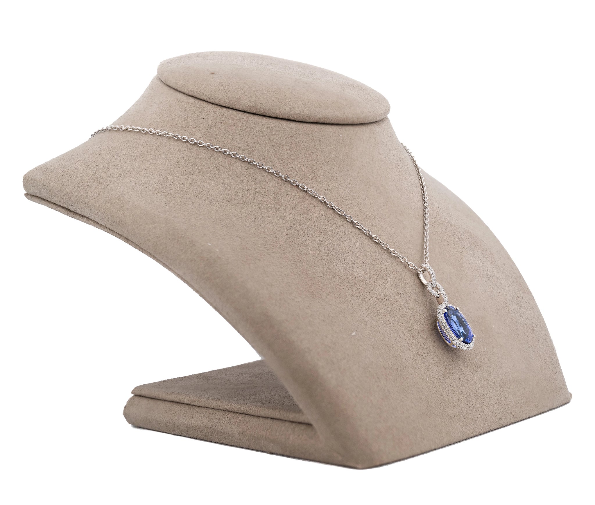 Elevate your style with this stunning 18K White Gold Pendant Necklace featuring a 4.81ct. Tanzanite gemstone surrounded by a dazzling .35cttw. Diamond halo. Crafted with precision and elegance, this necklace exudes luxury and sophistication. The perfect accessory for special occasions or to add a touch of glamour to your everyday look. Own a piece of timeless beauty with this intricately designed pendant necklace.