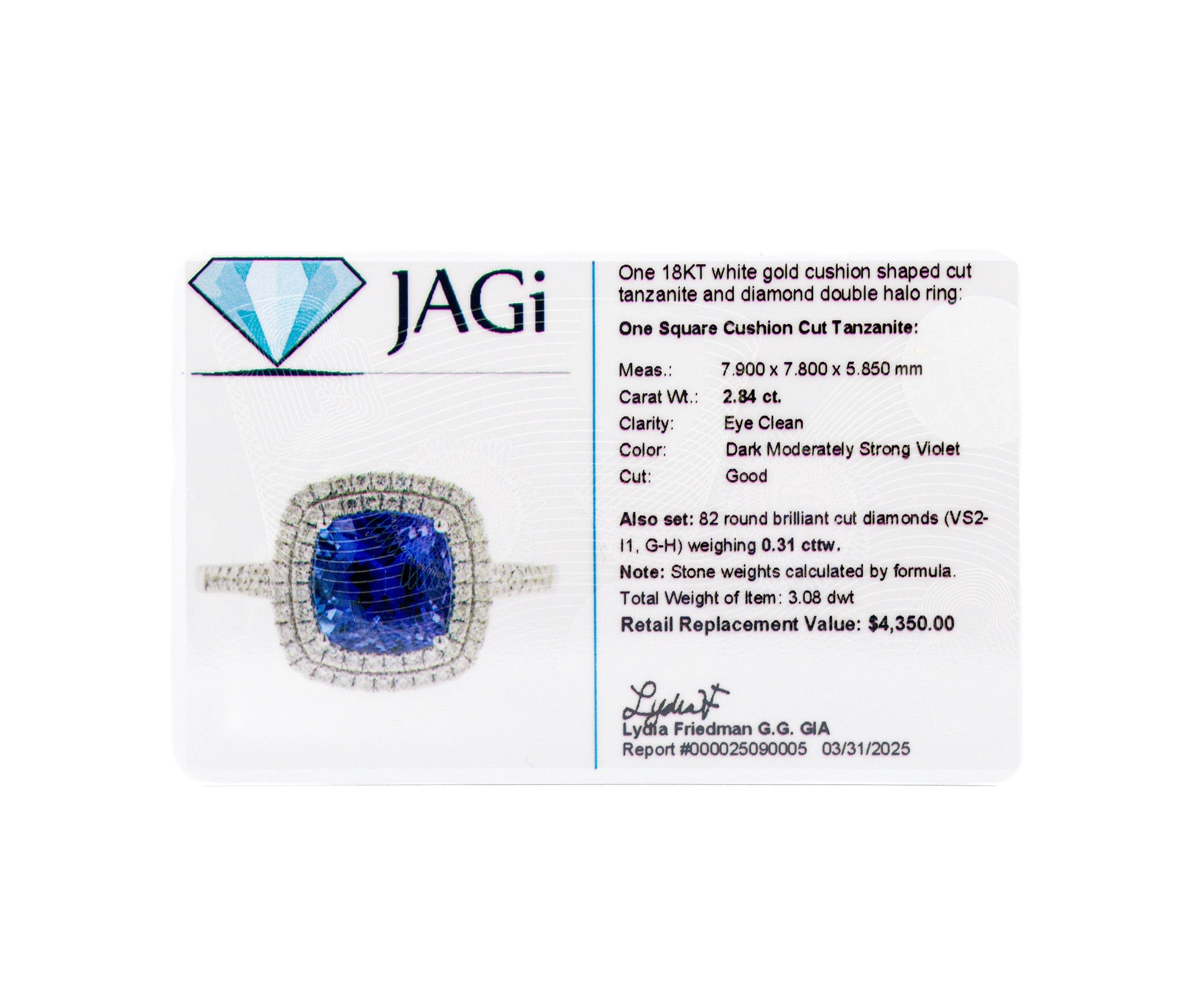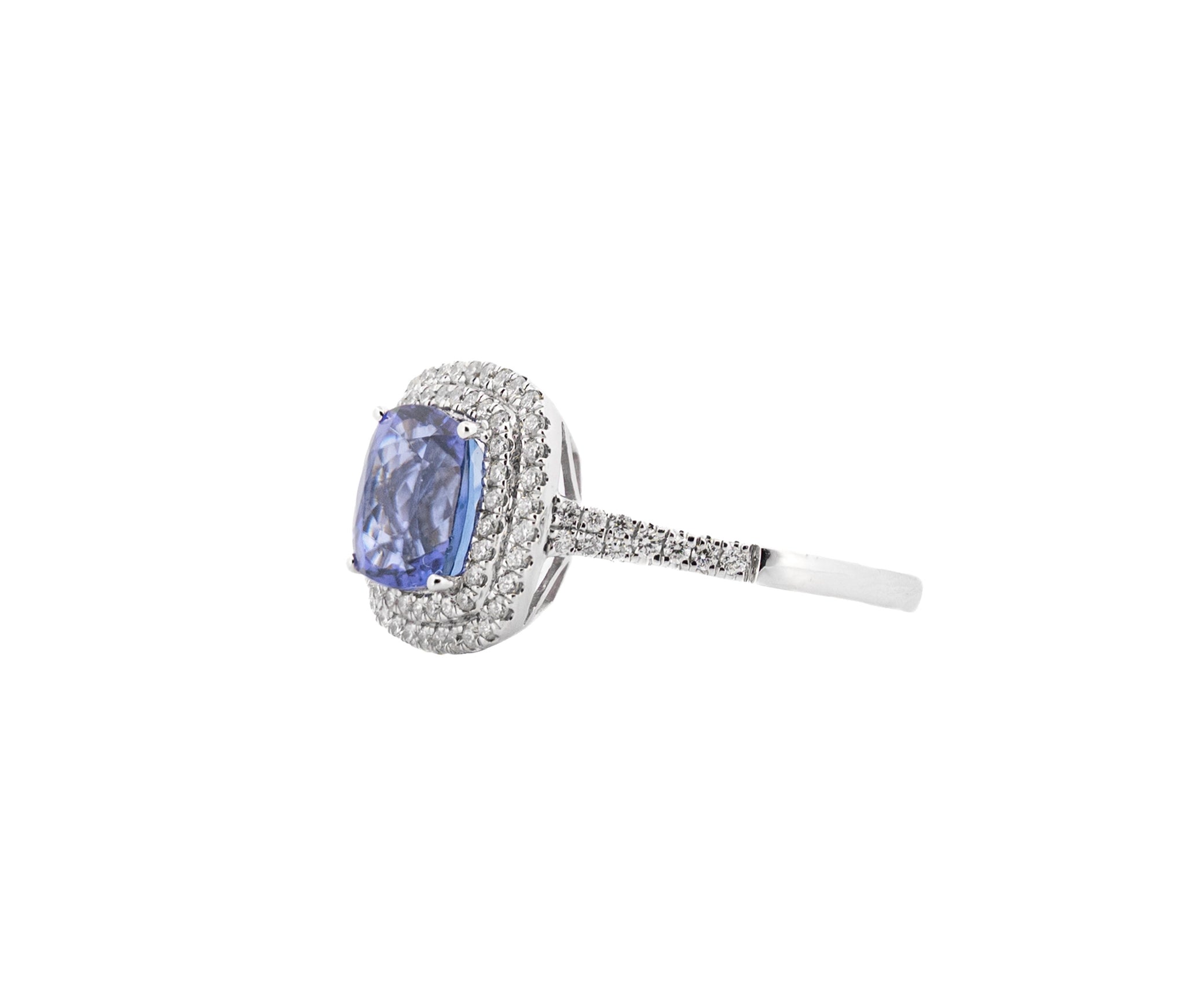 18K White Gold Cushion Cut Tanzanite and Diamond Double Halo Ring