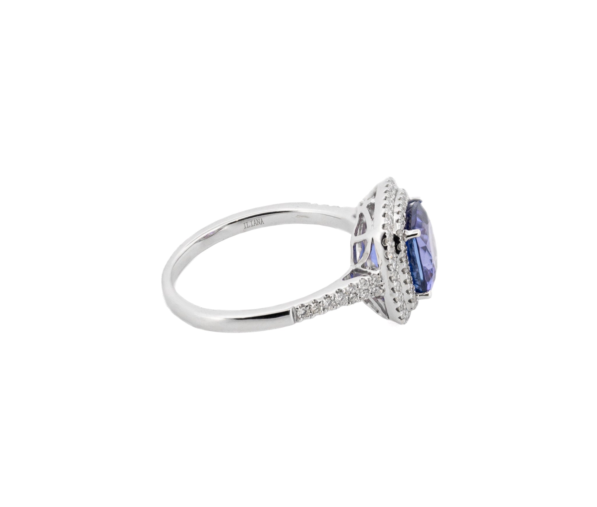 18K white gold tanzanite and diamond double halo style ring, featuring one 2.84 ct. tanzanite and 82 VS2-I1, G-H round brilliant cut diamonds weighing 0.31 cttw. Ring is in a cathedral style with diamond side stones.