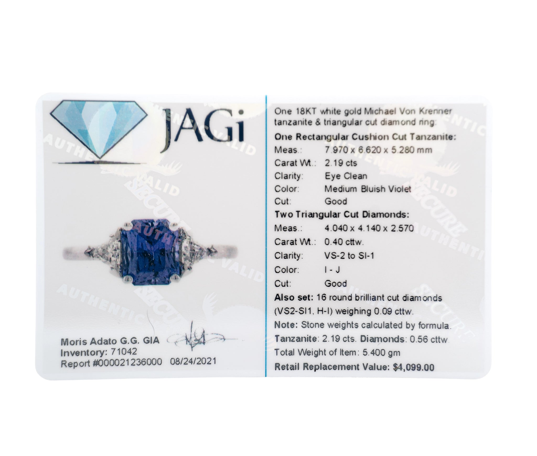 A striking design by Michael Von Krenner, this elegant ring is crafted in 18K white gold and showcases a captivating rectangular cushion-cut tanzanite weighing 2.19 carats. The gemstone displays a medium bluish-violet hue with eye-clean clarity, embodying the vivid color and brilliance that make tanzanite so sought after.