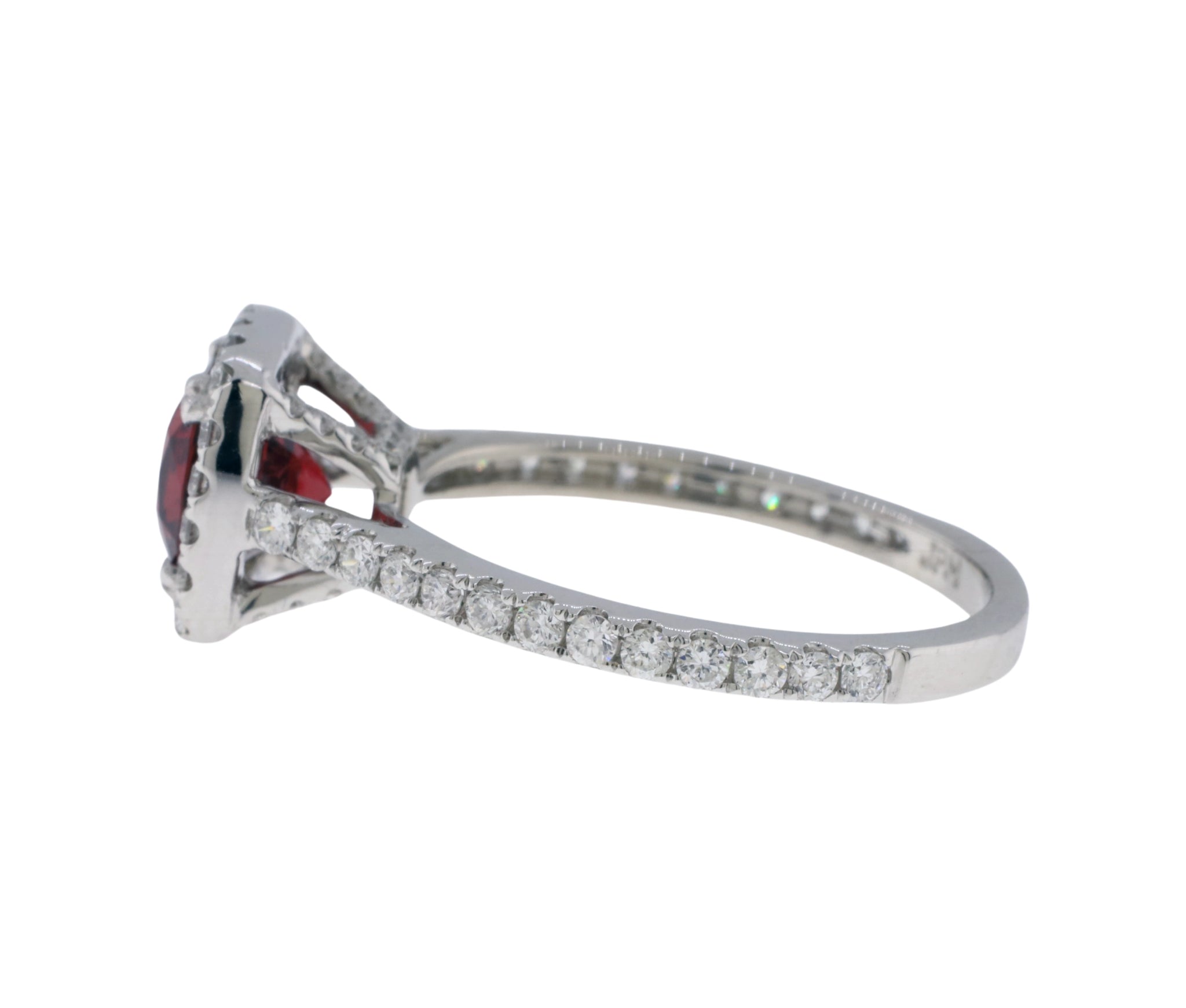 18K White Gold Red Spinel and Diamond Halo Cathedral Mount Ring