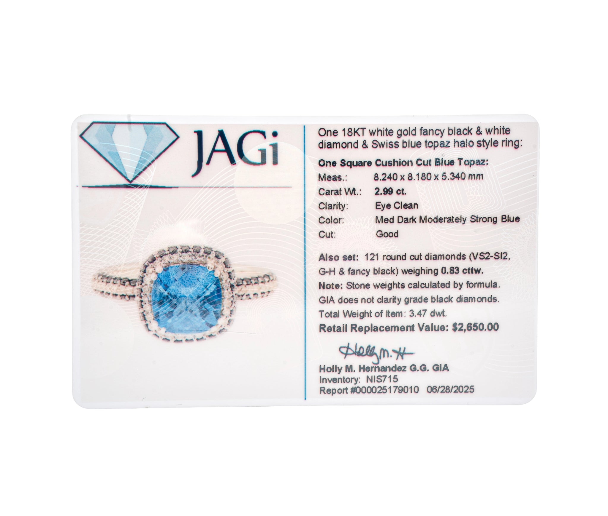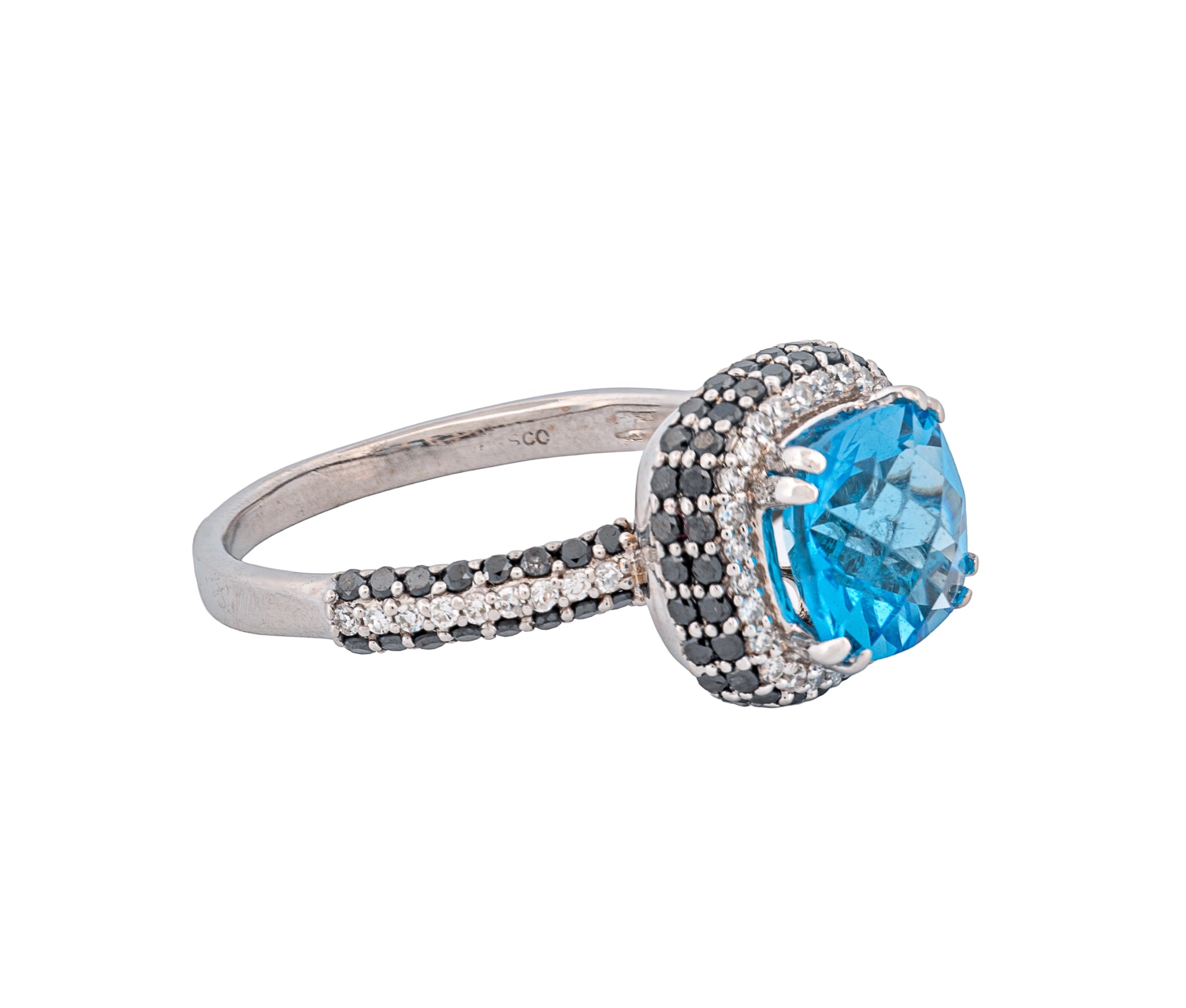 18K White Gold & Swiss Blue Topaz & Fancy Black and White Diamond Ring