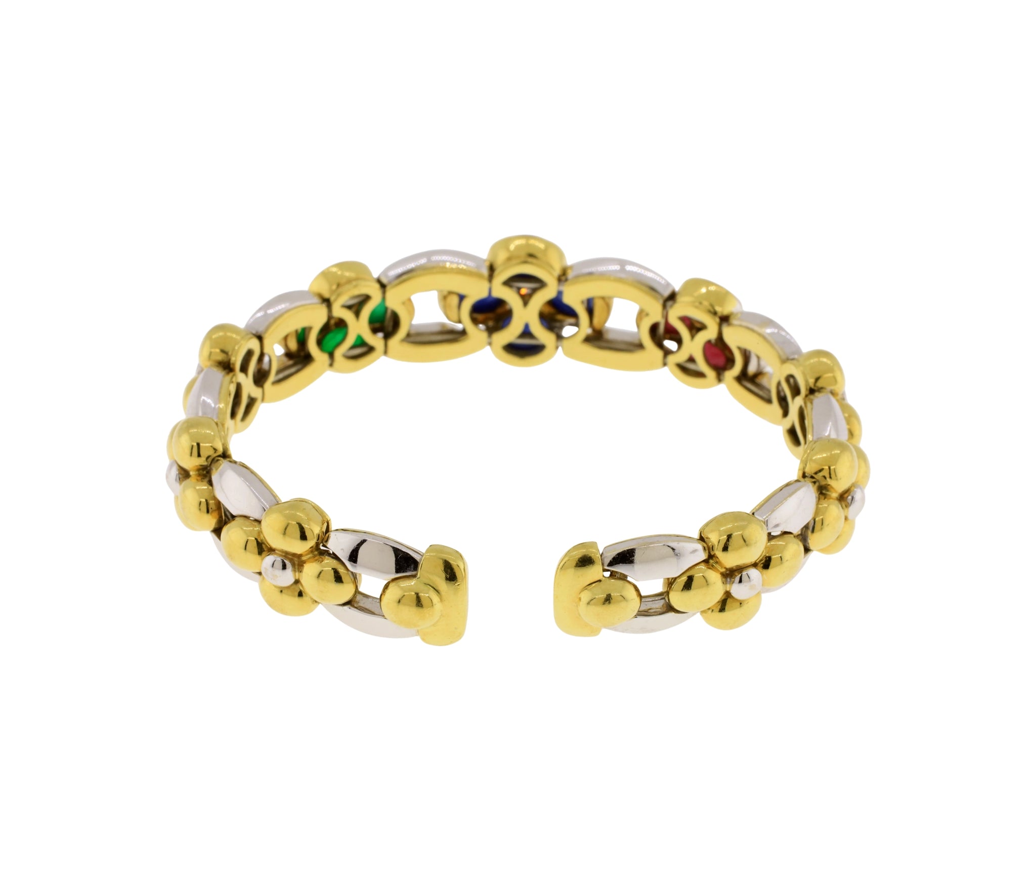 Vibrant and luxurious, this 18K White & Yellow Gold Flex Cuff Bracelet showcases a stunning floral design adorned with natural rubies, sapphires, emeralds, and diamonds. The rich colors of the gemstones contrast beautifully with the two-tone gold, creating a bold yet elegant statement. Its flexible design ensures a comfortable fit, making it a timeless piece full of color, charm, and sophistication.
