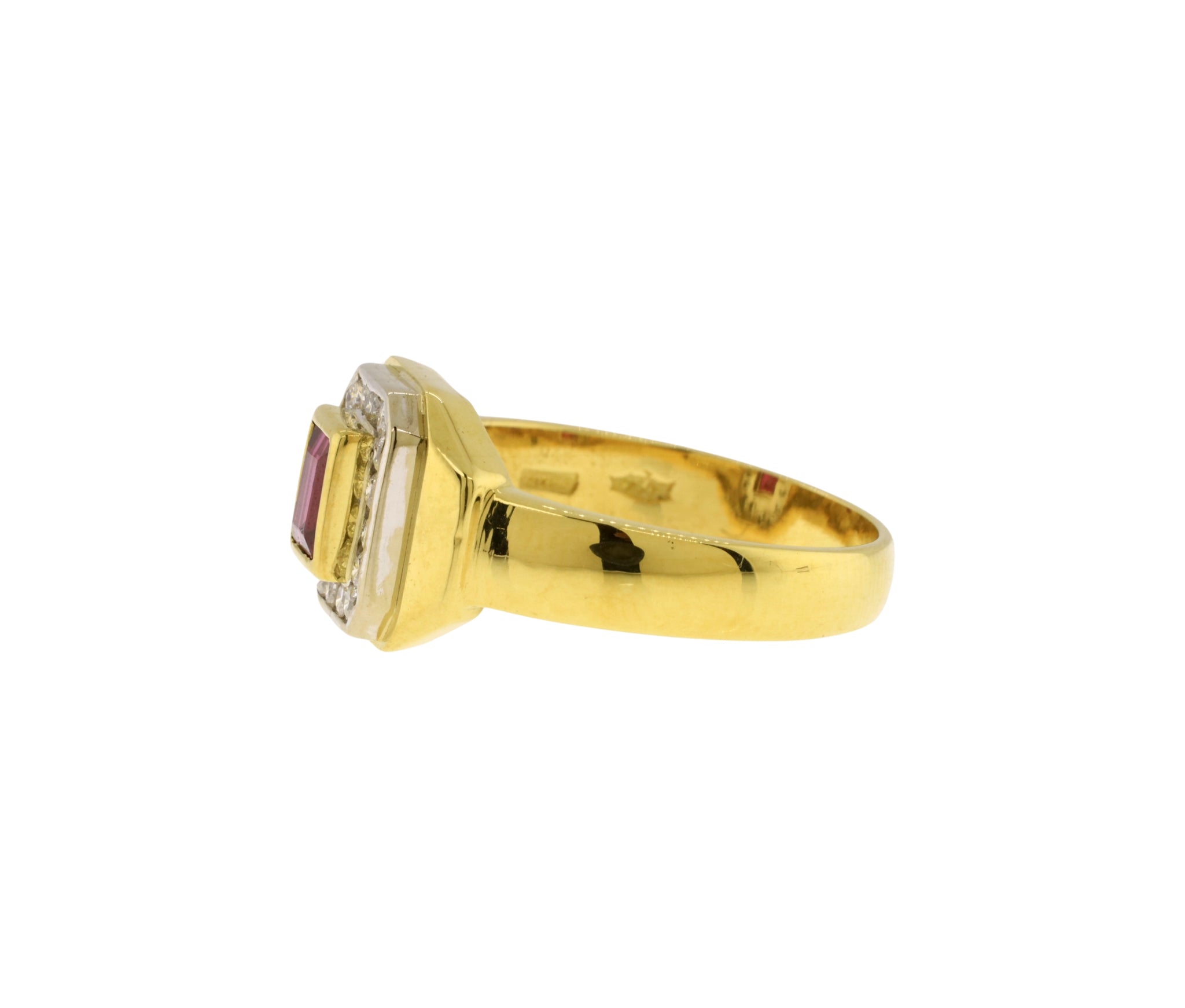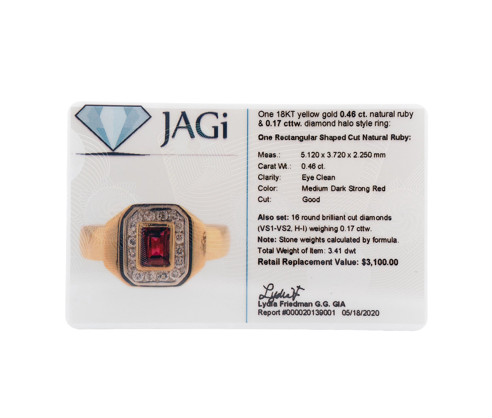 18KT yellow gold halo style ring showcasing a 0.46 ct. rectangular shaped cut natural ruby center and a halo consisting of 16 round brilliant cut diamonds, VS1-VS2 in clarity and H-I in color, weighing 0.17 cttw.
