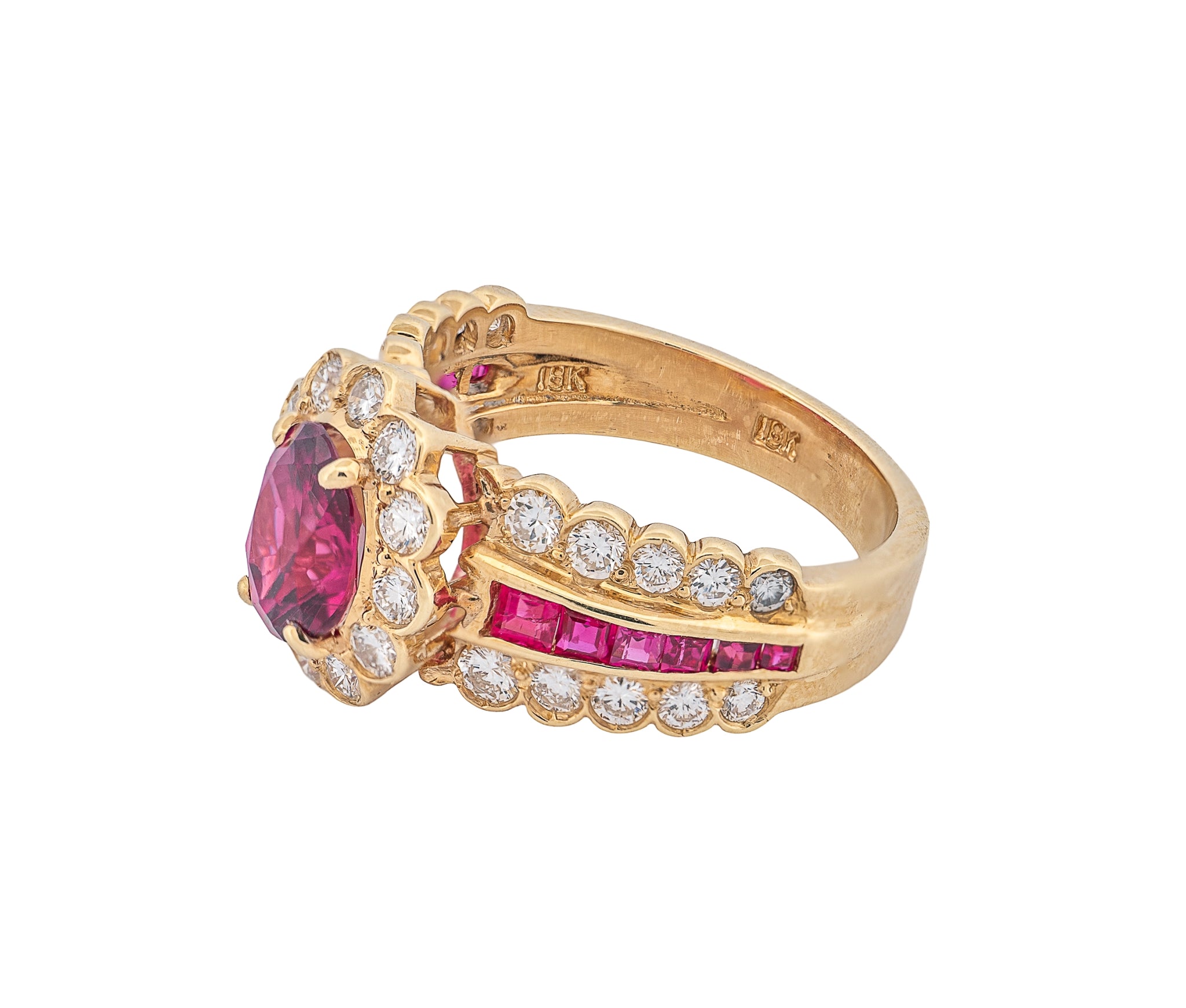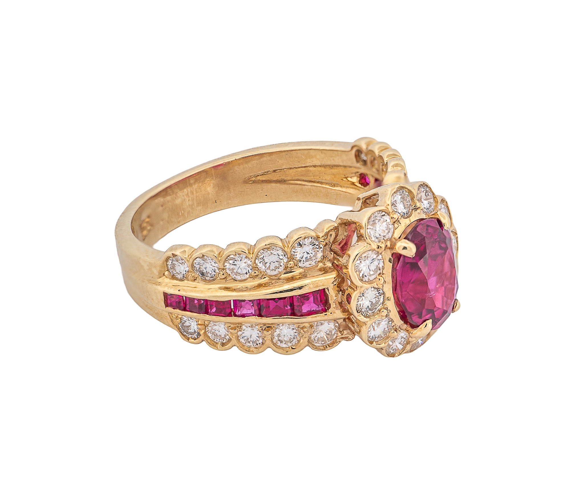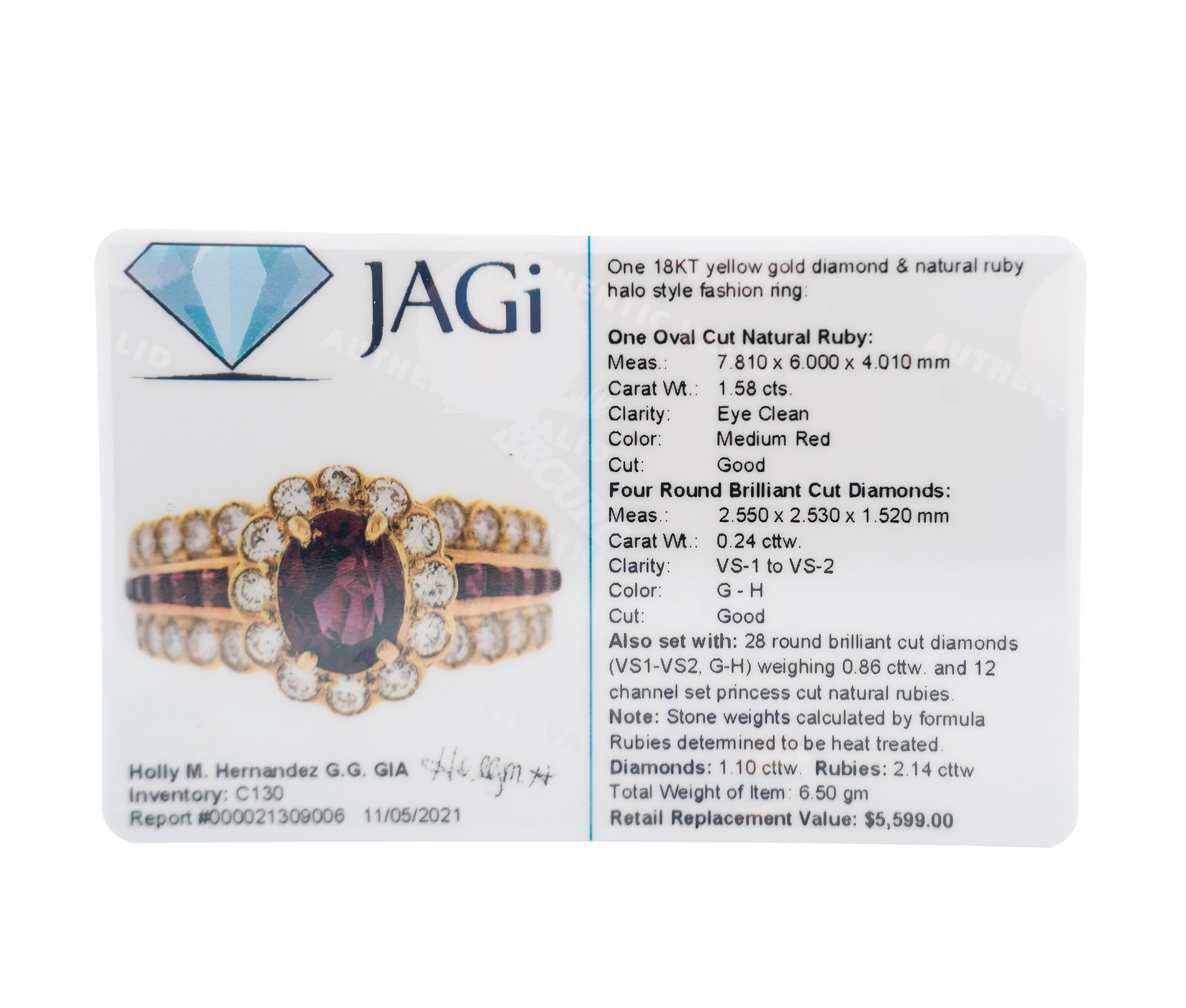 Radiant and refined, this 18K yellow gold halo ring features a striking oval-cut natural ruby weighing 1.58 carats, exhibiting a rich medium red hue with eye-clean clarity and a beautiful, lively sparkle.