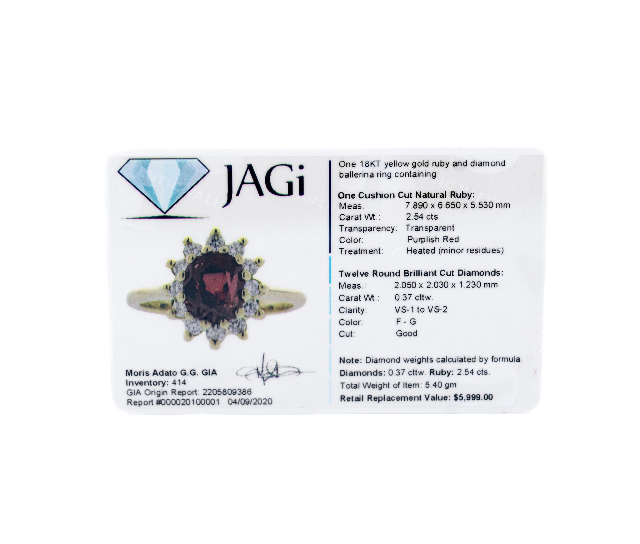 Elevate your style with this exquisite 18K yellow gold ballerina ring featuring a stunning cushion-cut 2.54ct ruby at the center, surrounded by 12 sparkling F-G diamonds totaling .37cttw. The ruby's vibrant red hue contrasts beautifully with the brilliant diamonds, set in a timeless design that exudes elegance and sophistication. This luxurious ring is a perfect statement piece for any special occasion, adding a touch of glamour and allure to your ensemble. Crafted with precision and attention to detail, this ring is a true masterpiece that will make you shine bright wherever you go.