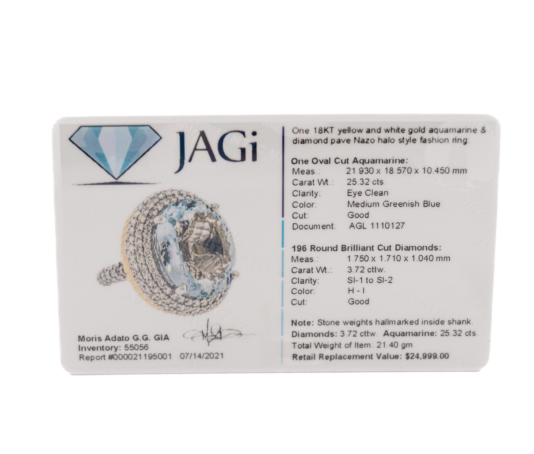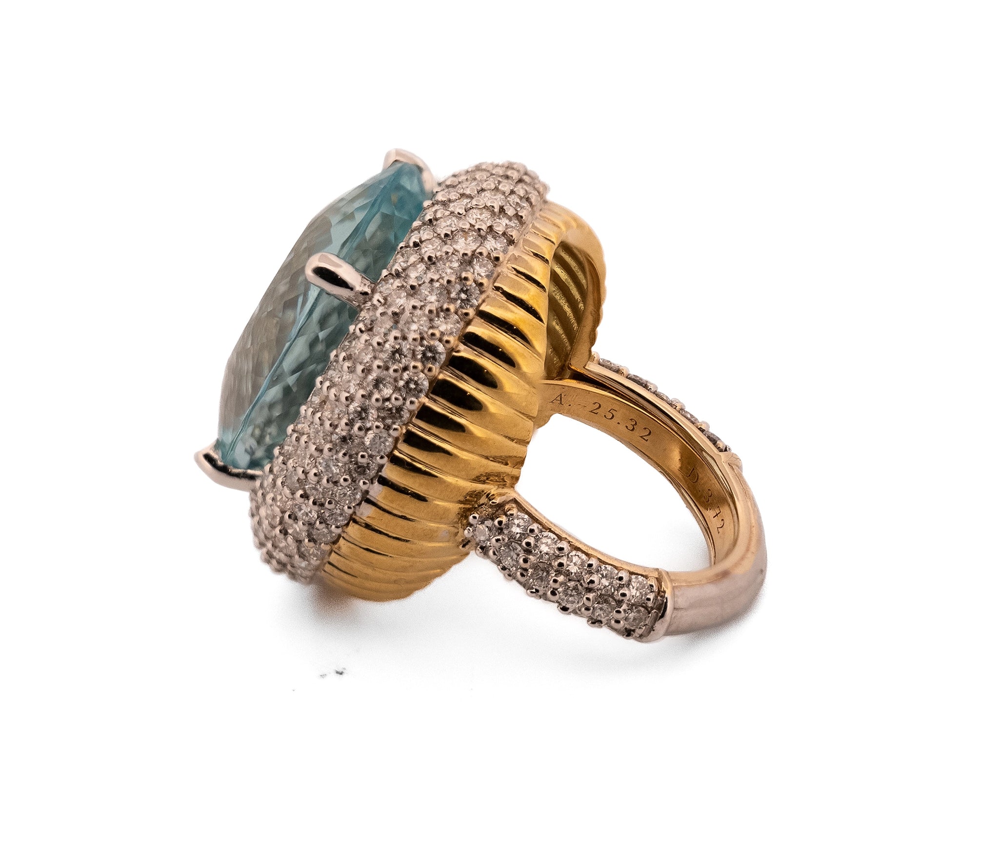 This Women's 18k Yellow & White Gold Aquamarine Diamond Halo Ring in Size 6 features a stunning central aquamarine stone totaling 25.32cts, known for its serene blue hue. The stone is elegantly surrounded by a halo of sparkling diamonds, totaling 3.72cts, enhancing its brilliance and creating a striking contrast with the warm yellow gold band. The combination of yellow and white gold adds depth and sophistication to the design, making it a versatile piece that can be worn on various occasions. The size 6 fit ensures comfort and wearability, making it a perfect addition to any jewelry collection.