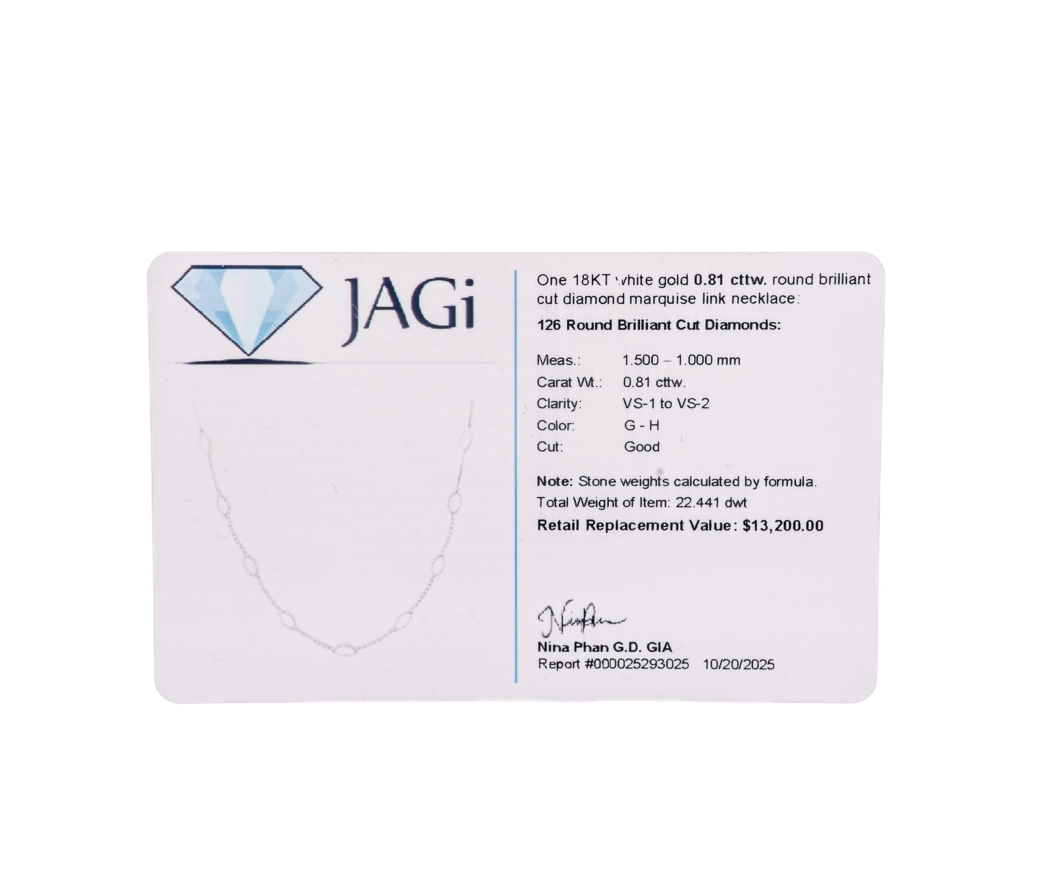 One 18KT white gold diamond marquise link necklace. The links are set with 126 round brilliant cut diamonds weighing 0.81 cttw., VS1-VS2 in clarity and G-H in color.