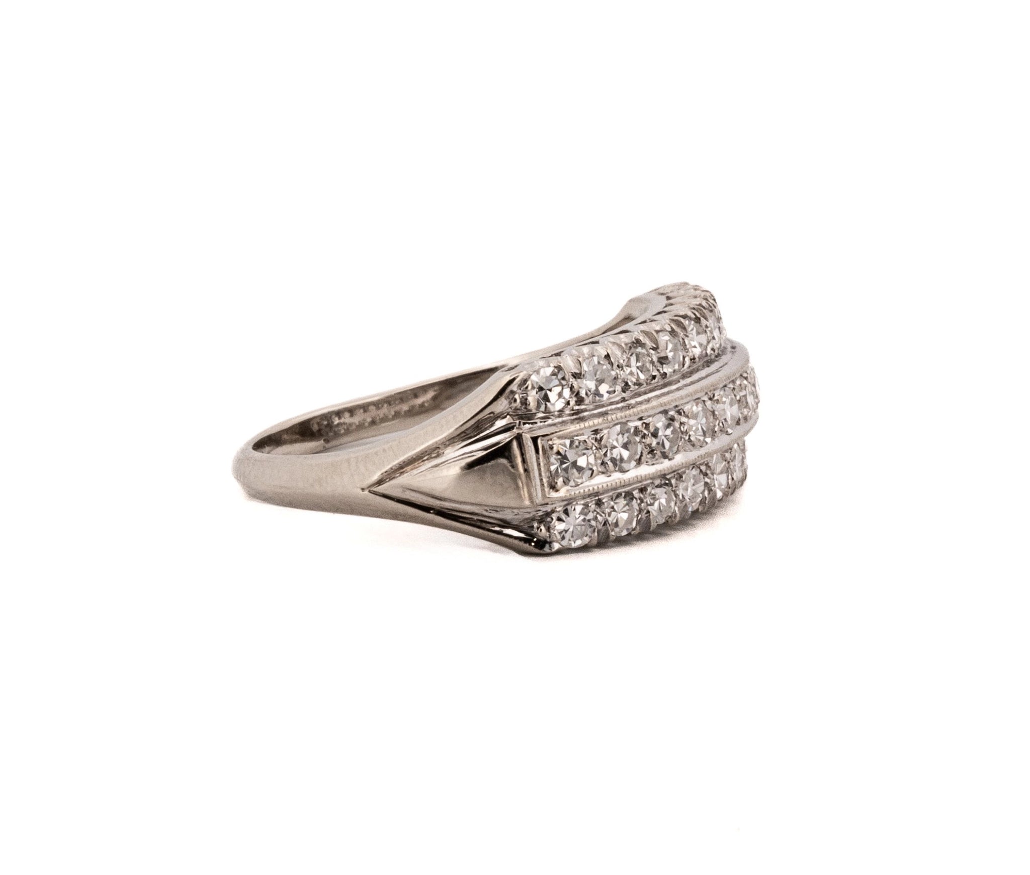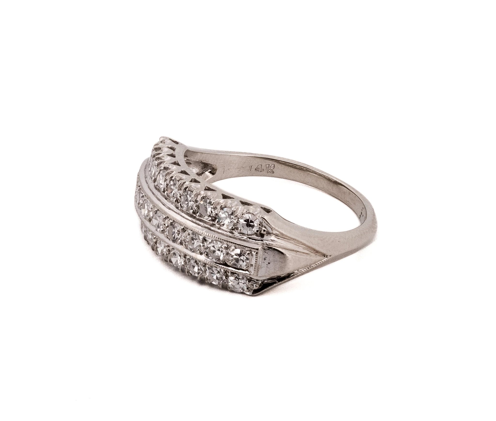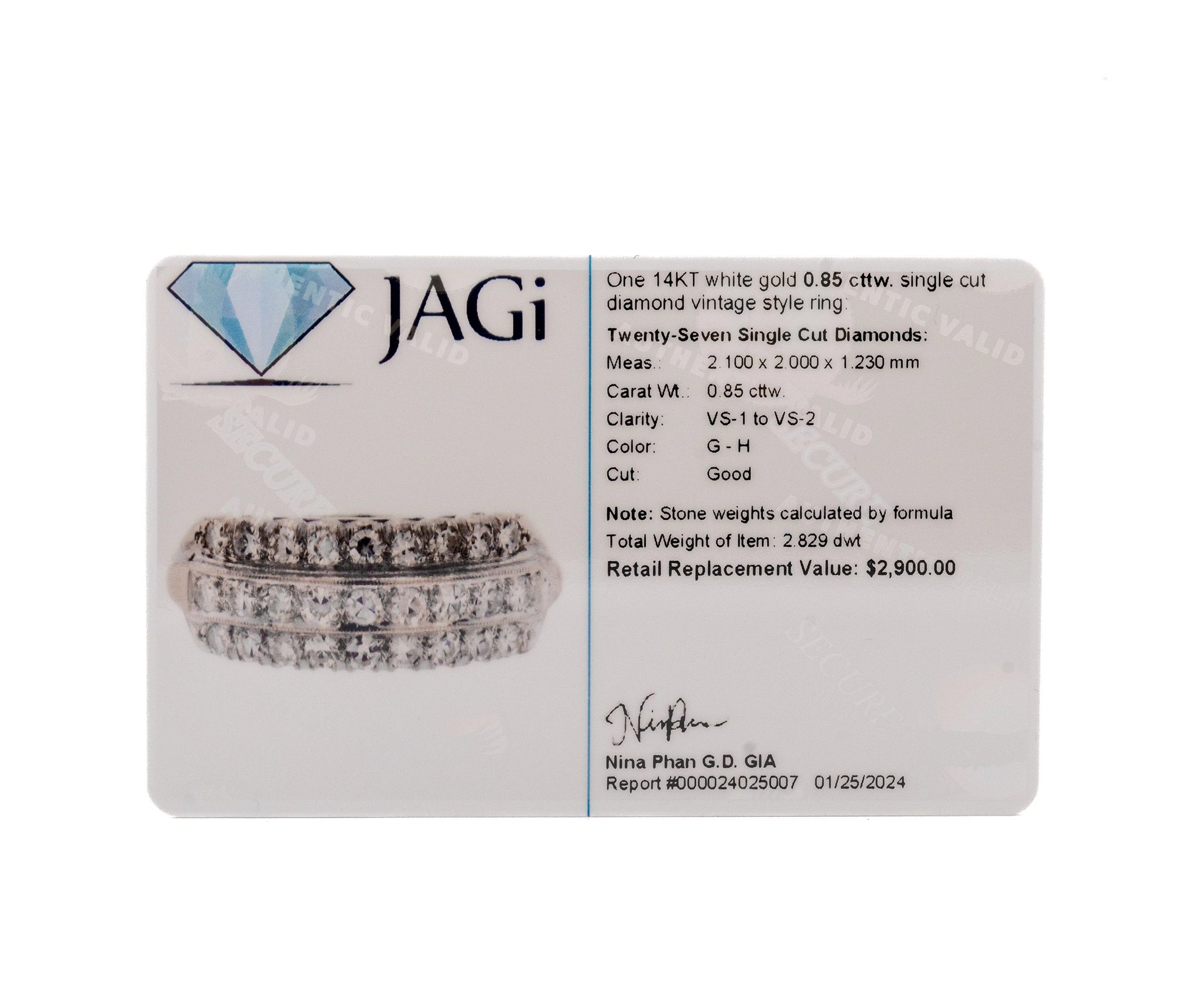 Enhance your elegance with this exquisite Antique 14k White Gold Diamond Band. Crafted with precision and featuring dazzling diamonds, this timeless piece is perfect for adding a touch of sophistication to your look. Whether for a special occasion or everyday wear, this band radiates luxury and style. Make a statement with this beautiful piece that combines the allure of antique design with the brilliance of diamonds.