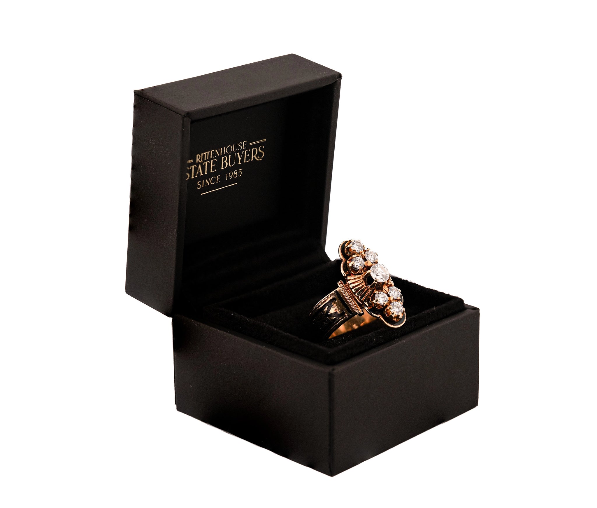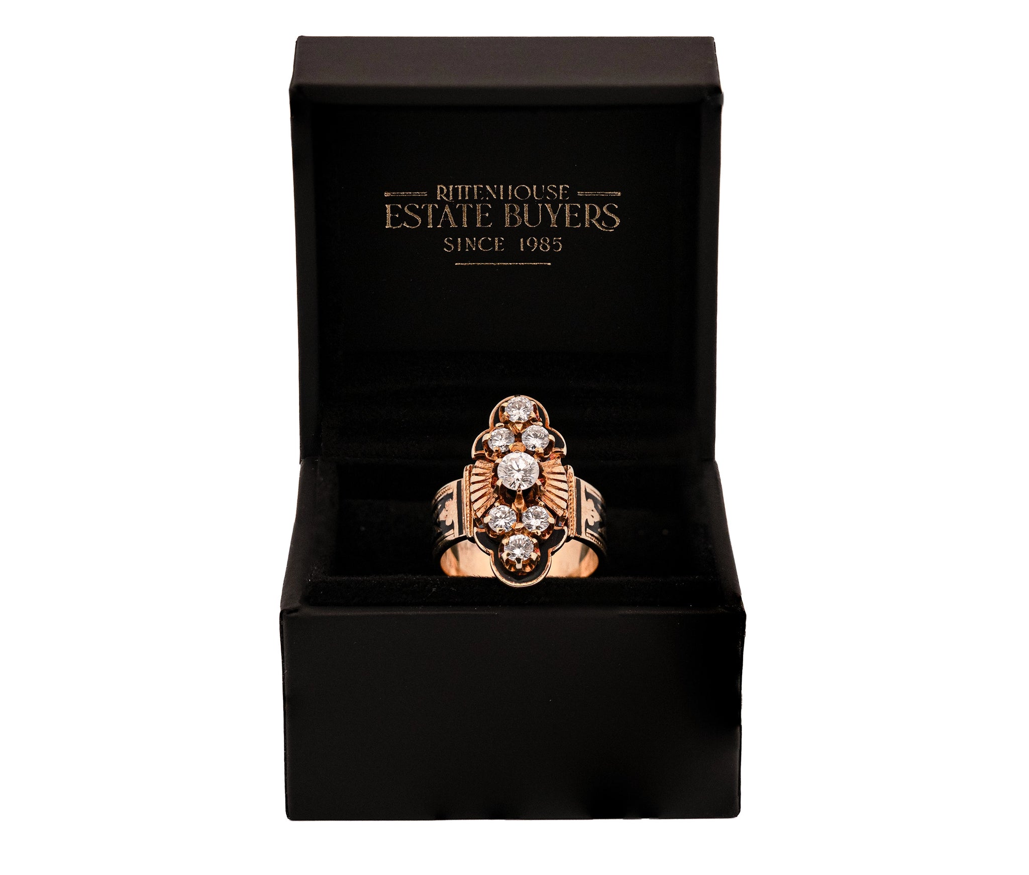 This 14K yellow gold ring mixes vintage elegance with bold detail. It features seven round diamonds, totaling approximately 0.85 carats, in G-H color and SI1 clarity for a soft, antique sparkle. Black enamel adds a striking contrast, giving the piece a unique, standout look. Weighing 5.7 dwt, it feels solid yet comfortable. Sized at 6.25, it’s perfect for anyone who loves timeless style with a twist