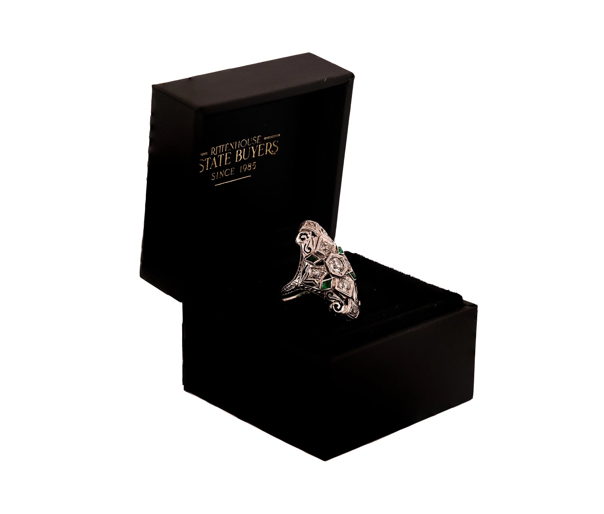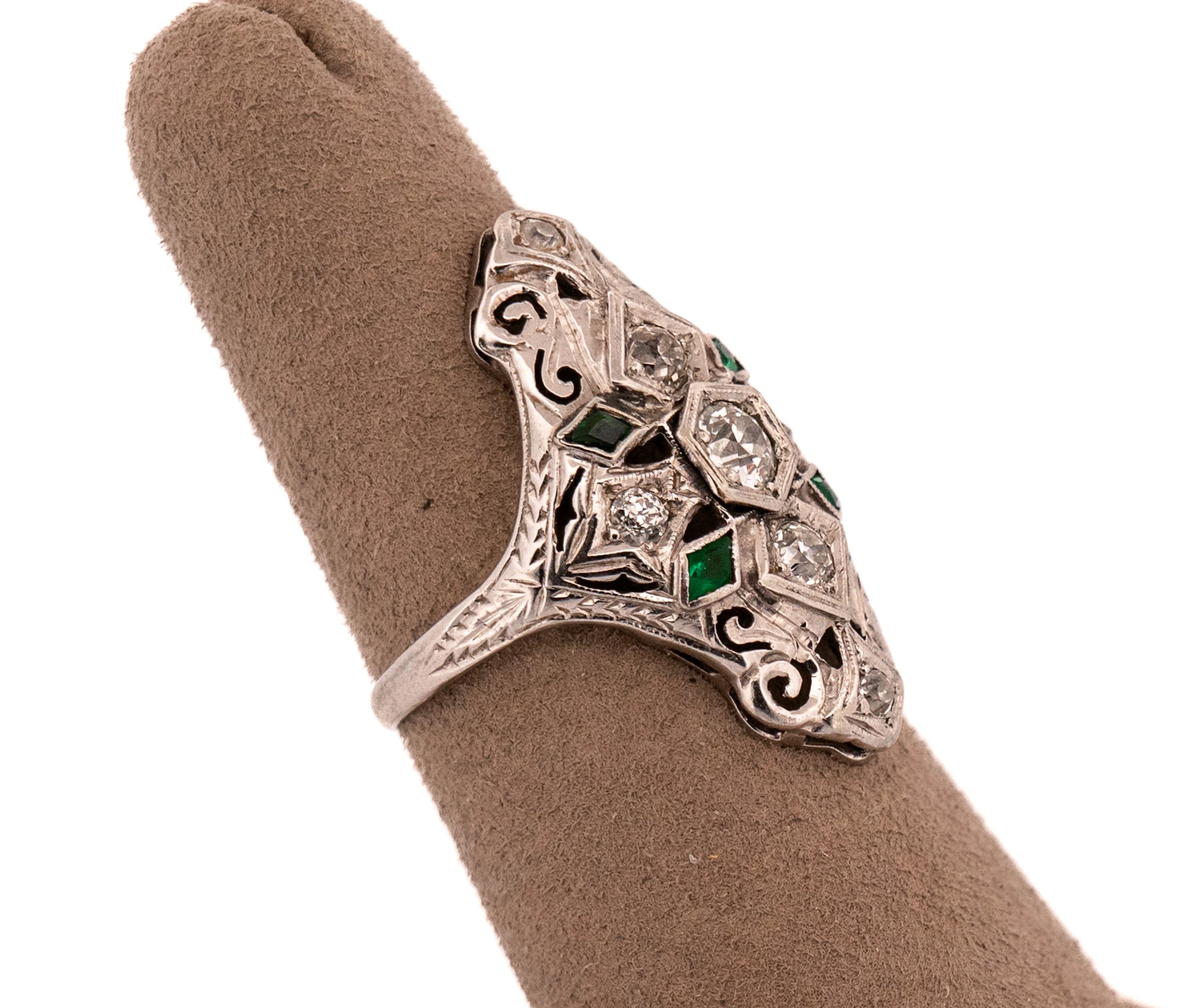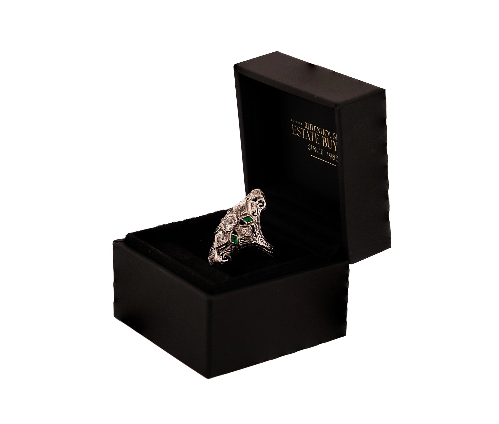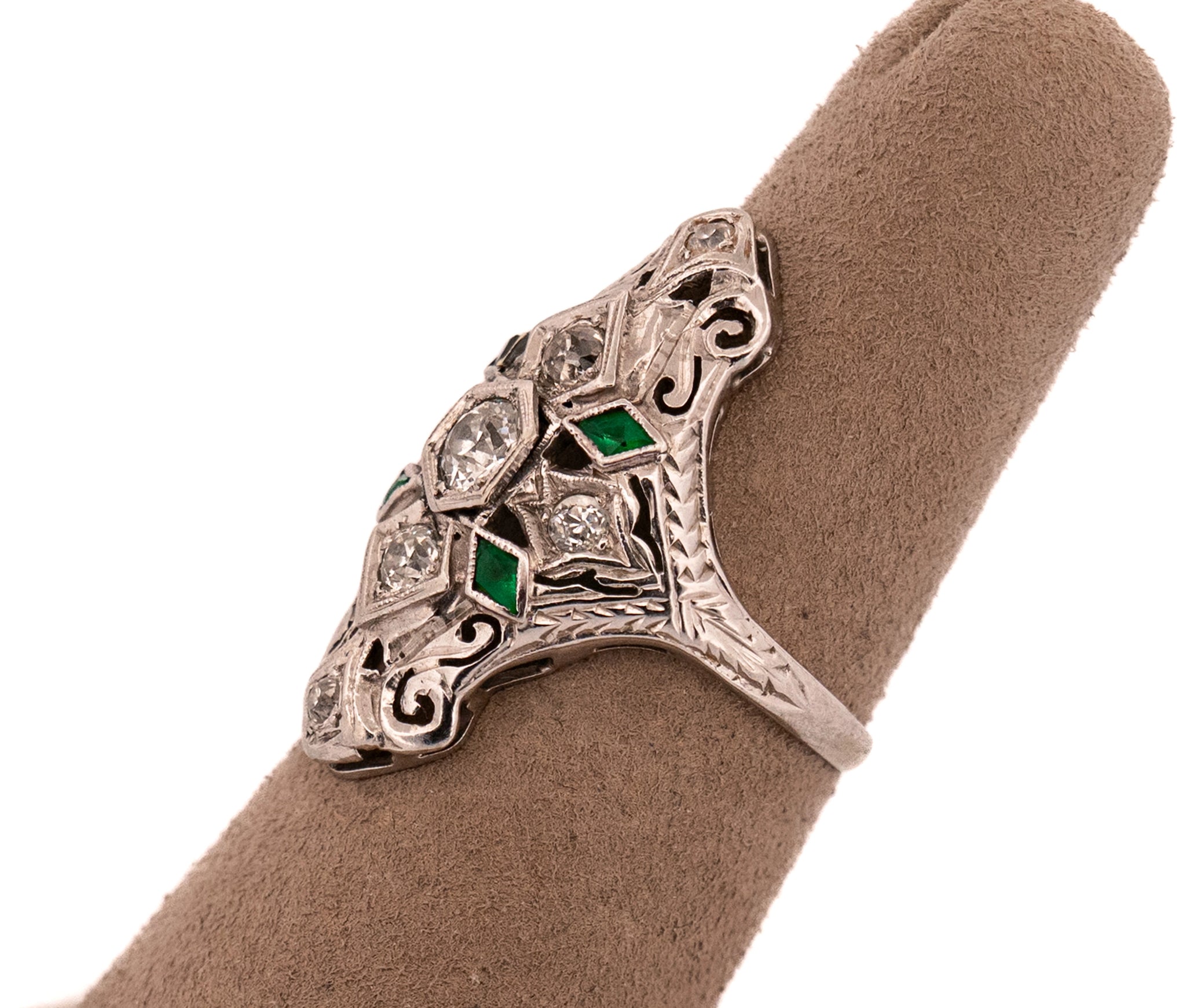 This elegant antique ring is crafted in 18K white gold and features a striking combination of diamonds and green stones. Set with 7 round brilliant diamonds totaling approximately 0.60 carats, the stones are graded G–I in color and VS2–SI1 in clarity, offering a bright and lively sparkle. Accented by richly hued kite shape green stones, the design creates a beautiful contrast and vintage flair. Sized at 5.25 and weighing 2.5 dwt, this ring is a graceful blend of classic elegance and timeless charm—perfect for collectors or those who love unique antique jewelry.