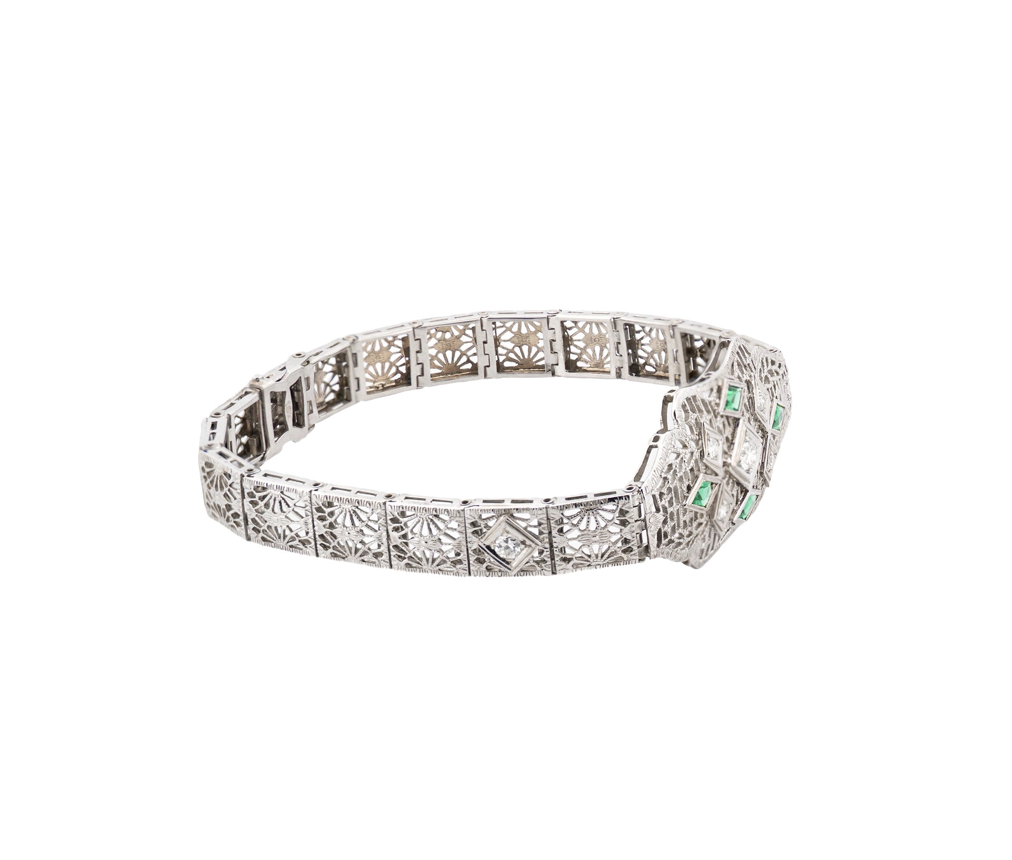 Crafted in Antique 18K and 14K White Gold, this elegant bracelet features 0.65 carats of brilliant diamonds in transitional and single cuts, offering a refined sparkle. The 7 diamonds, with I-J color and SI1-VS2 clarity, are paired with 4 striking green glass gemstones. Rectangular in shape, the green glass adds a bold vintage touch. At 6.5 inches long and 10.8 dwt in weight, it’s a timeless piece full of character and charm.