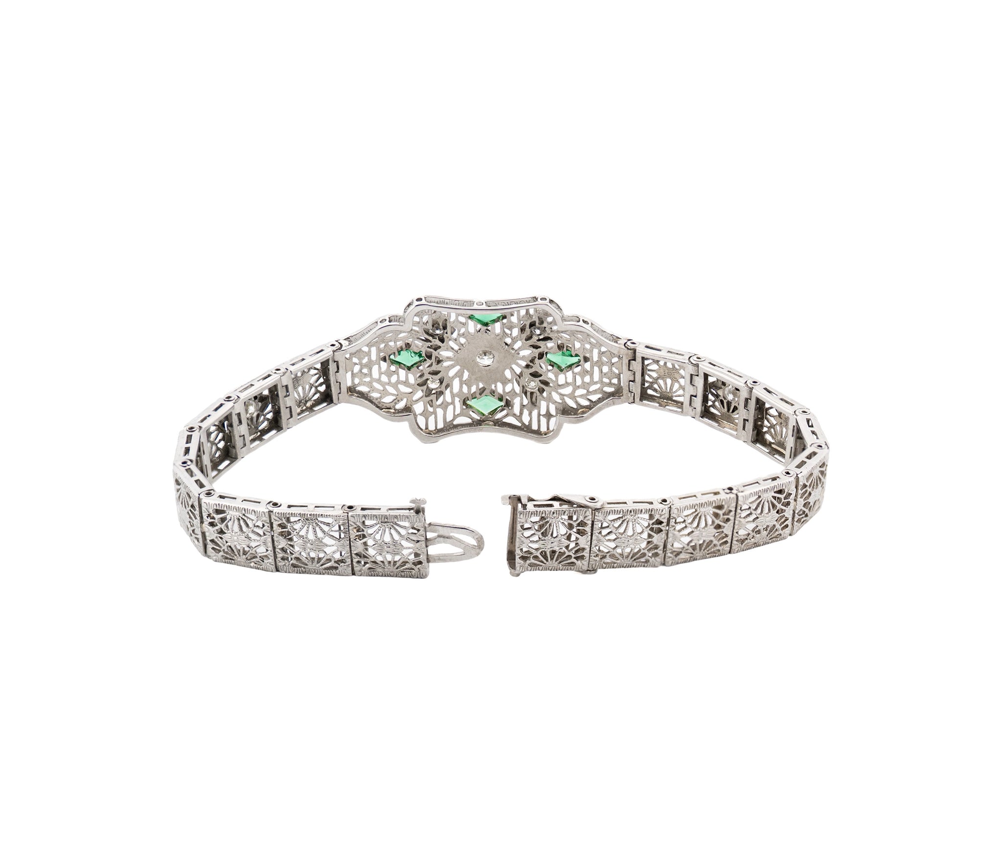 Antique 18K White Gold 0.65Ct Diamond and Green Glass Bracelet