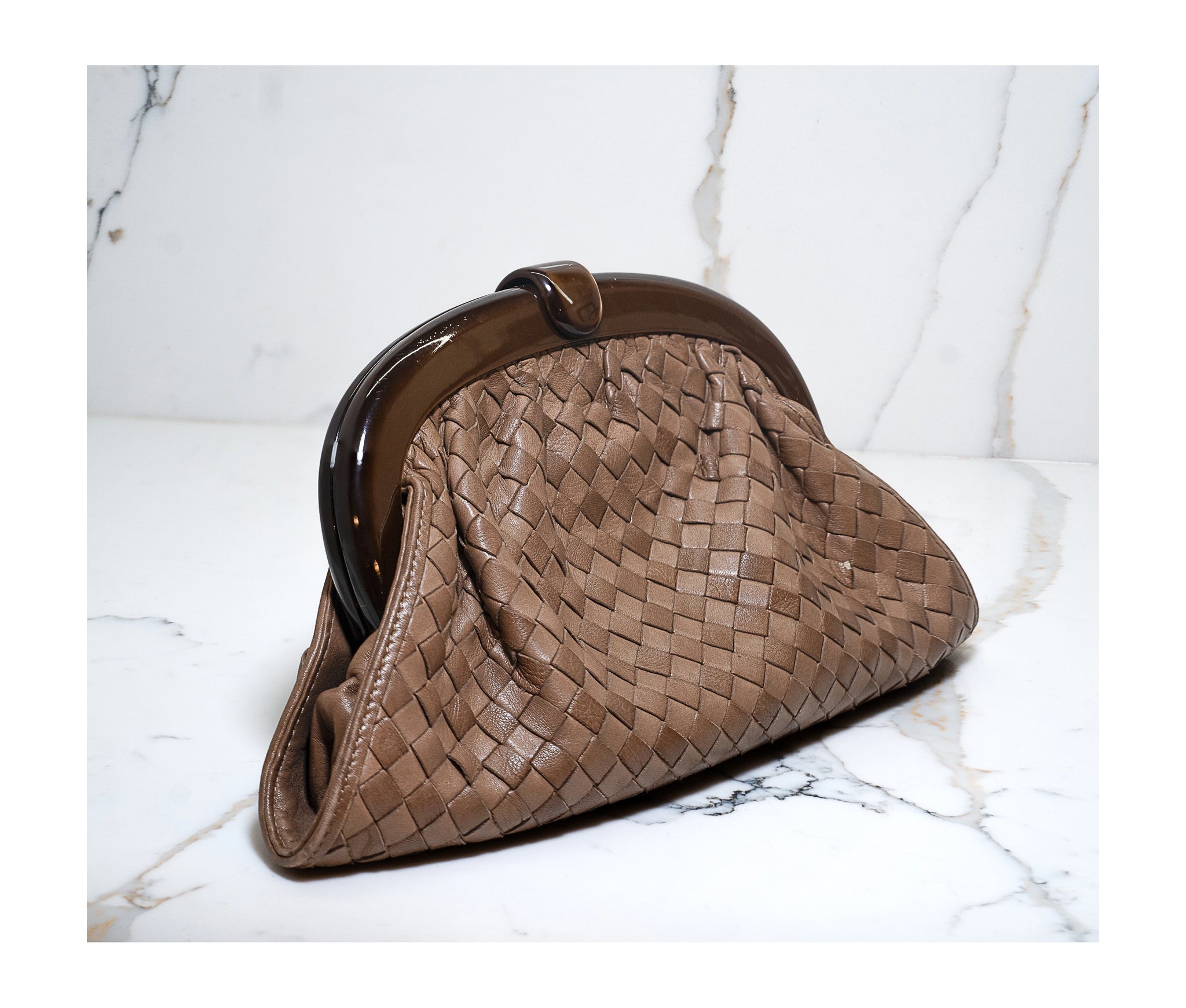 Shop this authentic Bottega Veneta Lauren 1980 clutch, crafted from the brand’s iconic Intrecciato woven leather and finished with a distinctive tortoise lucite top frame. This luxury designer clutch features a structured silhouette and elegant frame closure, making it the perfect accessory for evening events, special occasions, or elevated everyday style.