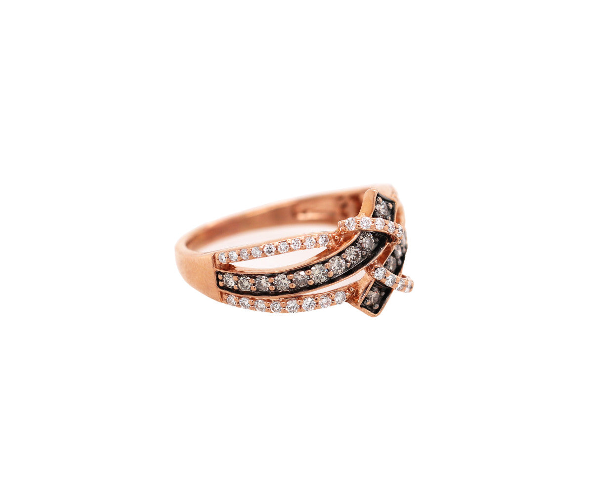 The ring often highlights a cluster of these exquisite chocolate diamonds, possibly set in a swirling or ornate pattern that enhances its elegance and visual appeal. The gold band may be accented with additional white diamonds or intricate detailing, adding to the overall glamour of the piece.