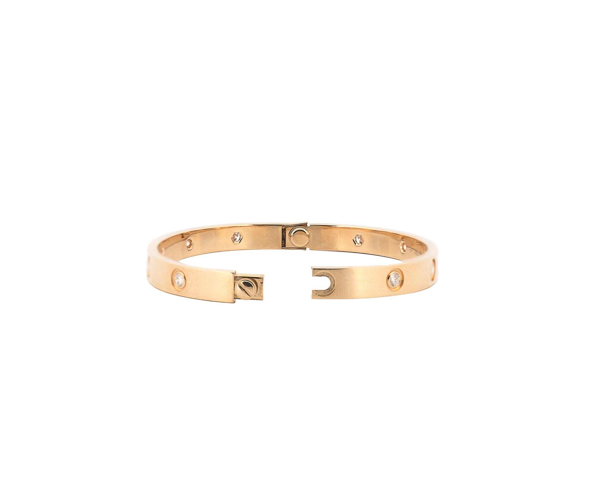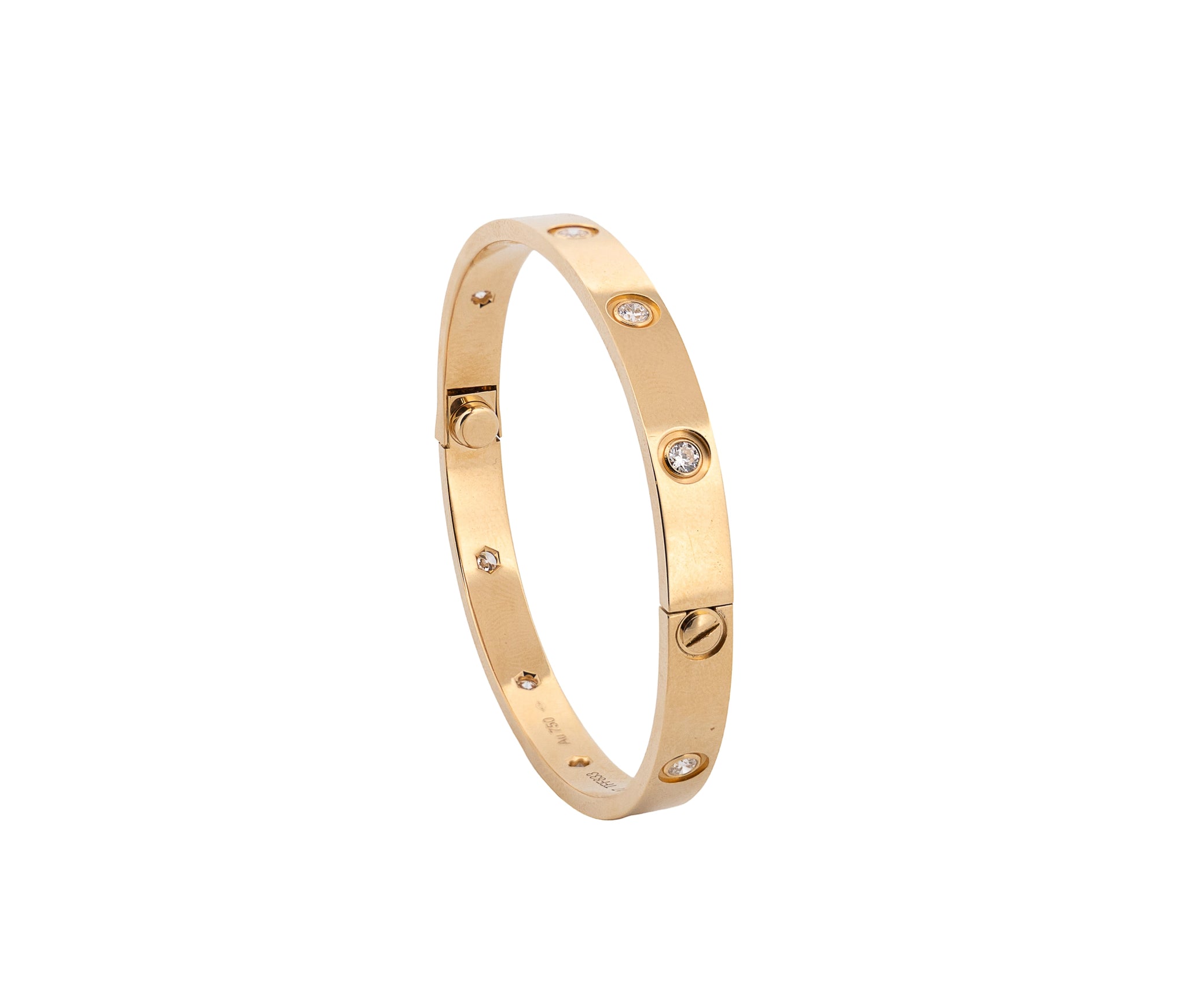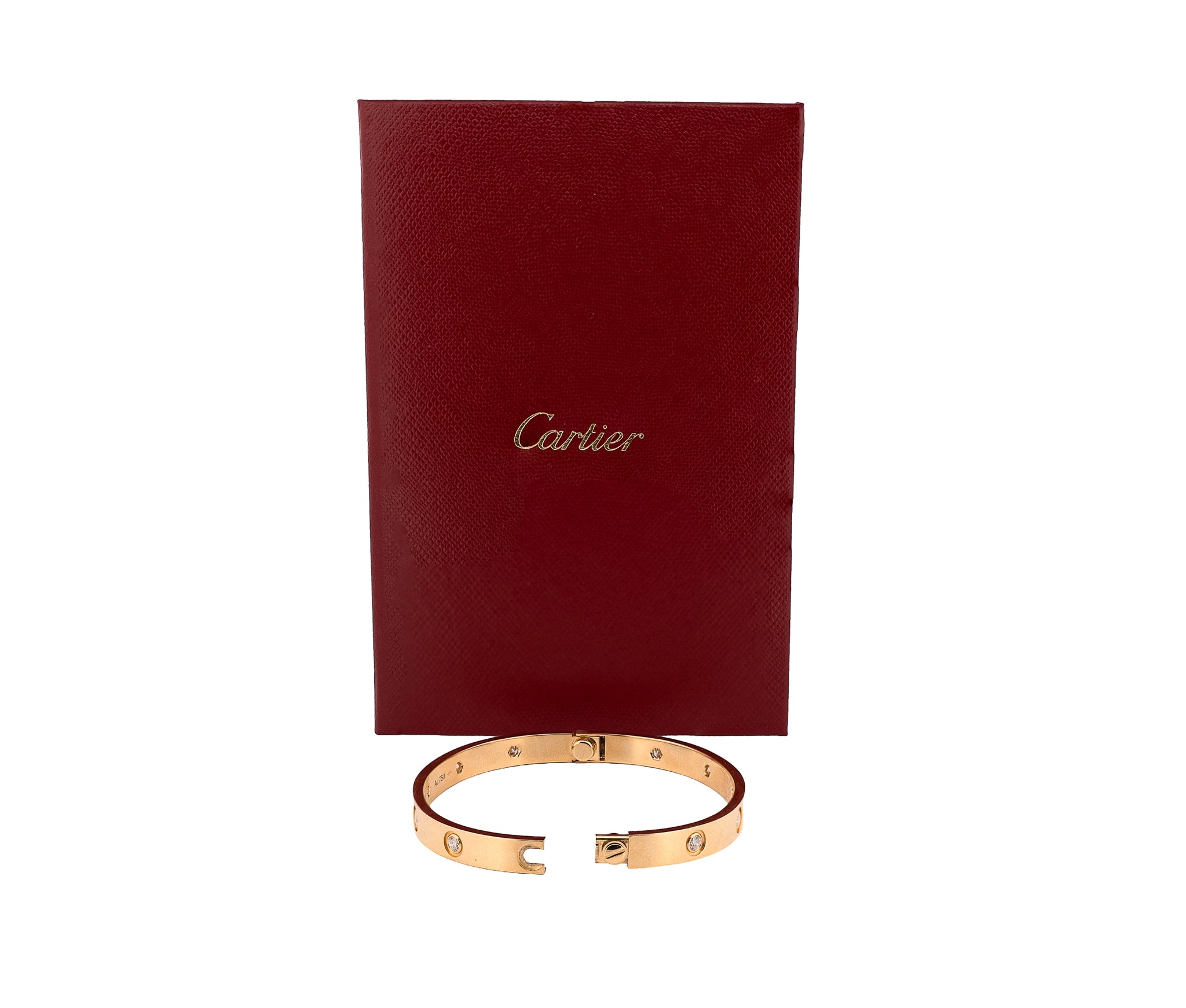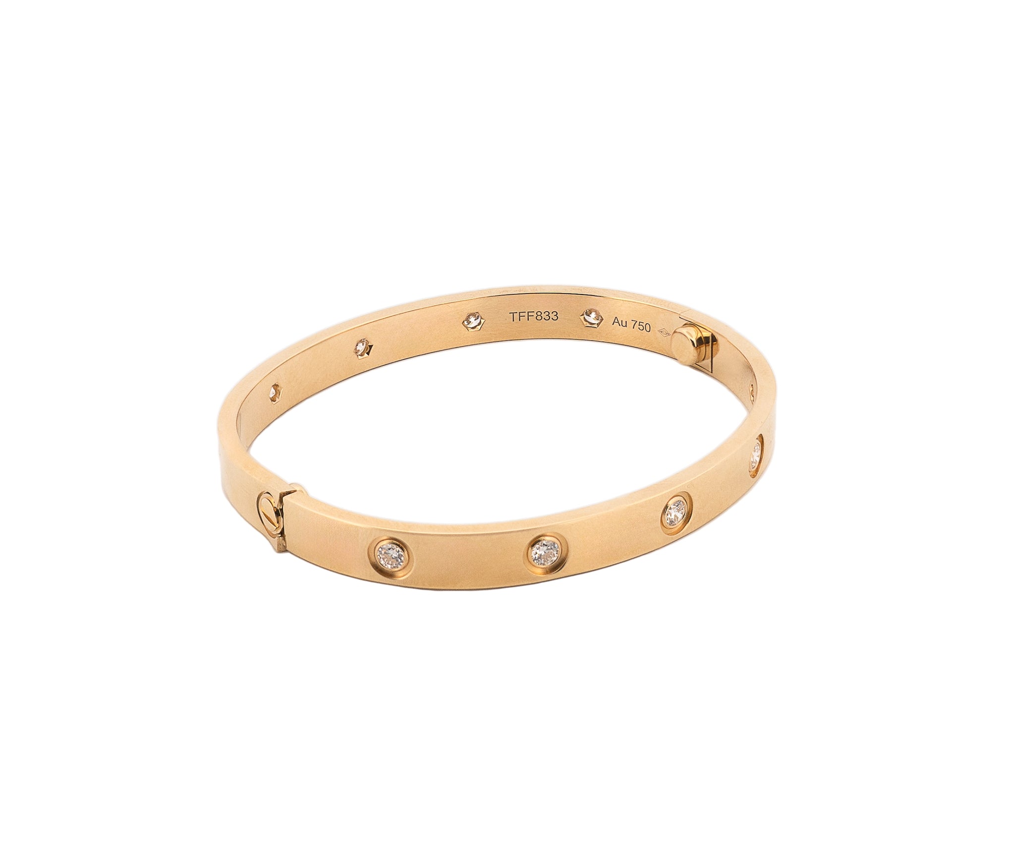 Crafted in luxurious 18K yellow gold, the Cartier Love Bracelet is an iconic symbol of timeless elegance and commitment. This Size 17 bracelet features 10 brilliant-cut diamonds totaling approximately 0.96 carats, each set between the signature screw motifs that define the Love collection. Designed to be secured with a special screwdriver, this piece is both a bold fashion statement and a lasting emblem of love. Perfect for stacking or wearing solo, it embodies Cartier’s legacy of sophistication and romance.