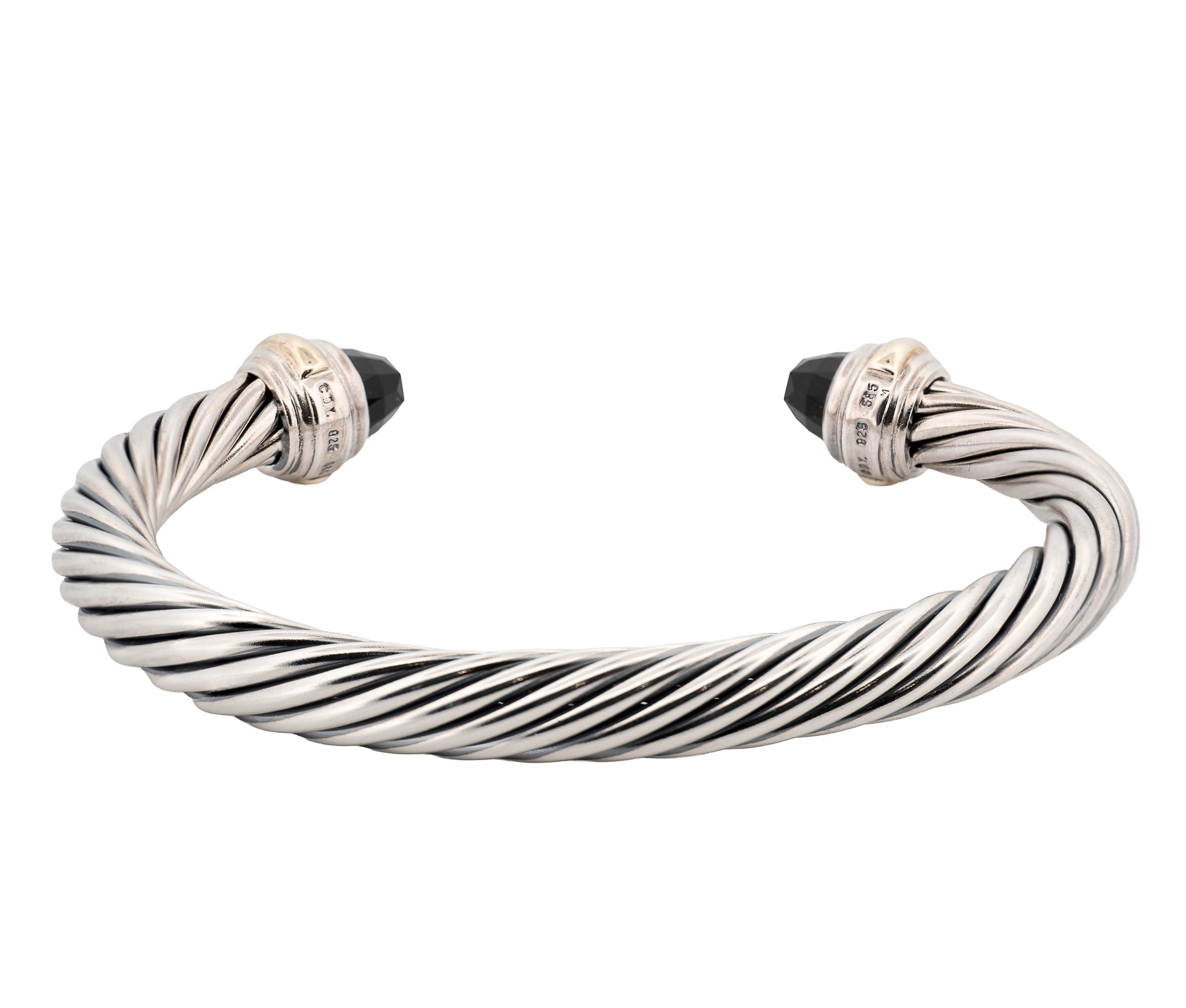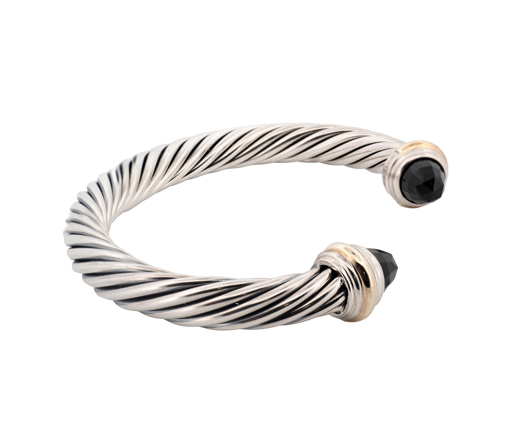 Exude timeless sophistication with this striking cuff bracelet by David Yurman. Crafted with 14K gold and sterling silver, the bracelet features a bold black onyx stone, adding a dramatic yet elegant contrast to the signature cable design. Perfect for both casual and formal wear, this cuff makes a statement of refined luxury and modern style.