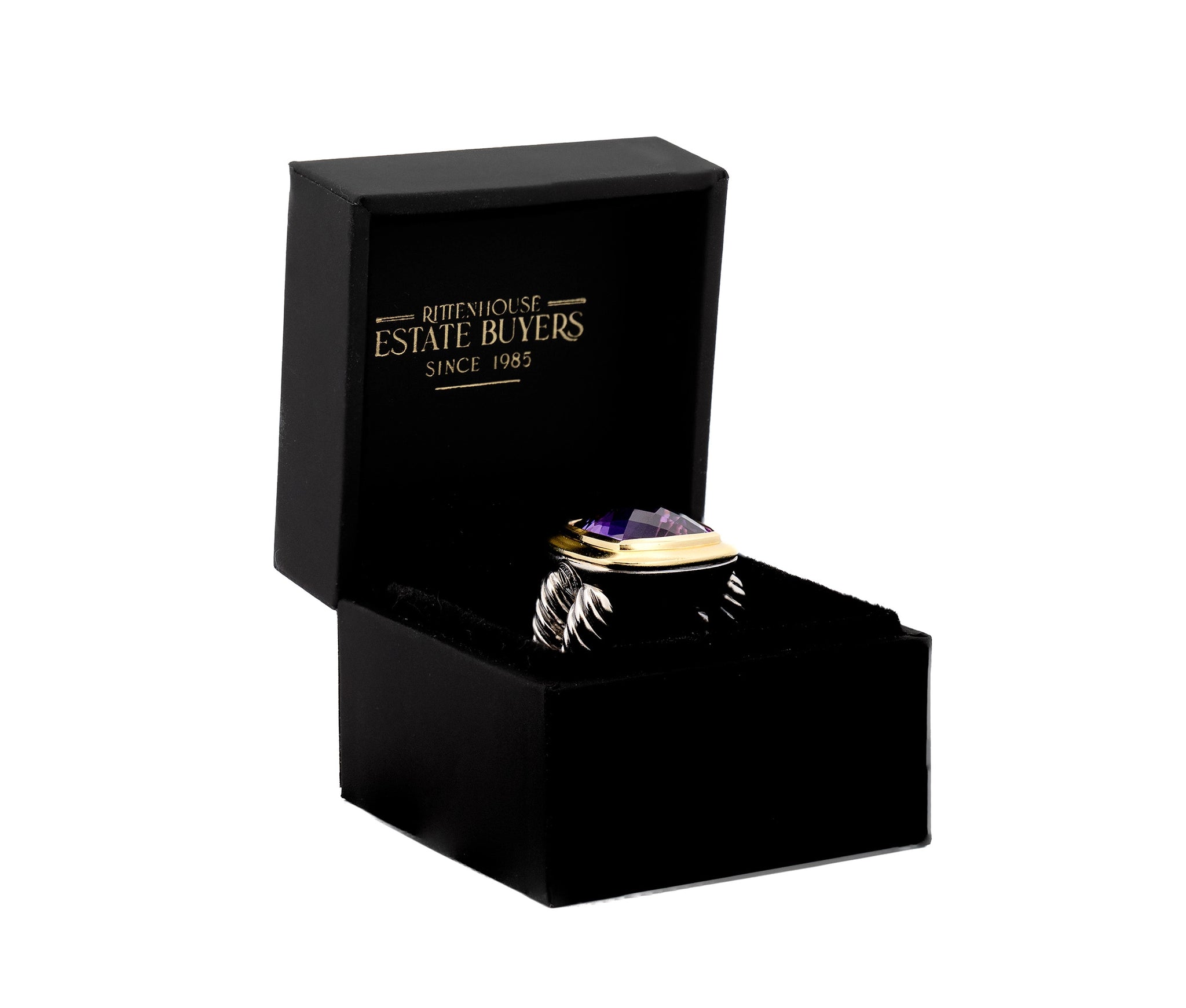 This David Yurman Albion Ring features a striking 15mm faceted amethyst set in sterling silver with 18K yellow gold accents. Sized at 7.5, and weighing 11.0 dwt, the ring showcases the iconic Albion design with its bold cushion-cut center stone and elegant mixed-metal setting. A timeless piece that blends vibrant color with classic sophistication, perfect for everyday elegance or special occasions.