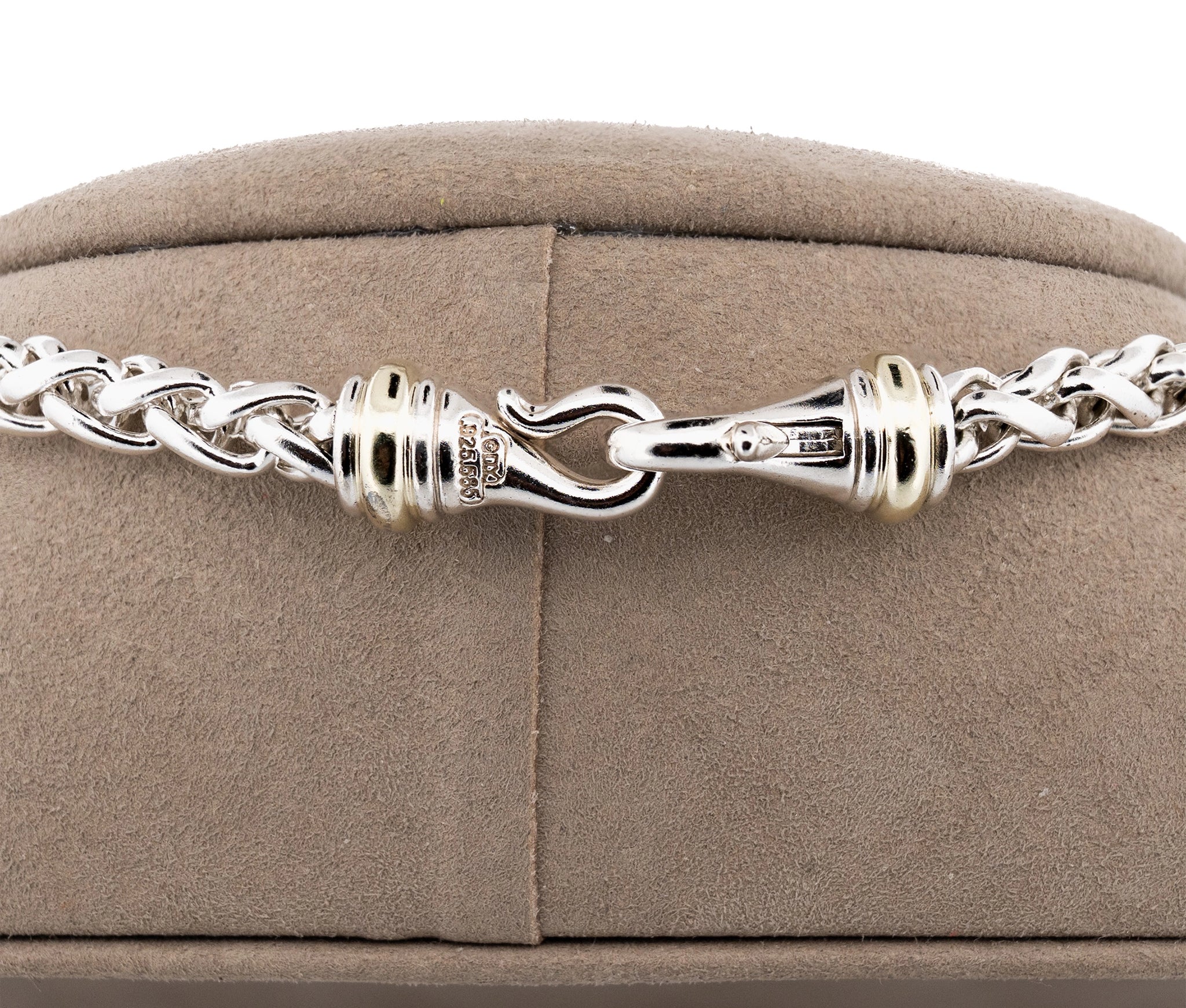 This David Yurman Albion Pendant features a bold 15mm cushion-cut onyx center stone, framed by 42 sparkling diamonds totaling approximately 0.20 carats. Set in sterling silver with 14K yellow gold accents, the pendant hangs gracefully from a 5.8mm 17 inch wheat chain. With a total weight of 37.1dwt this necklace is a striking blend of elegance, edge, and refined luxury.